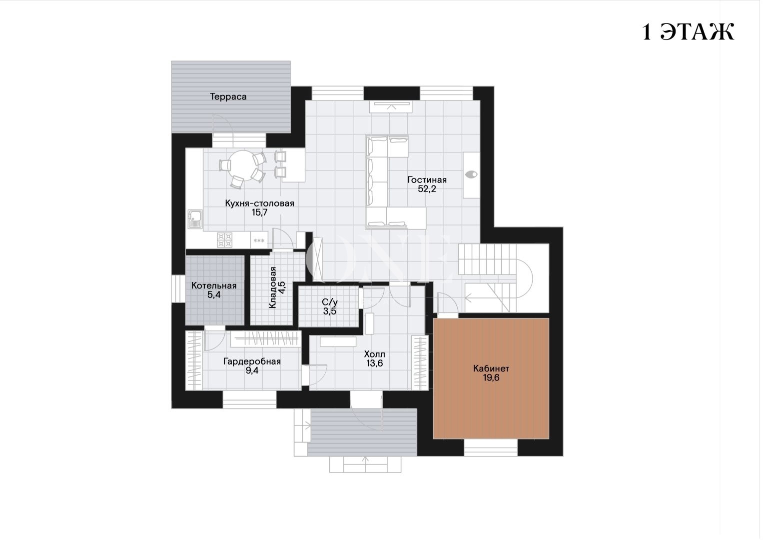 гостиная с выходом на террасу — удобно для отдыха и приема гостей, кухня-столовая, кабинет (можно использовать как гостиную или спальню), санузел с душевой, сезонная гардеробная, бойлерная и кладовая — всё хозяйственное вынесено из жилых зон.