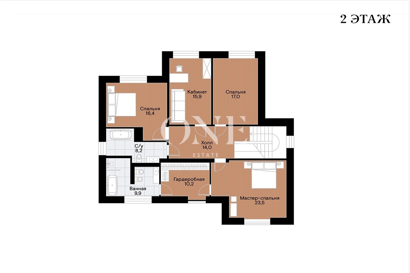 мастер-спальня с гардеробной и ванной, 2 спальни, общий санузел. Планировка логичная, без лишних коридоров и «мертвых» зон.