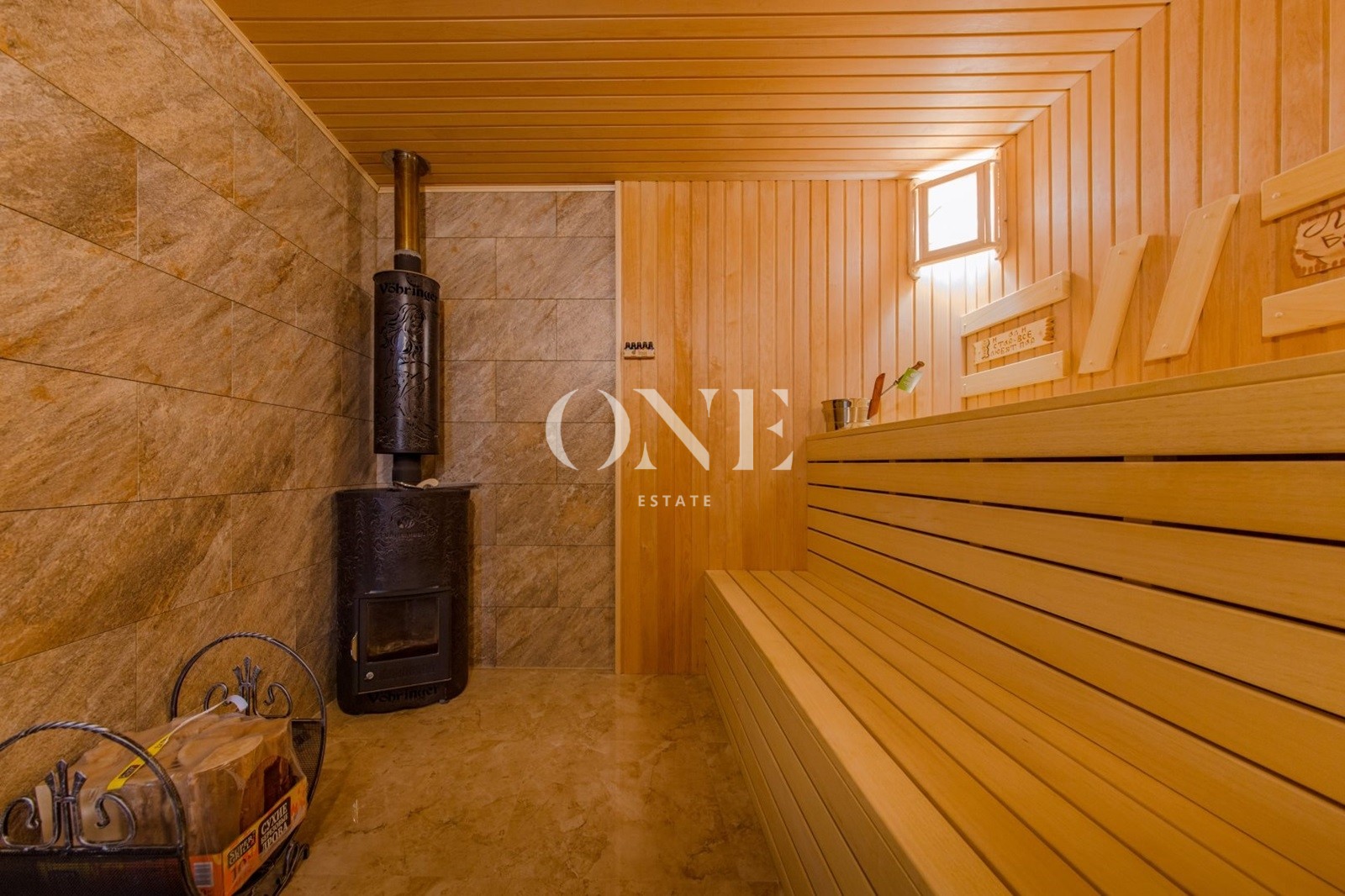 Прихожая с гардеробной, кухня-столовая, гостиная, 2 мастер-спальни с гардеробными и ванными комнатами, 2 спальни, 2 с/у, комната отдыха, сауна, постирочная, котельная, гараж на 2 м/м.