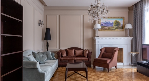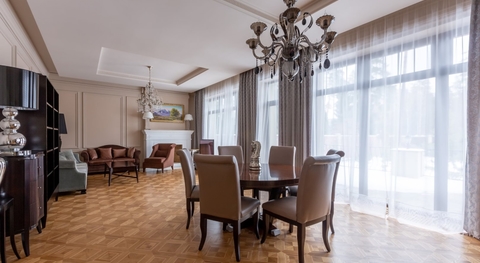 1 этаж: прихожая, гостиная с камином, столовая для приемов, кухня-столовая, диванная зона с телевизором с выходом на террасу.
