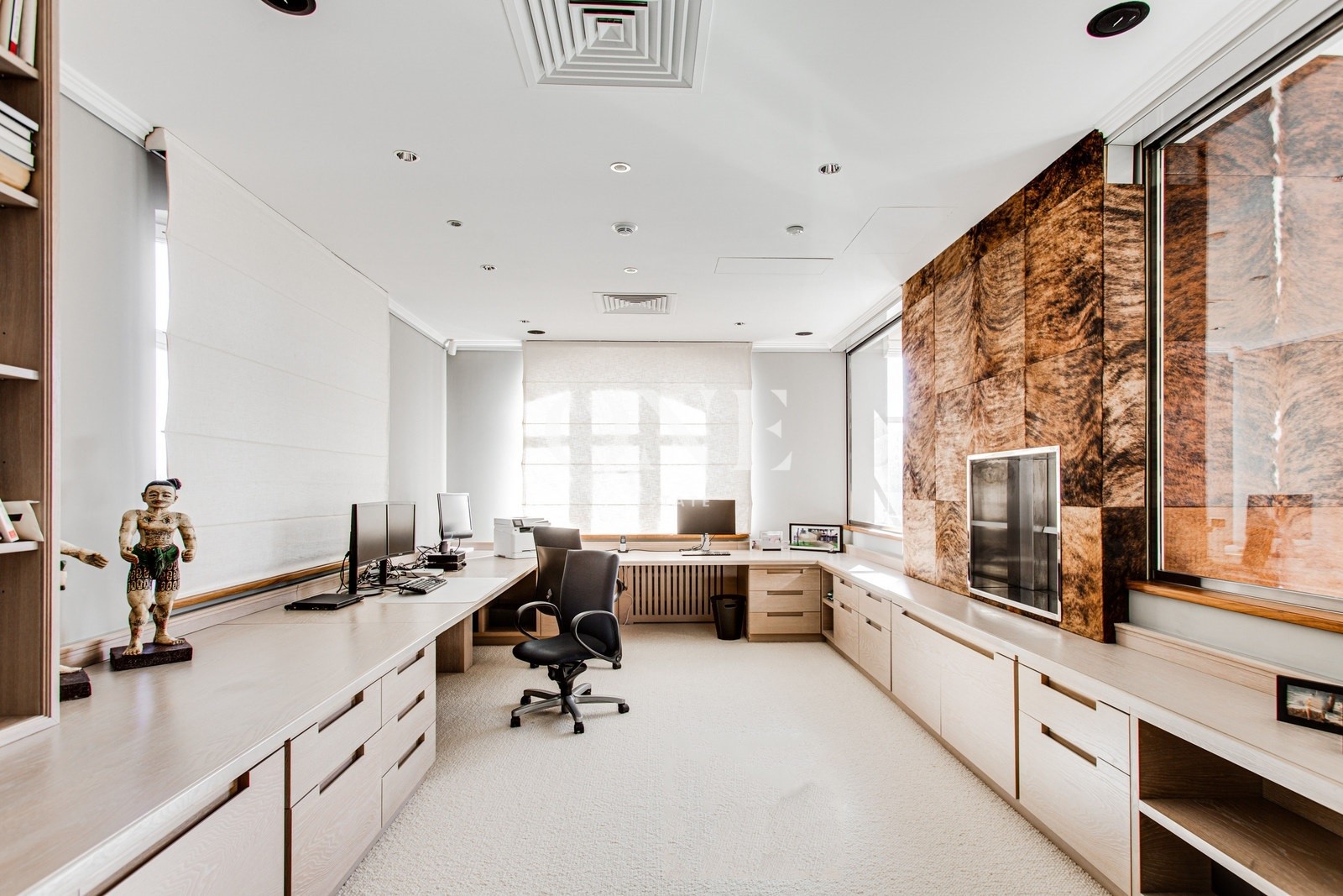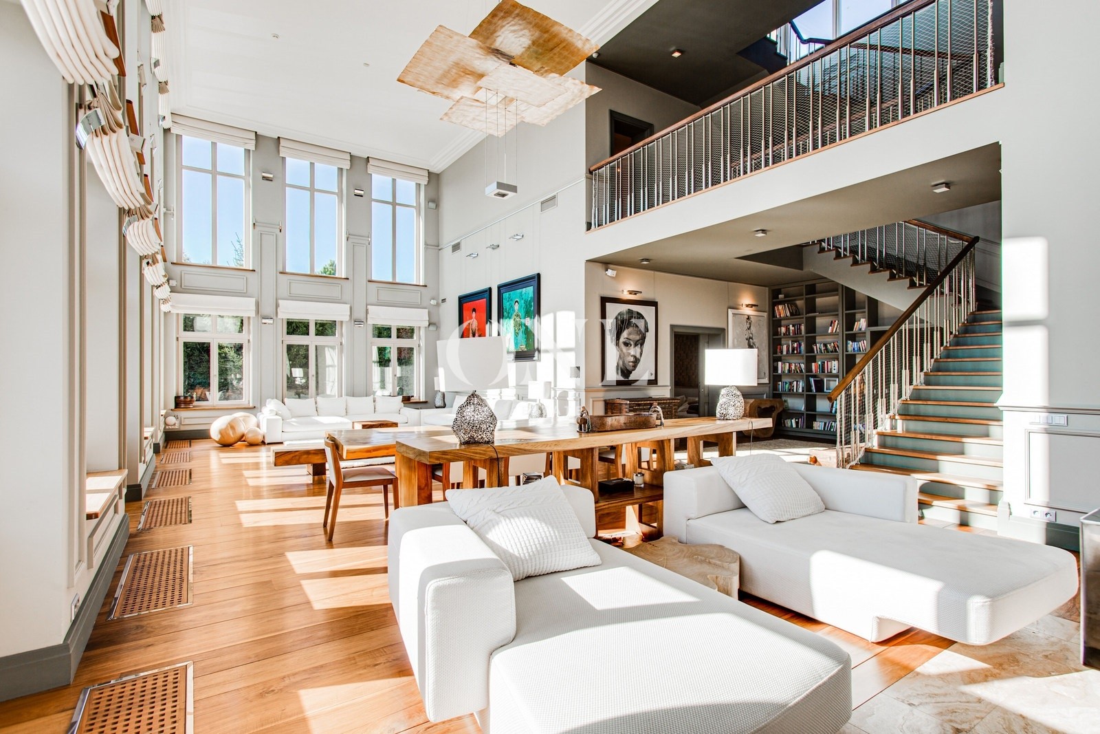 Четырехуровневый особняк выполнен в современном стиле. Дизайн интерьера отличается лаконизмом и функциональностью. Четкие прямые линии и светлые тона гармонизируют пространство и наполняют дом светом. В отделке использованы высококачественные материалы, в частности, пол выполнен из американского ореха. Уникальным украшением гостиной является авторский 7-метровый камин. В особняке установлена система «умный дом».