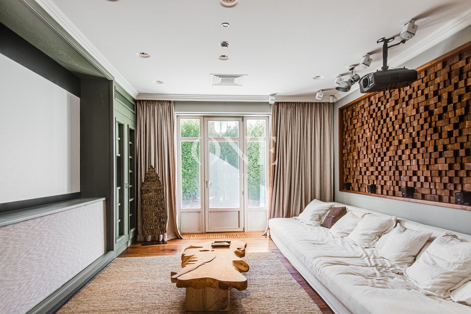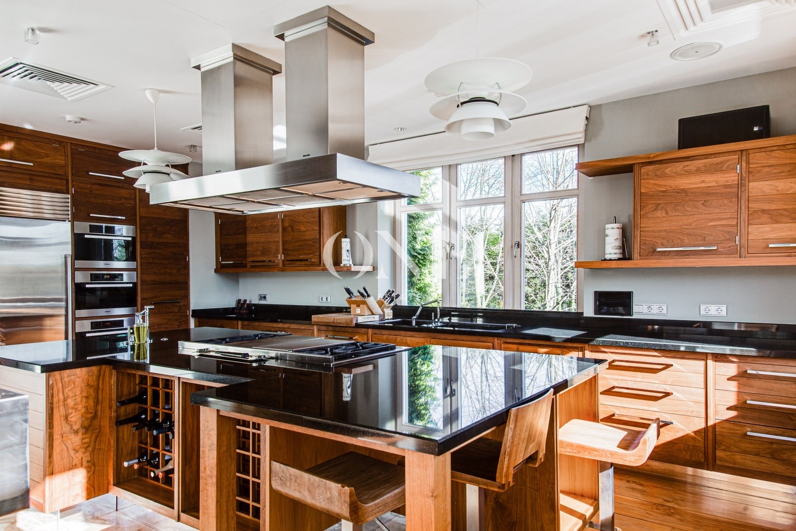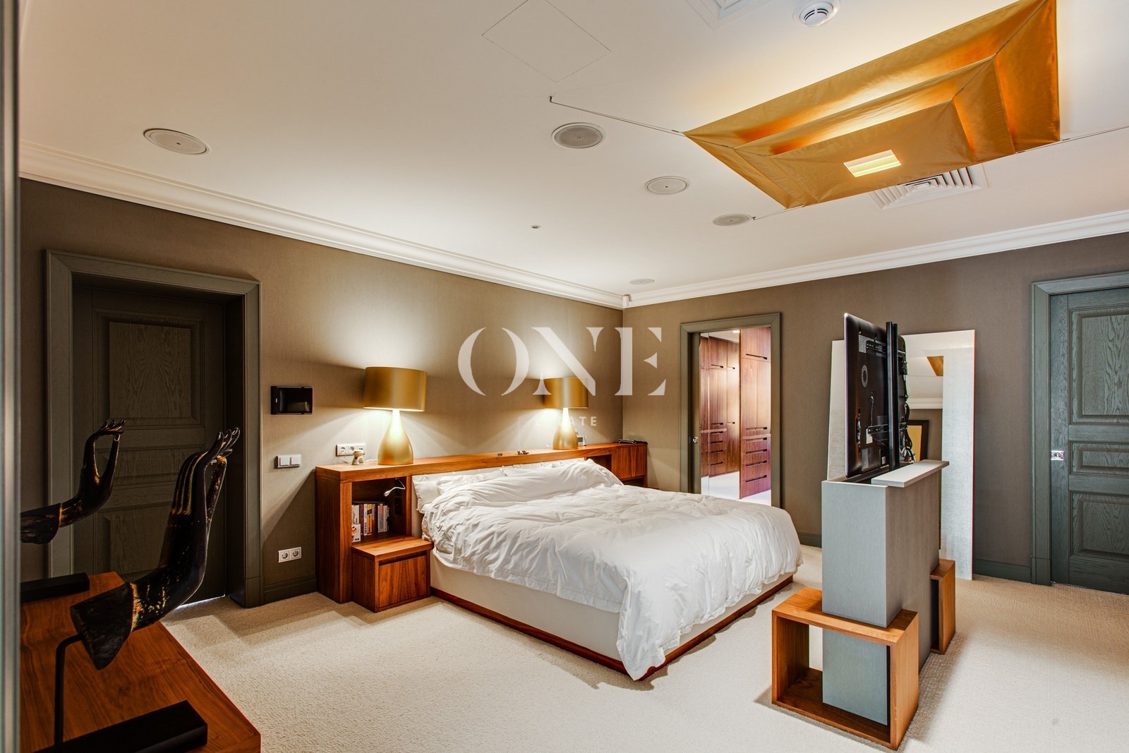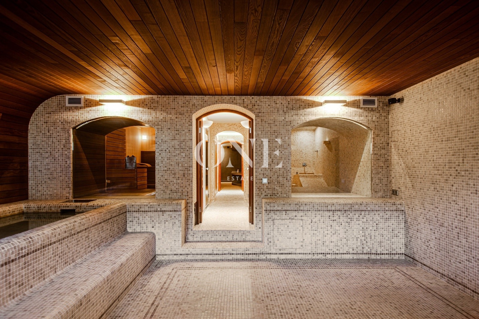 встроенный лифт для подачи еды с кухни, профессиональный домашний кинотеатр, каминная зона, с авторским 7-ми метровым камином, столовая, кухня (Miele), комната с с/у, комната с гардеробной и с/у;
