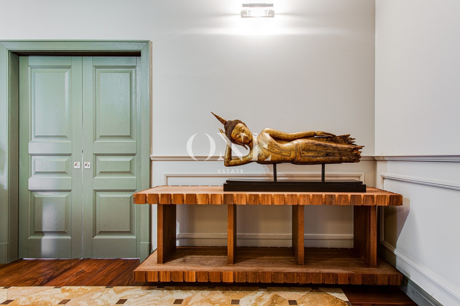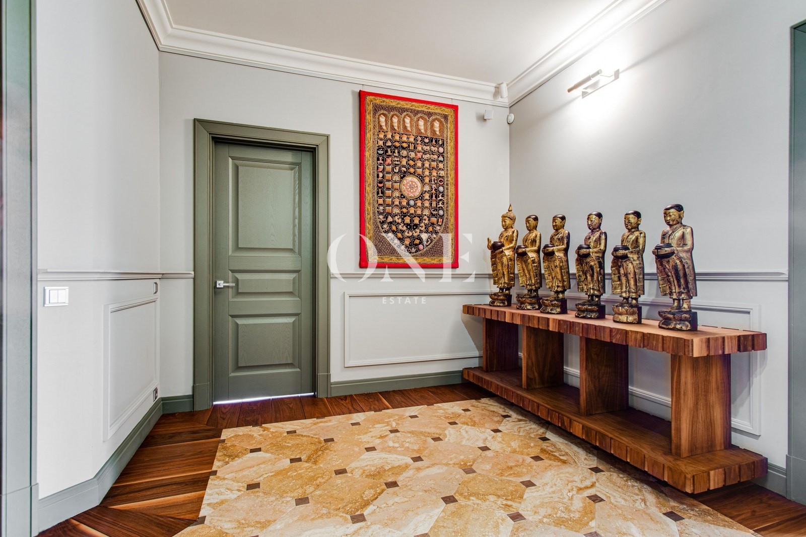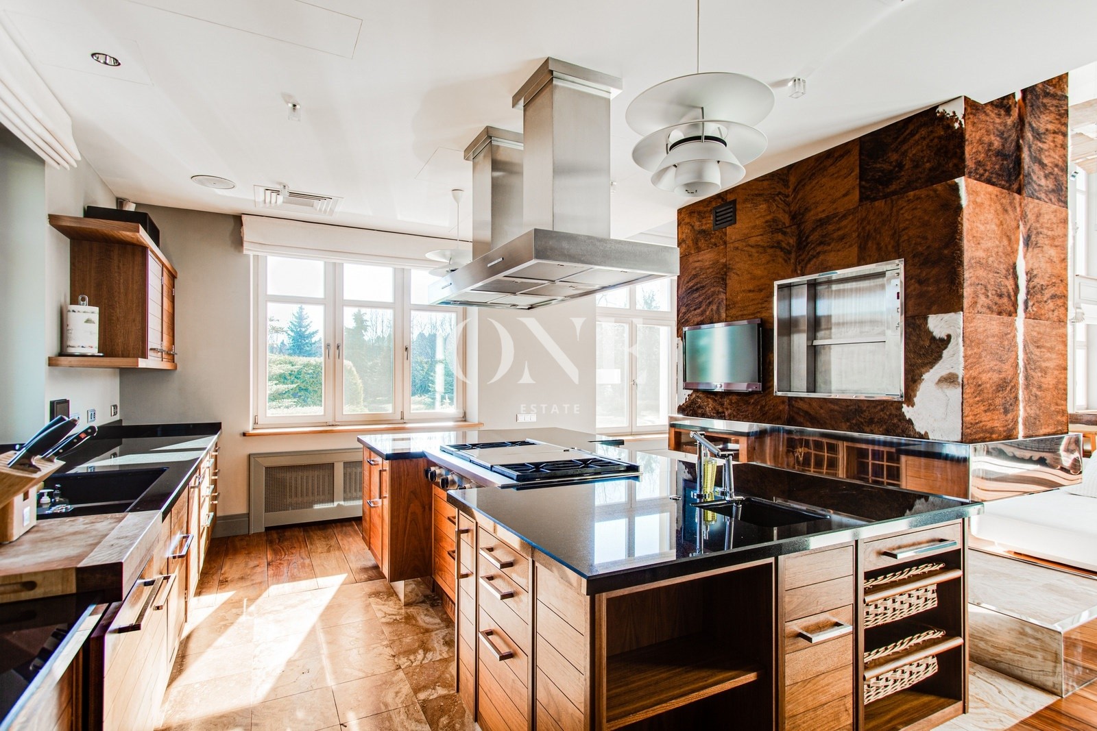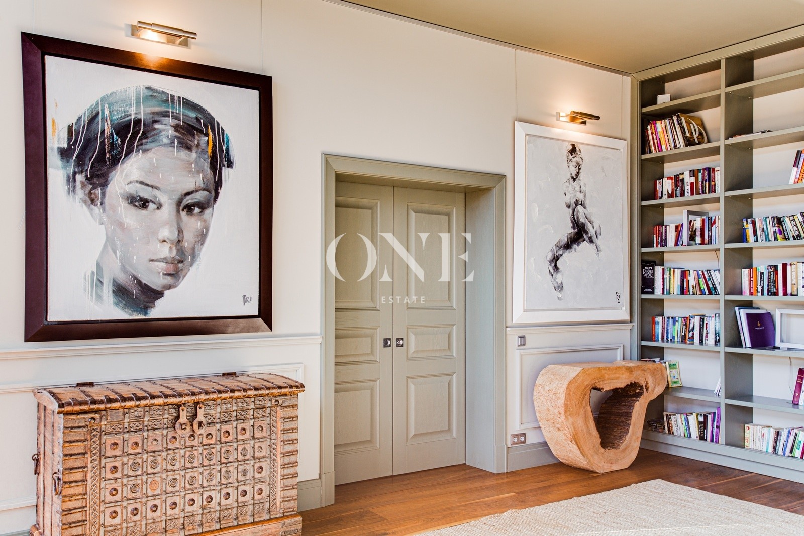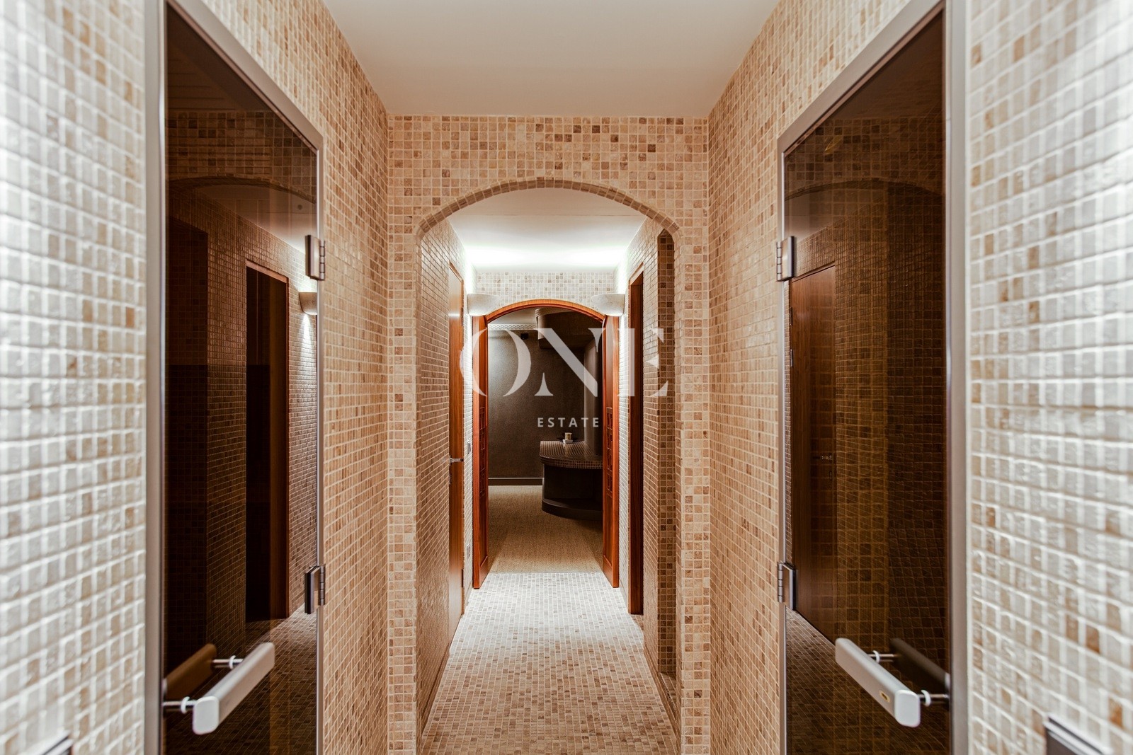 встроенный лифт для подачи еды с кухни, профессиональный домашний кинотеатр, каминная зона, с авторским 7-ми метровым камином, столовая, кухня (Miele), комната с с/у, комната с гардеробной и с/у;
