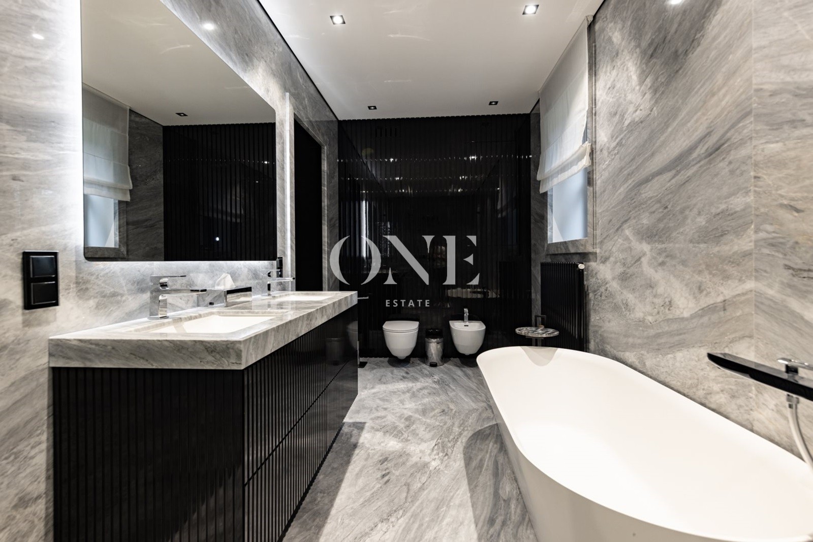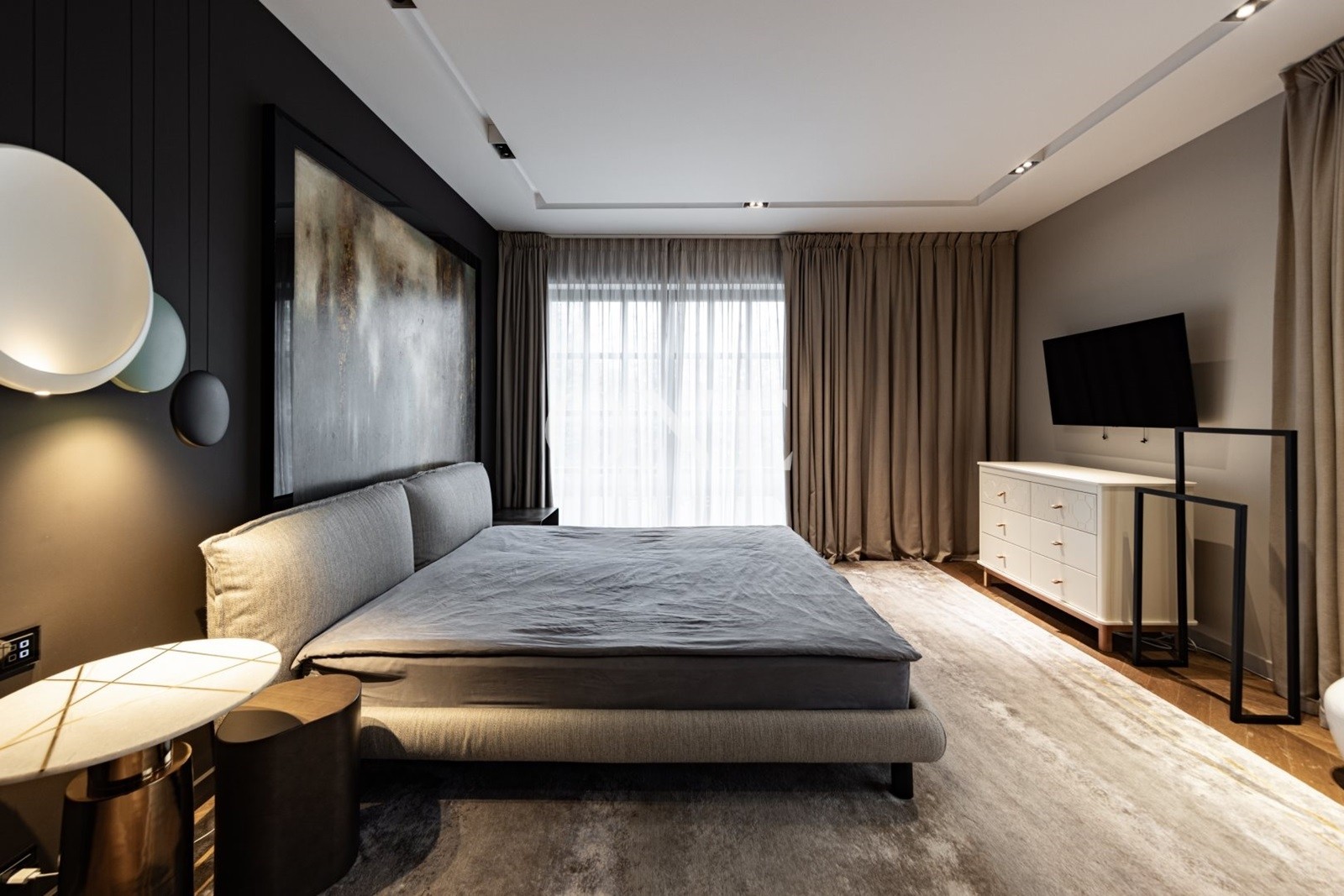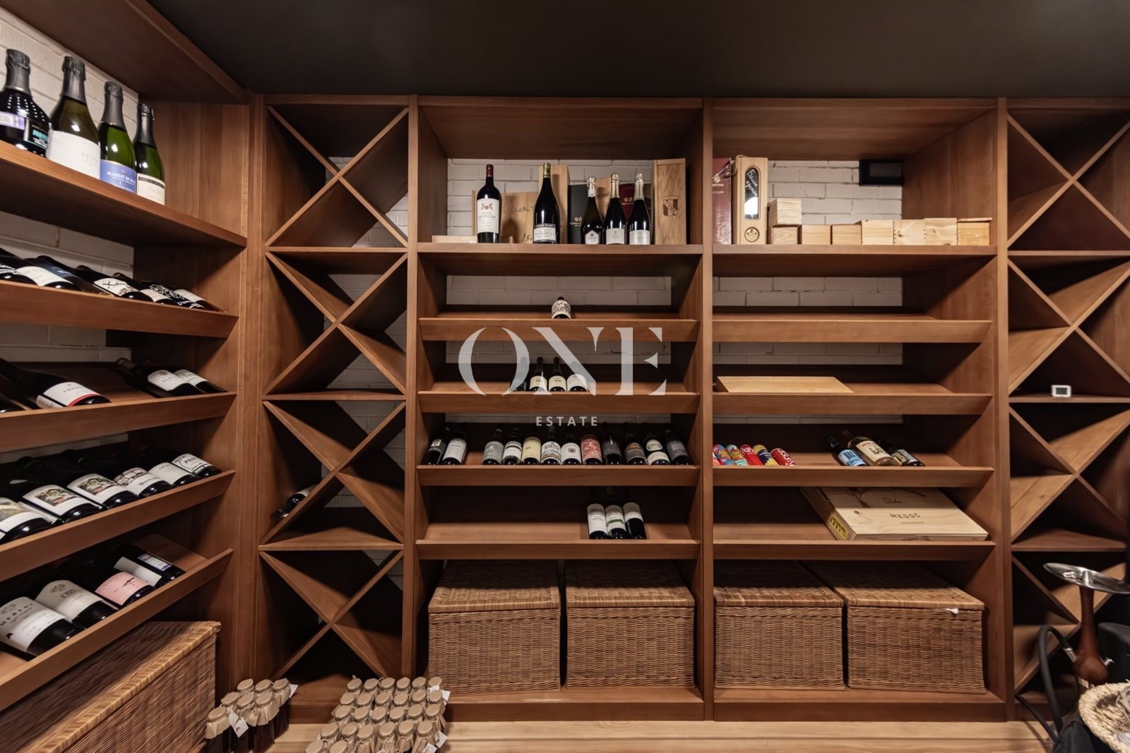 30м2, включает в себя тех помещение для хранения продуктов, а также винный погреб на 800 бутылок. Мебель винного погреба выполнена из ясеня с 2-мя винными холодильниками на 120 бутылок.