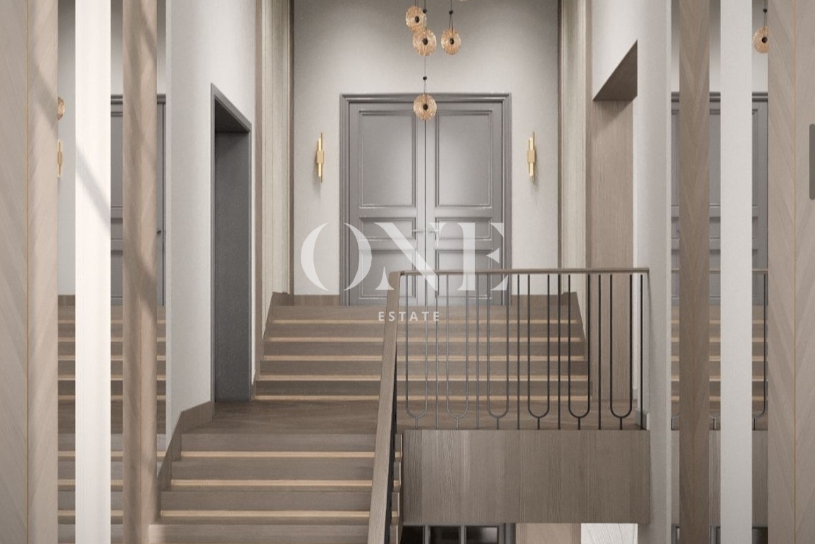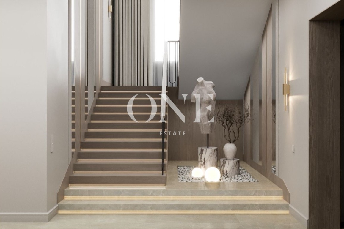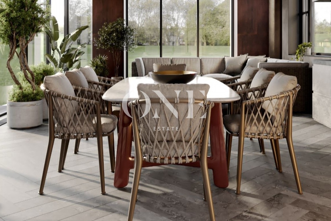 парадный холл, гардеробная, просторная гостиная, кухня и столовая, отдельная рабочая кухня, кабинет, кладовая, гостевой санузел. Отдельный блок для персонала: 3 спальни с санузлом.