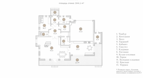 просторный зал с кухонной зоной и выходом на летнюю террасу и одна комната (кабинет/спальня) Из санузла на 1 этаже выход на террасу с летним душем.