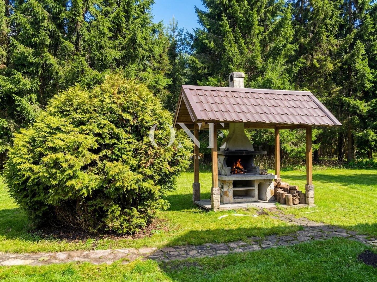 Внешняя инфраструктура участка включает: основное жилое строение, уютную беседку для отдыха на свежем воздухе, где можно устраивать семейные пикники и вечера у костра, а также вместительный гараж с навесом для автомобилей и хозяйственных нужд.