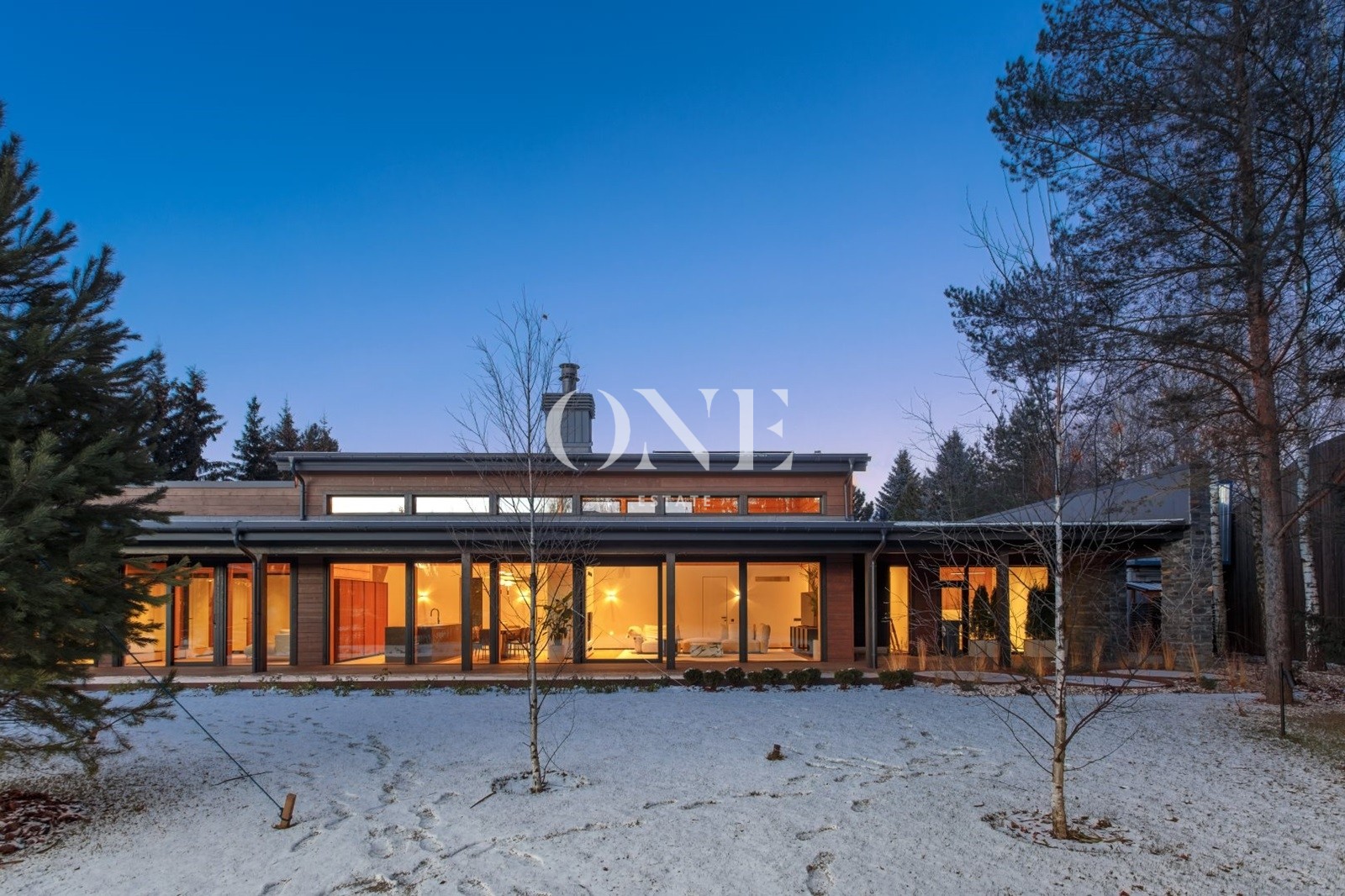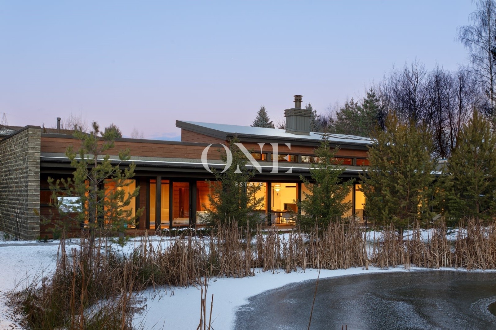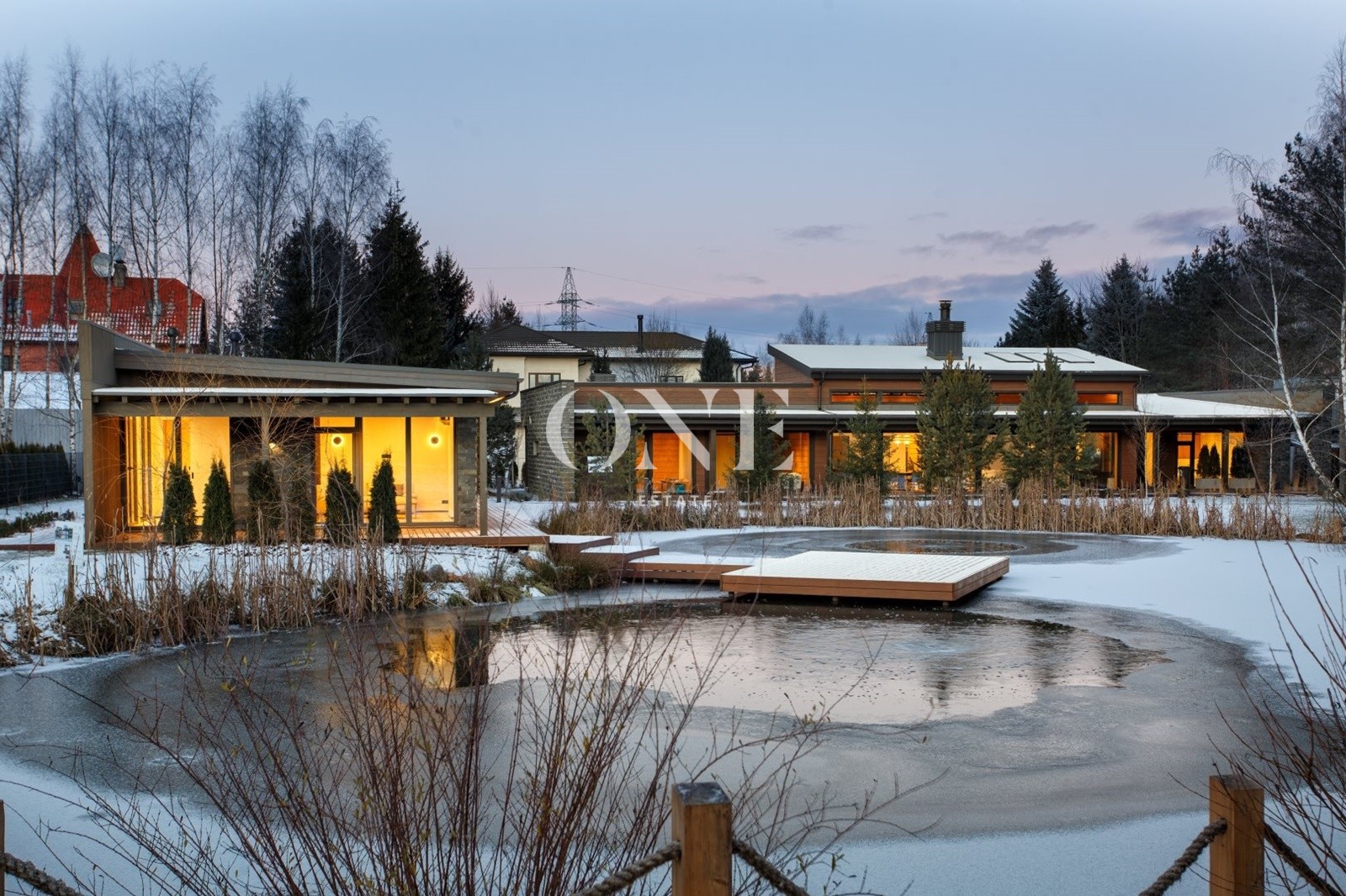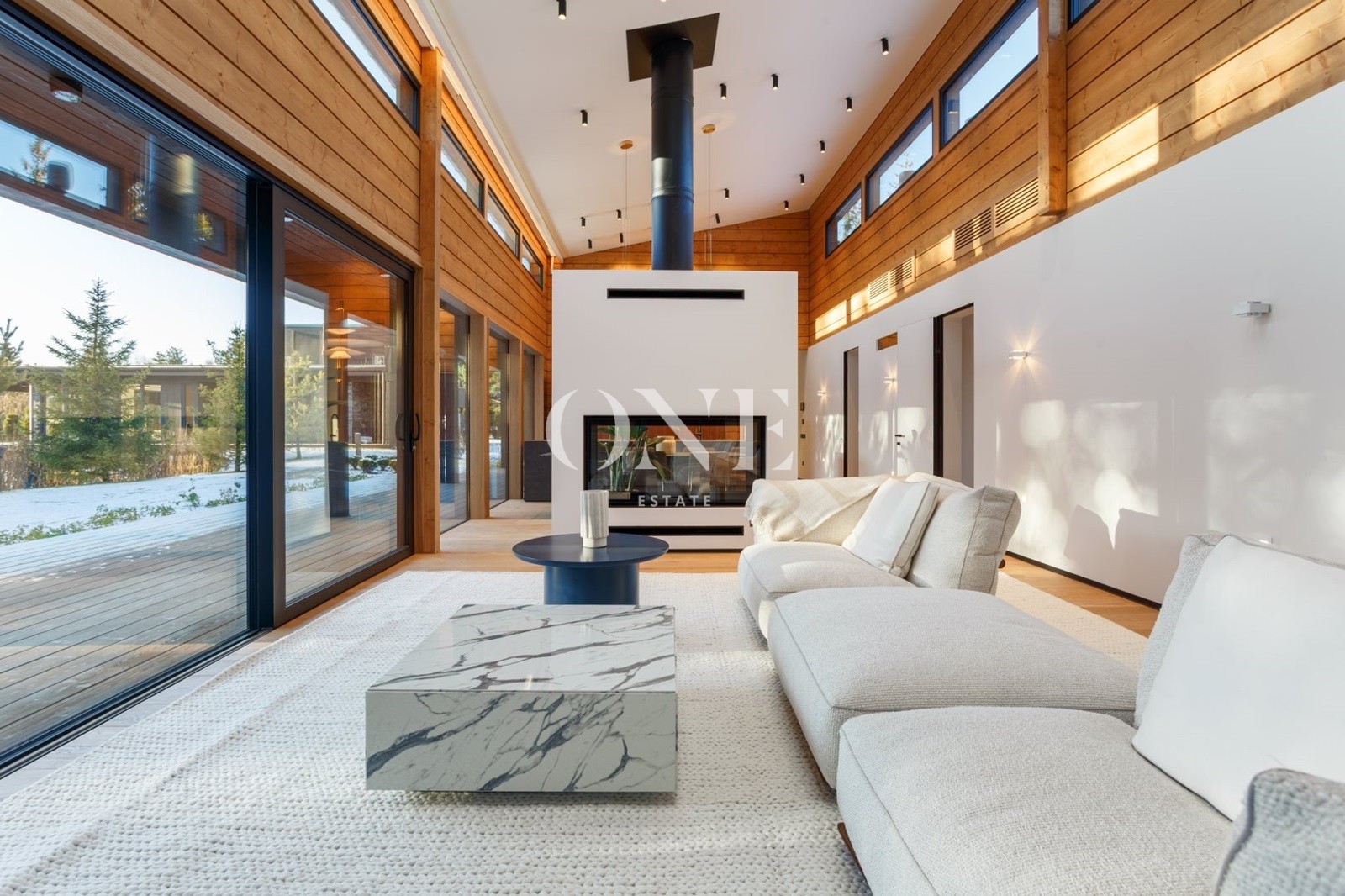 просторная двусветная гостиная с панорамным остеклением + с окнами в кровле, мастер-спальня с отдельным выходом на террасу, ванной комнатой и гардеробом, 3 спальни, одна из них может превратится в кабинет, кухня-столовая с двусторонним камином, гардеробная, тех помещение, с/у, комната для персонала.