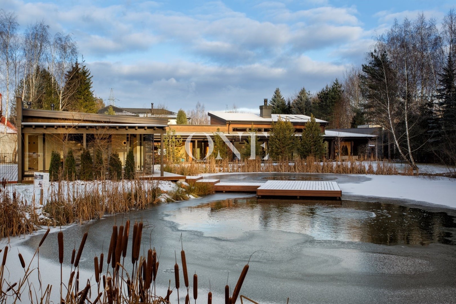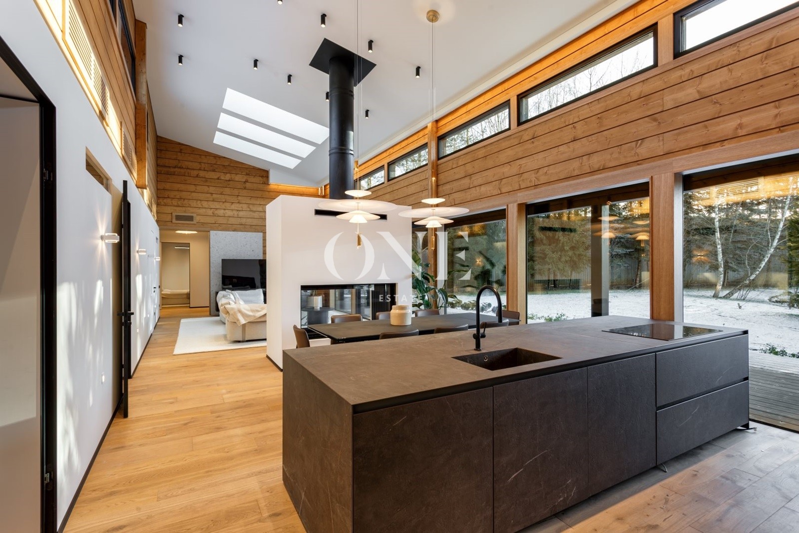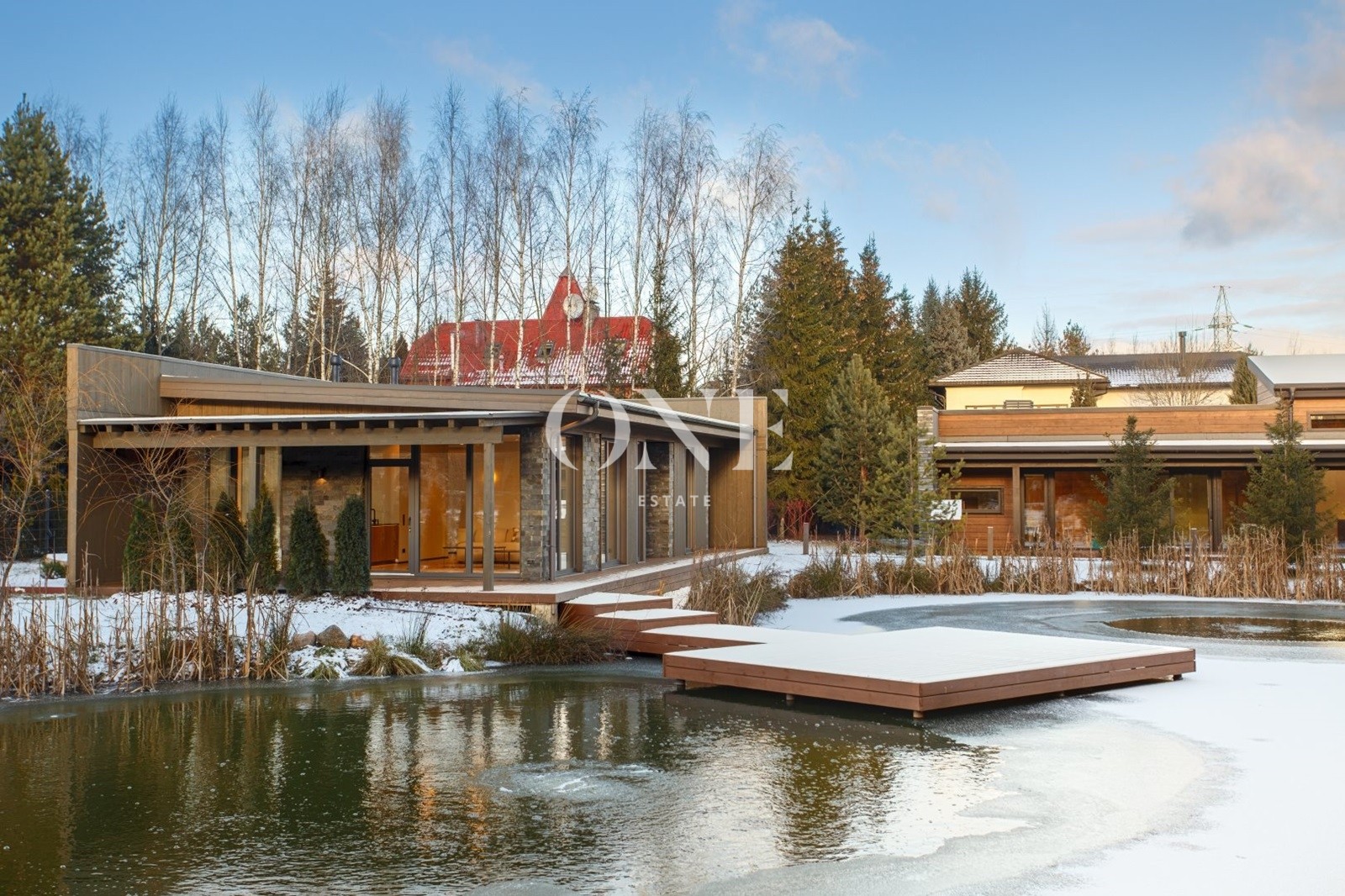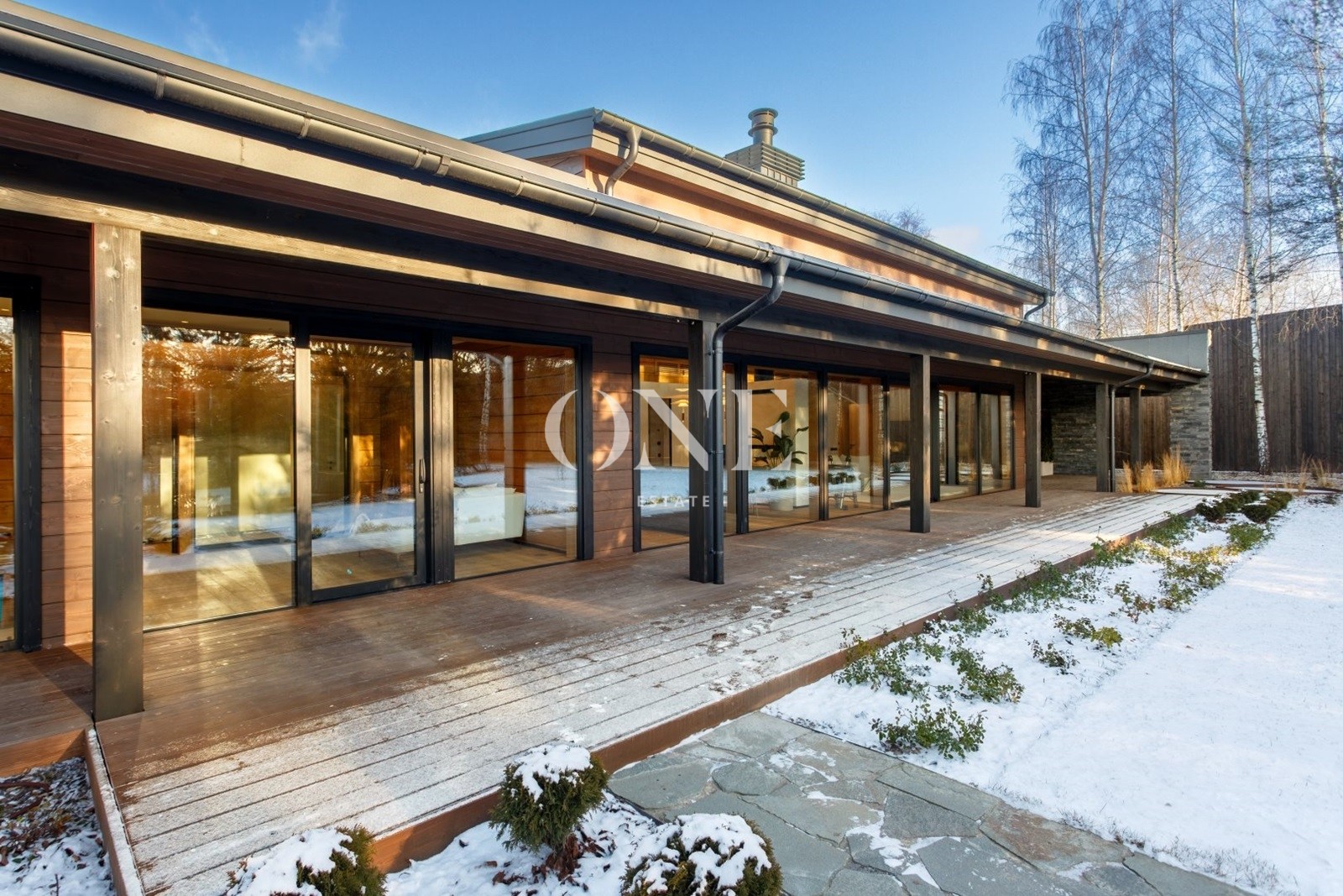 просторная двусветная гостиная с панорамным остеклением + с окнами в кровле, мастер-спальня с отдельным выходом на террасу, ванной комнатой и гардеробом, 3 спальни, одна из них может превратится в кабинет, кухня-столовая с двусторонним камином, гардеробная, тех помещение, с/у, комната для персонала.