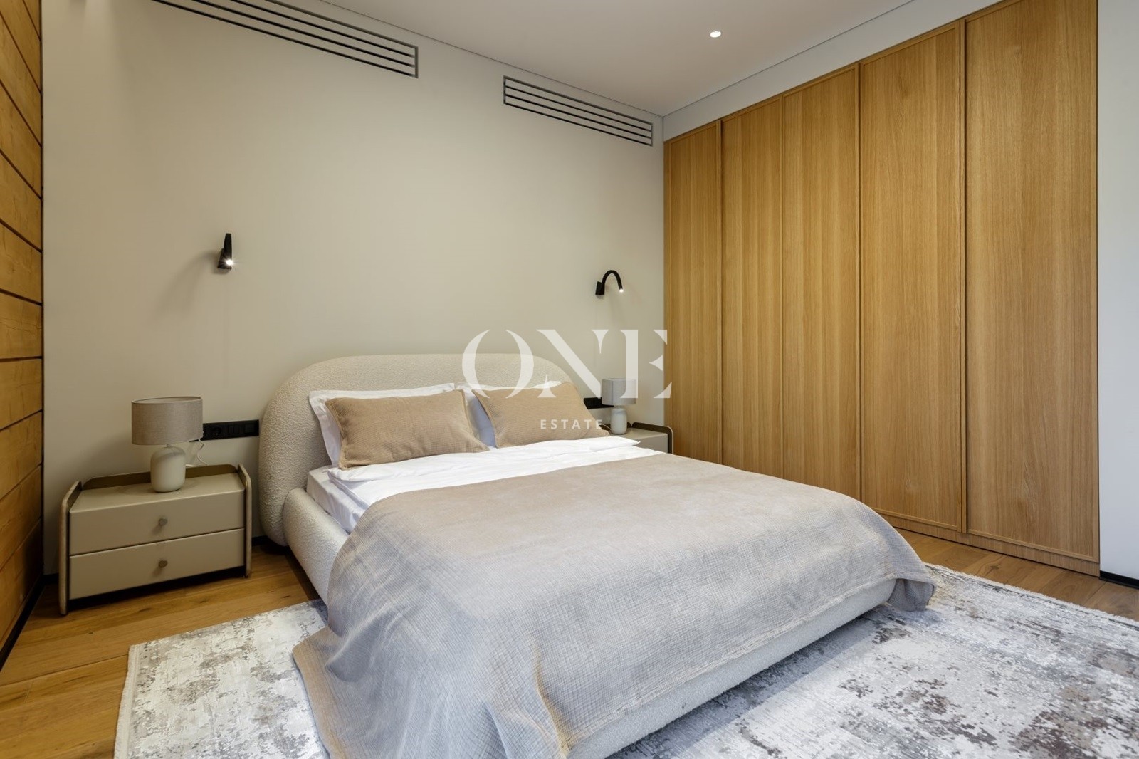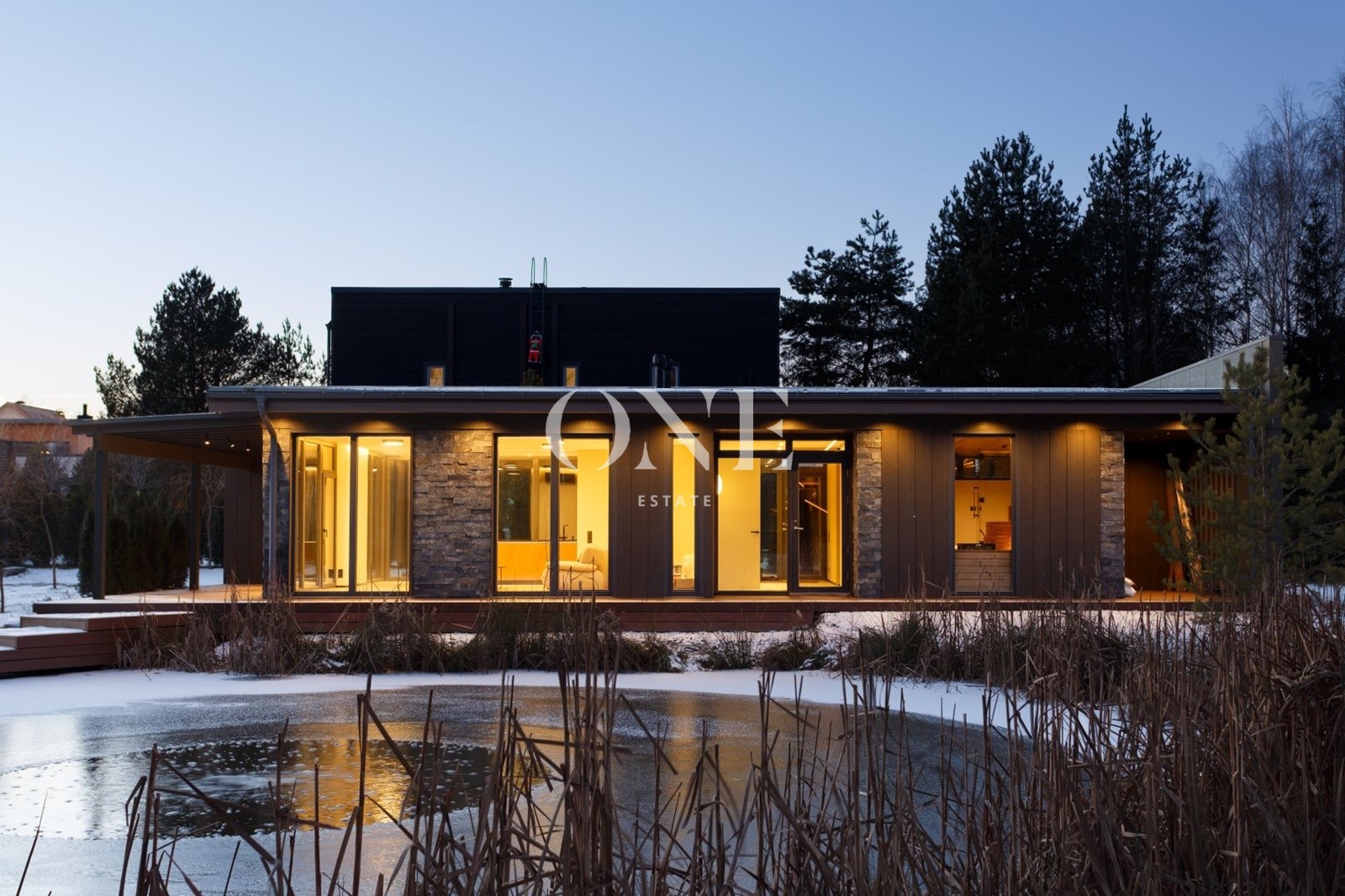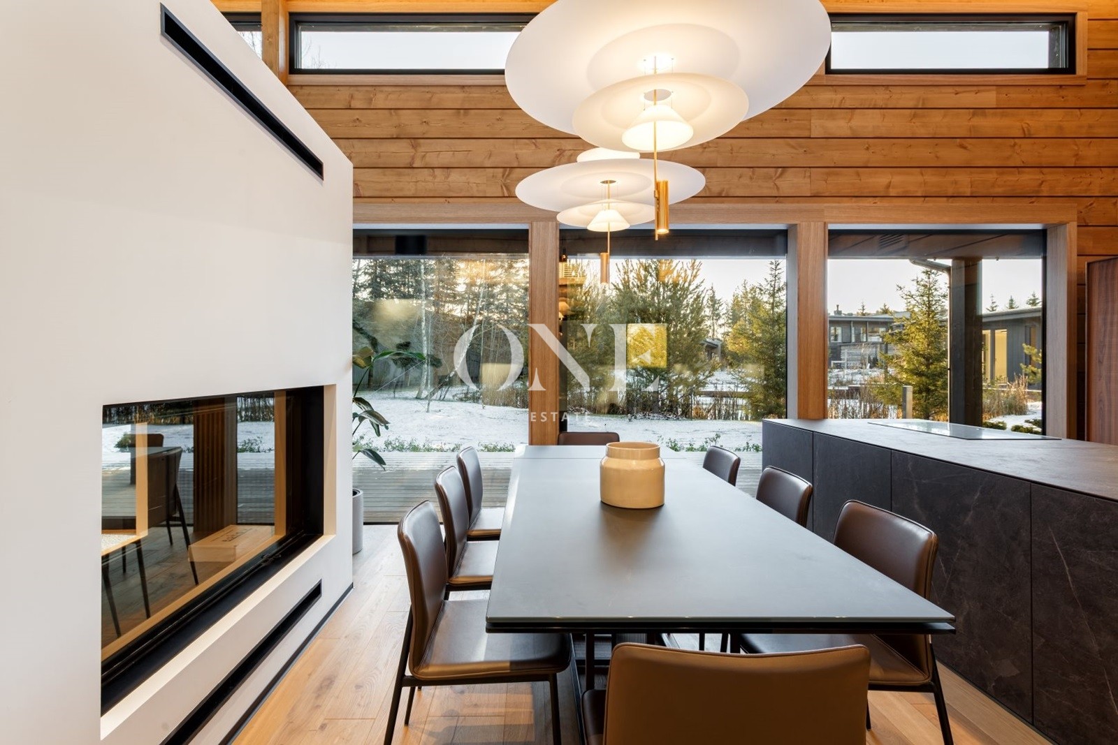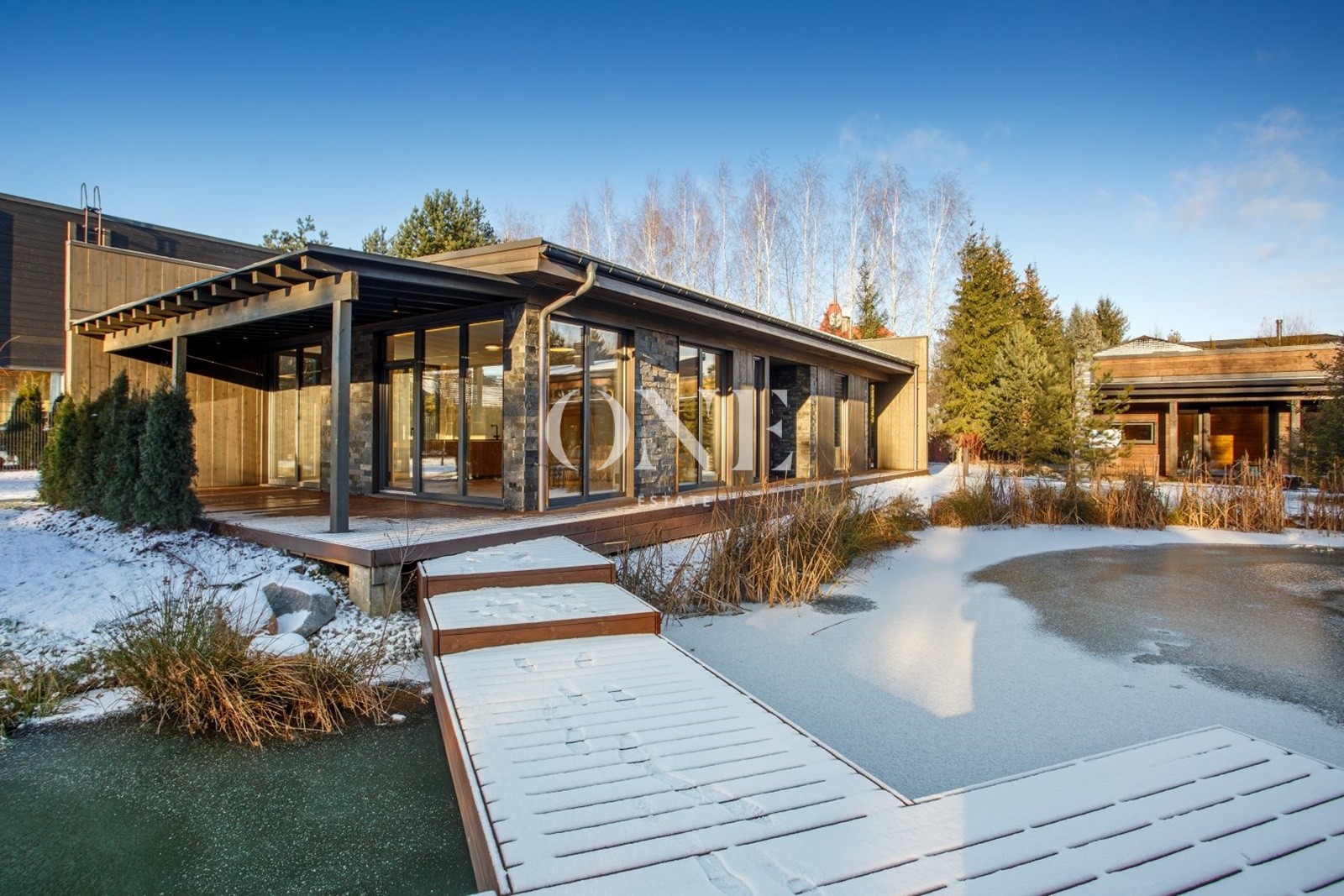 просторная двусветная гостиная с панорамным остеклением + с окнами в кровле, мастер-спальня с отдельным выходом на террасу, ванной комнатой и гардеробом, 3 спальни, одна из них может превратится в кабинет, кухня-столовая с двусторонним камином, гардеробная, тех помещение, с/у, комната для персонала.