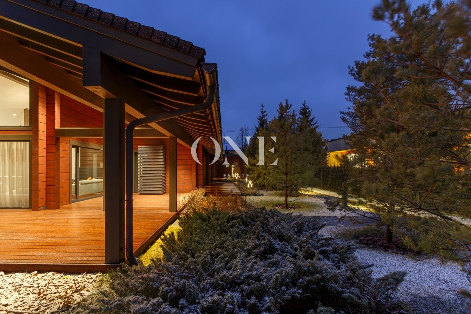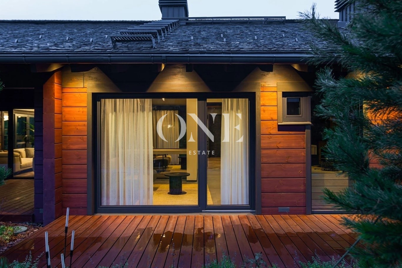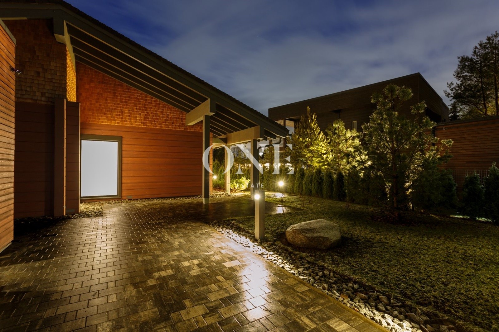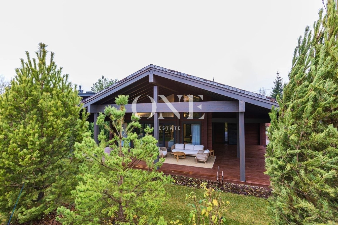Терраса просторная, в одной плоскости с ландшафтом. Оснащена летней кухней, подходит для круглогодичных встреч и отдыха.