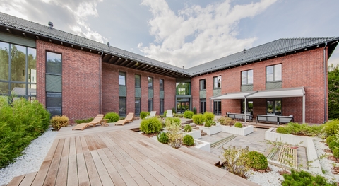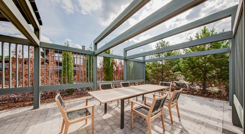 На террасу выходят гостиная с камином, кухня и столовая. Возле кухни расположена вместительная кладовая. Рядом с гостиной — просторный кабинет.