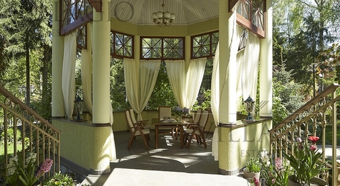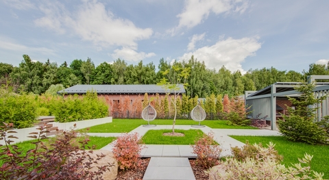 Беседка с мангалом, барбекю и мини-кухней спрятана на участке в тени раскидистых елей. Вокруг особняка создан аккуратный ландшафт, проложены прогулочные дорожки с вечерней подсветкой, растут высокие раскидистые ели и густые кустарники.