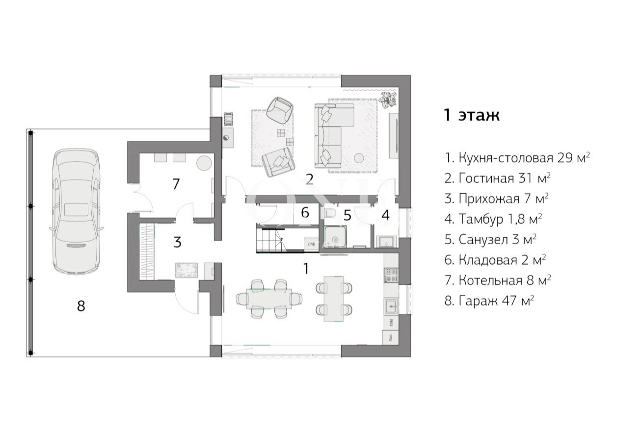 прихожая с гардеробом, гостиная, кухня-столовая, котельная.