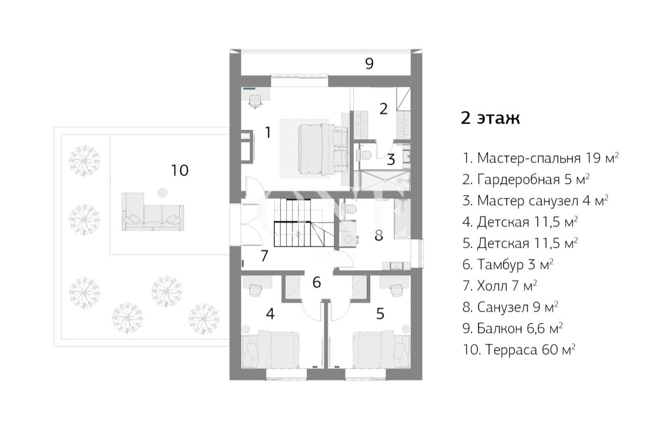 мастер-спальня со своей гардеробной и с/у, 2 спальни, с/у, терраса.