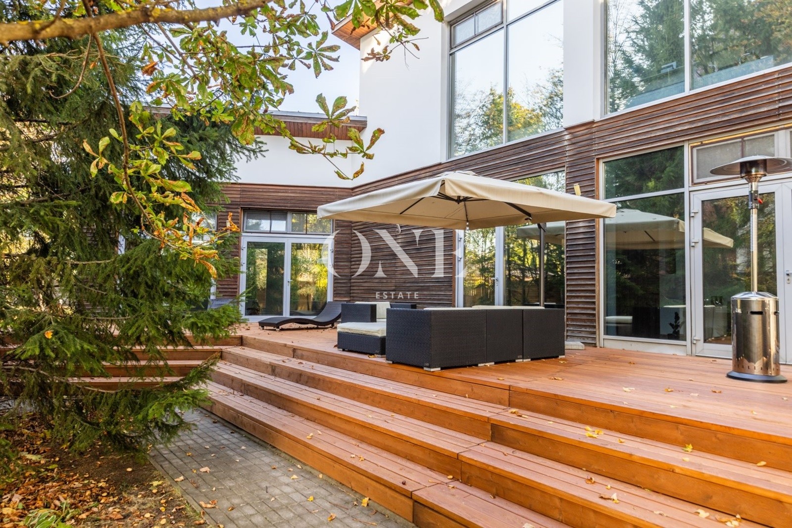 Панорамные окна, высокие потолки, приватный участок с крупными хвойными деревьями.
