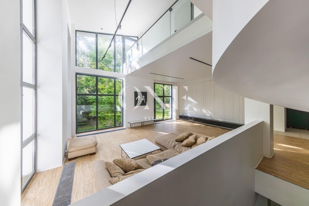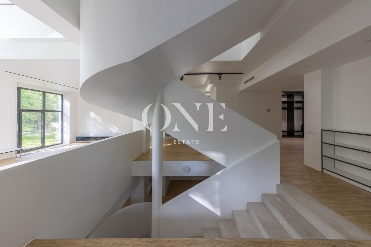 Современный дизайн дома выполнен в нежной монохромной песочно-серой гамме с акцентами на детали: винтовая лестница, большие панорамные окна, стильная ломаная геометрия линий.