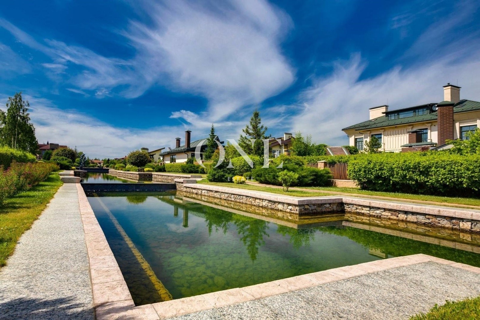 На участке выполнен ландшафтный дизайн, высажены деревья и кустарники, выстелен газон. Есть двухэтажный гостевой дом (136 кв. м) с комнатой для персонала, теплая беседка с барбекю, кухней и зоной отдыха .