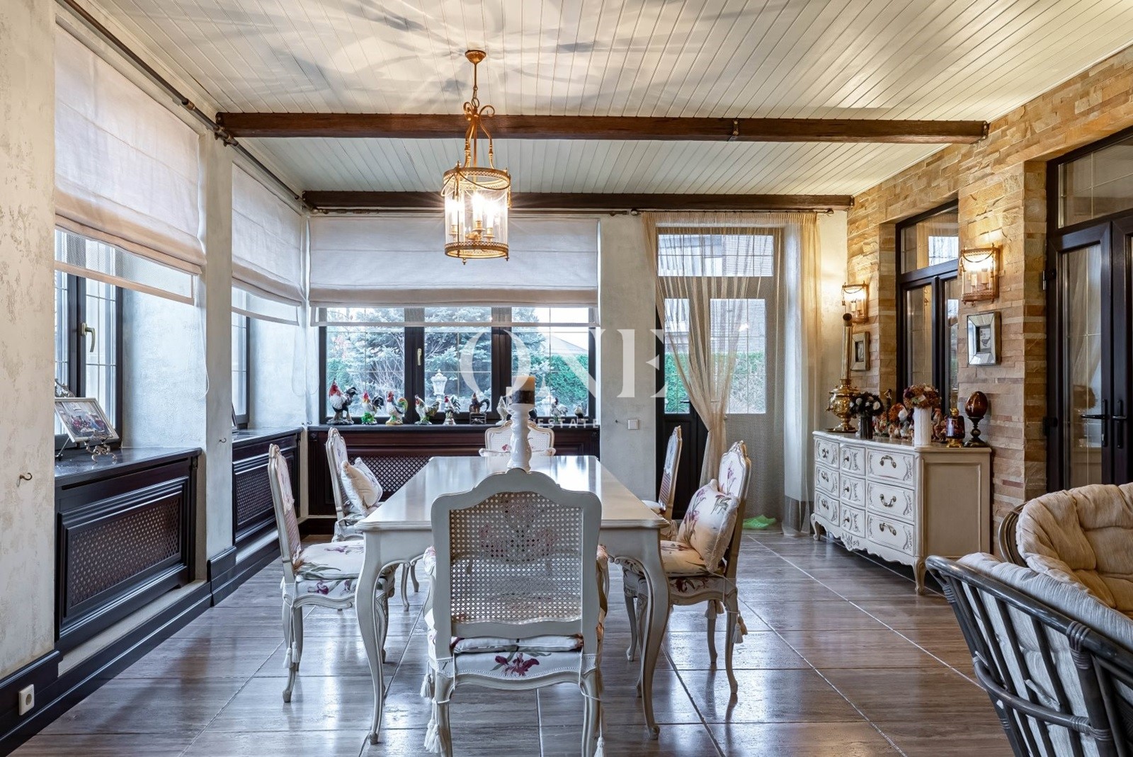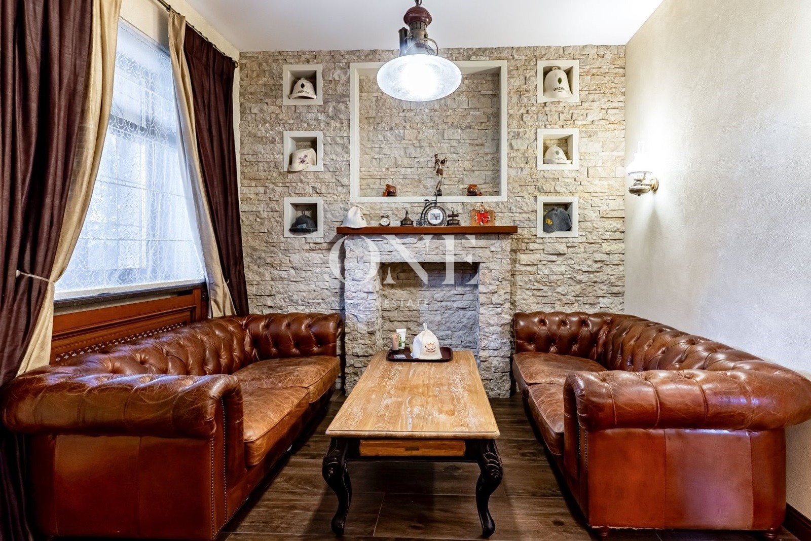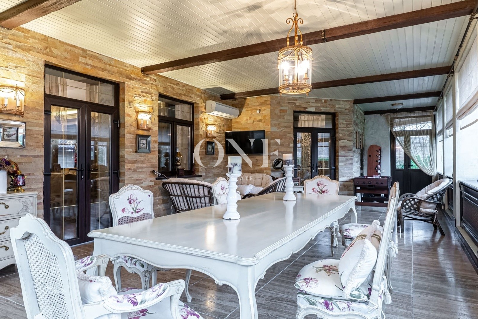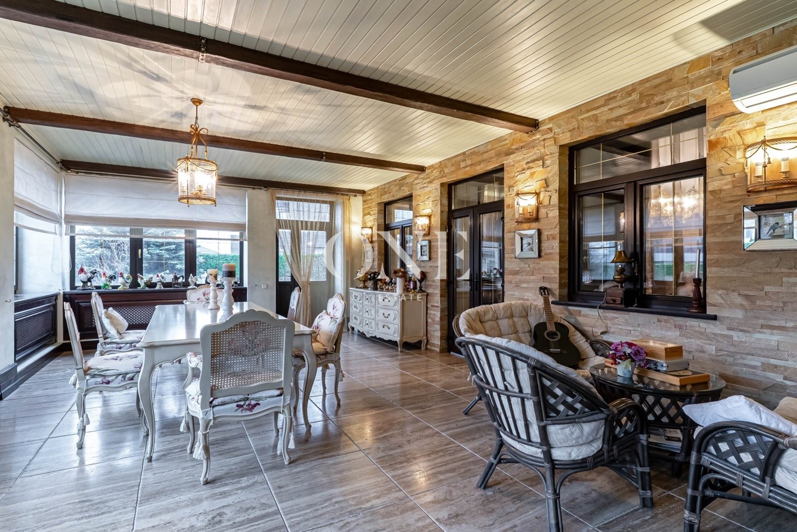 кухня, столовая, гостиная с камином, отдельный с/у, постирочная, котельная, терраса.