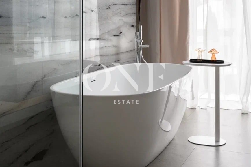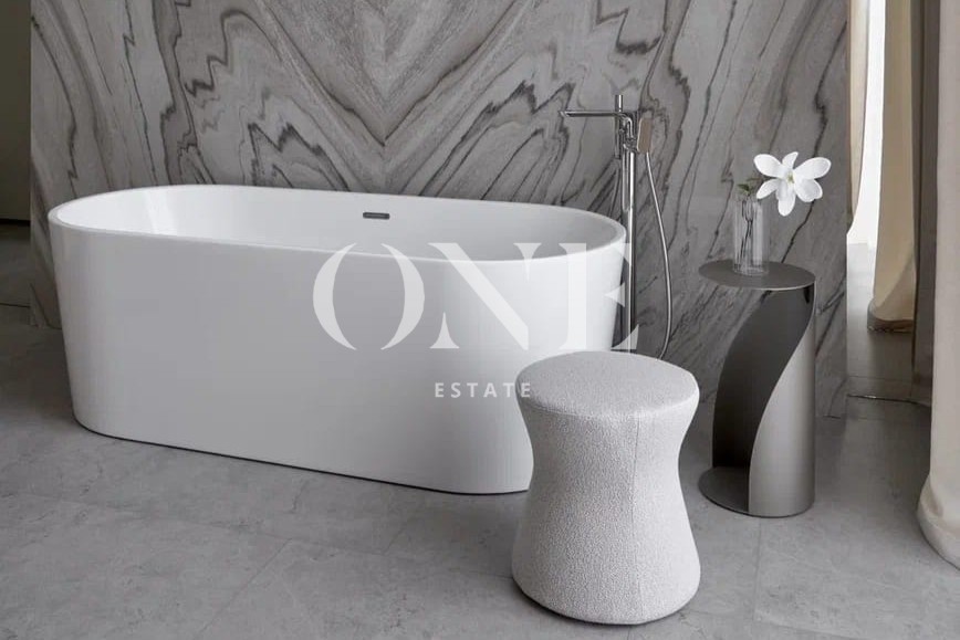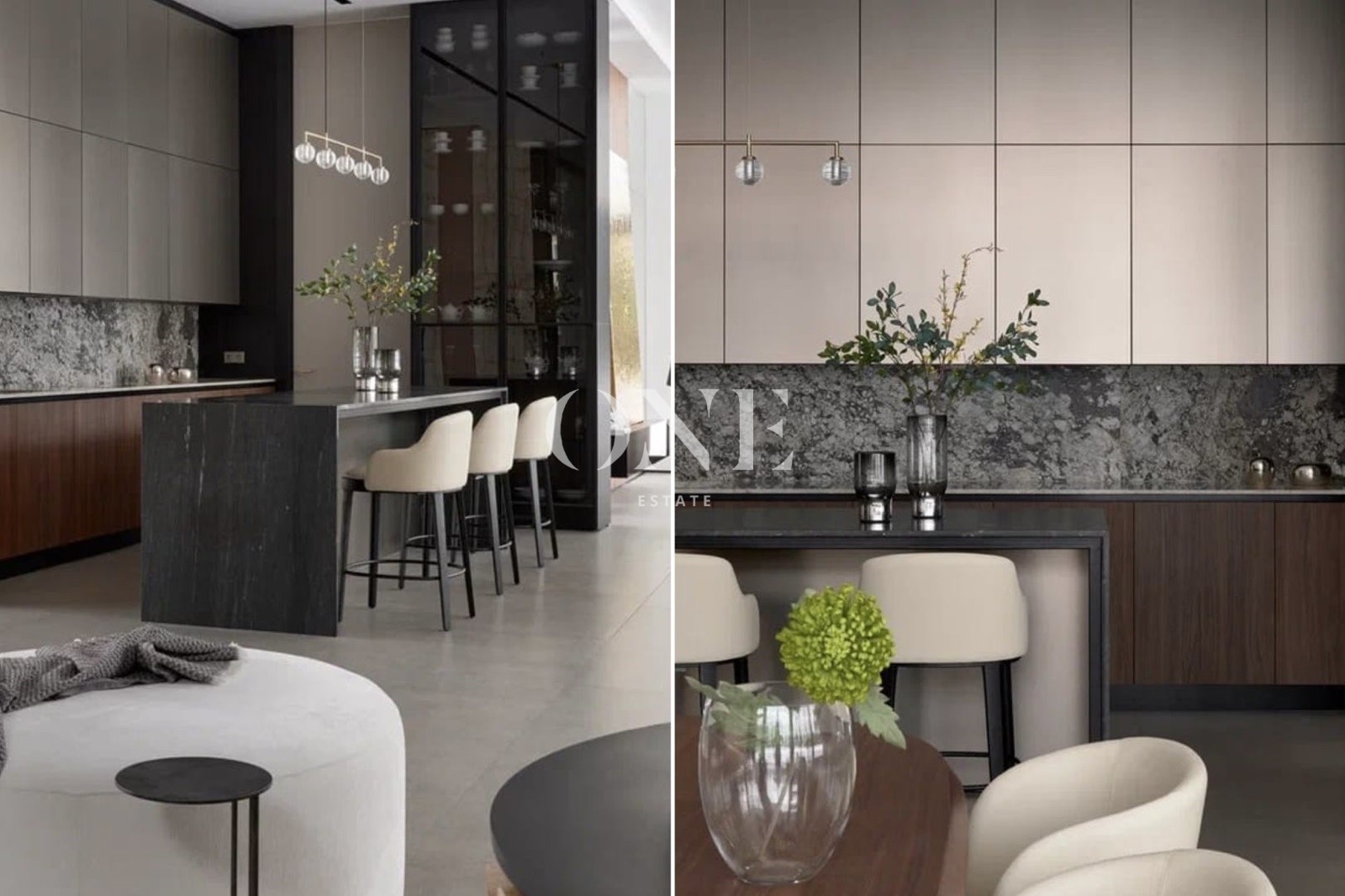В отделке использованы натуральный камень, мрамор, американский орех, крупноформатный керамогранит, техника Miele, сантехника Villeroy & Boch и Gessi.