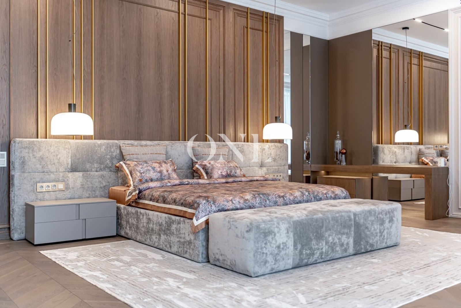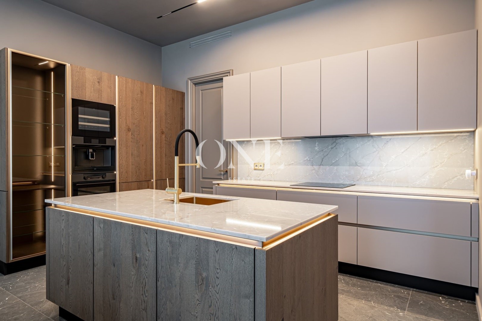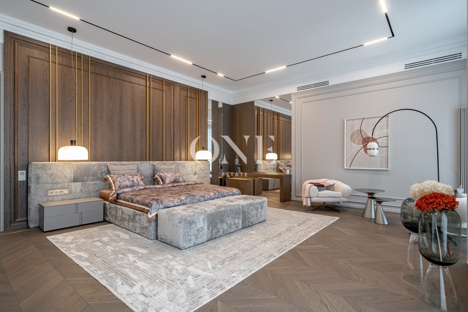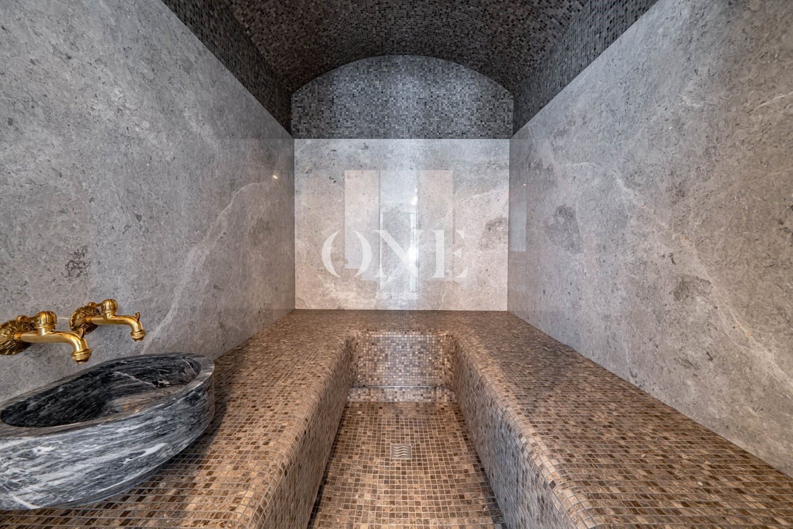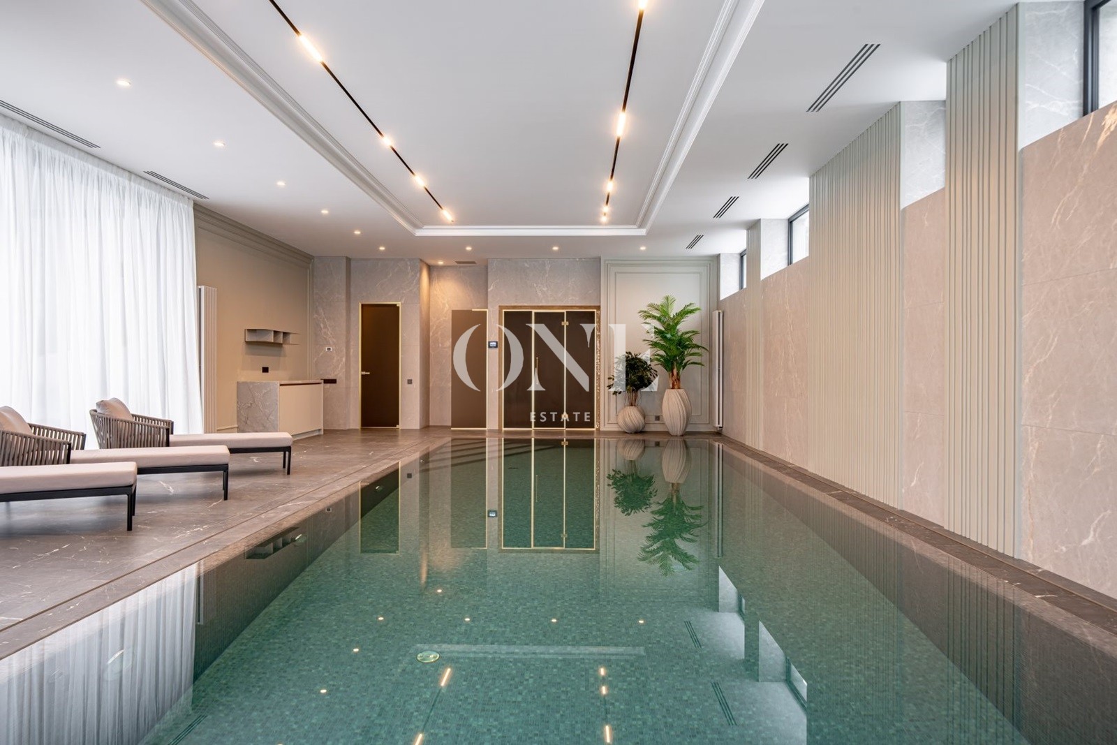 парадная кухня, рабочая кухня, гостиная с дровяным камином, 5 спален, кабинет, бассейн 12 метров, сауна, хамам, гараж на 2 м/м.