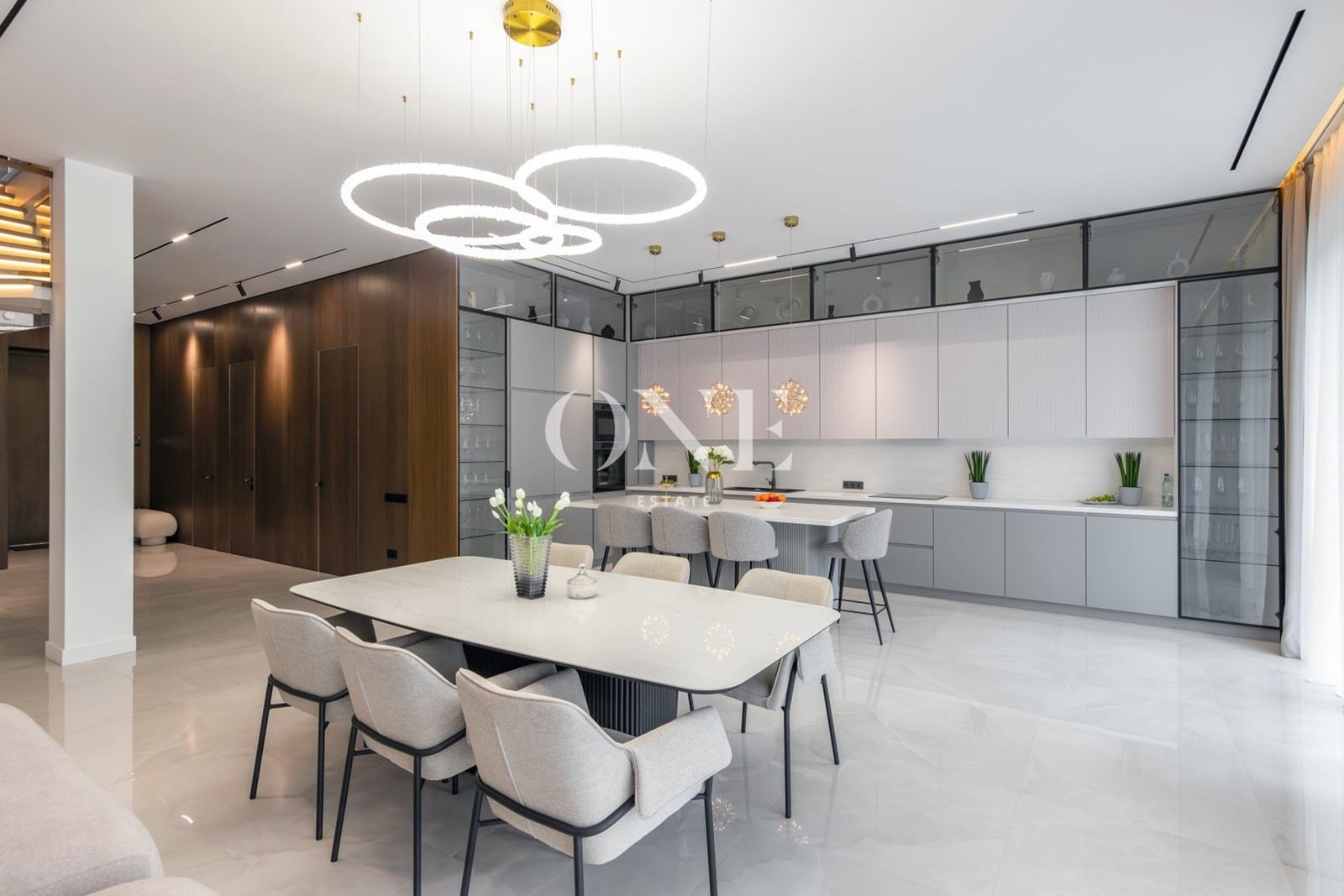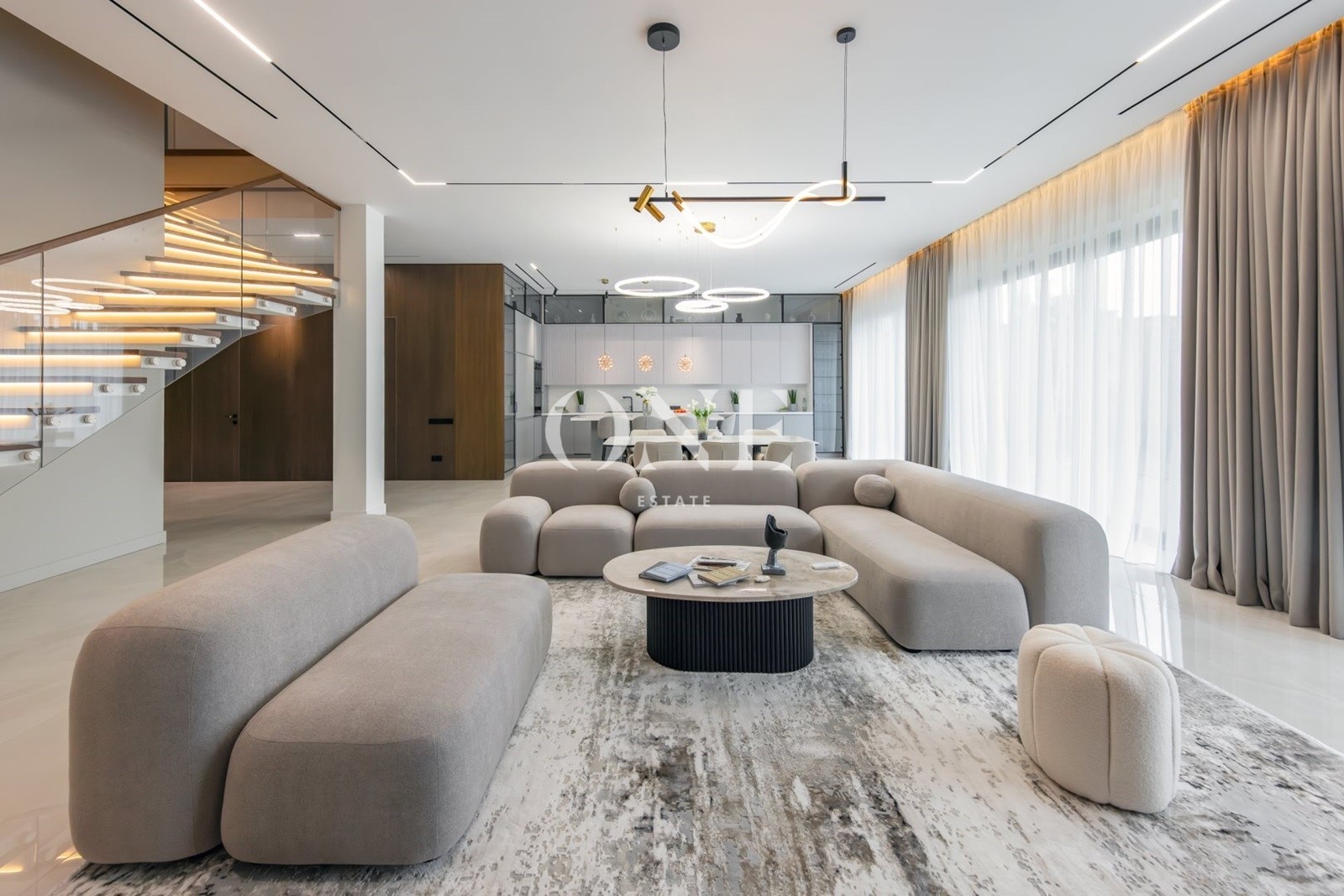 кухня-столовая-гостиная, котельная, гостевая спальня, санузел, квартира для персонала, зона спа с душевой, сауной и выходом на участок, санузел, постирочная, гардеробная, котельная, гараж на 2 машиноместа.