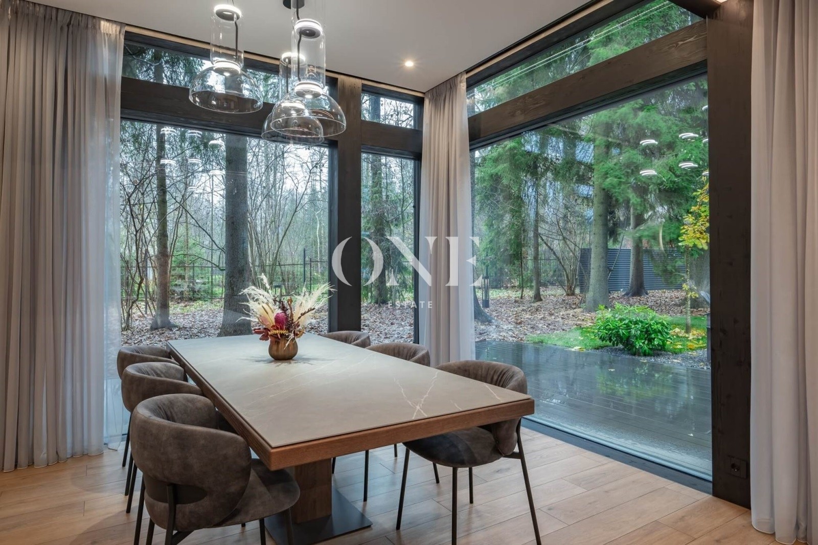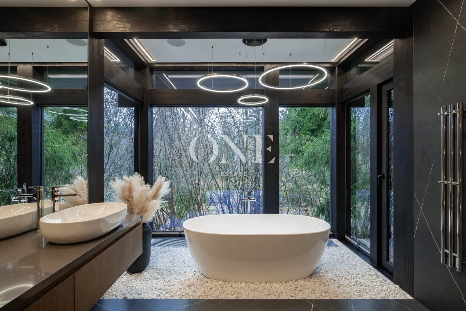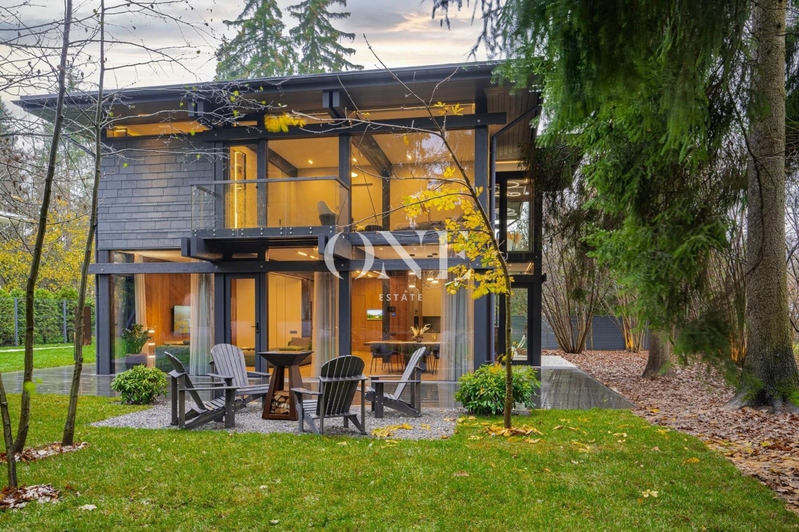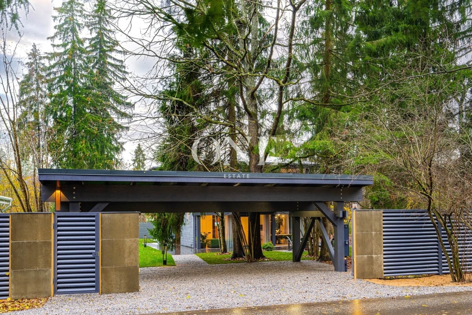 Современный концептуальный коттедж площадью 325 кв.м , выполненный по немецкой технологии фахверк, расположен на участке 14,5 соток среди древних елей и дубов. Уютный дом находится в спокойном лесном поселке всего в 26 километрах от МКАД по Рублево-Успенскому шоссе.