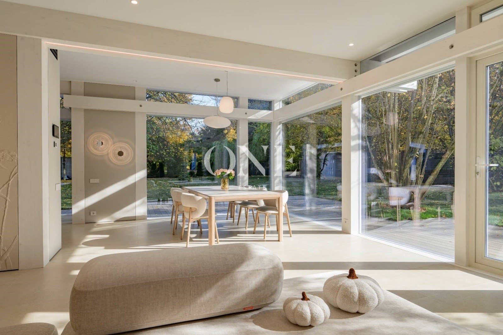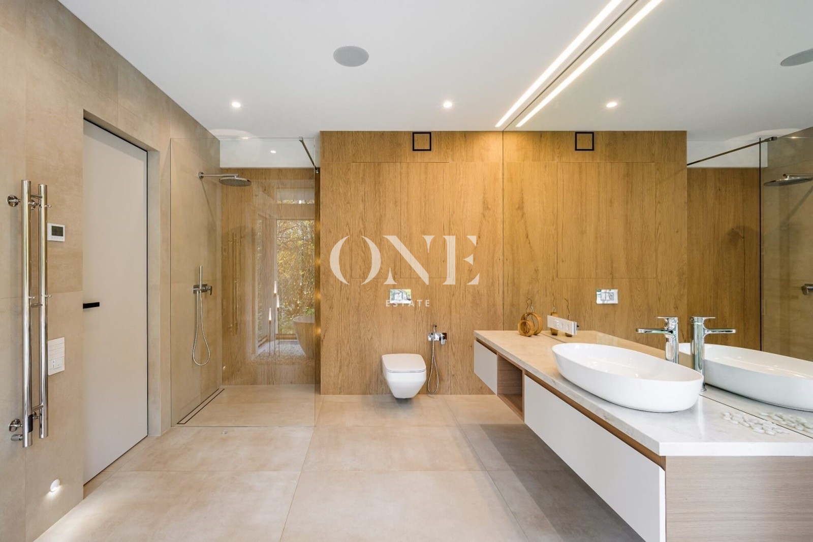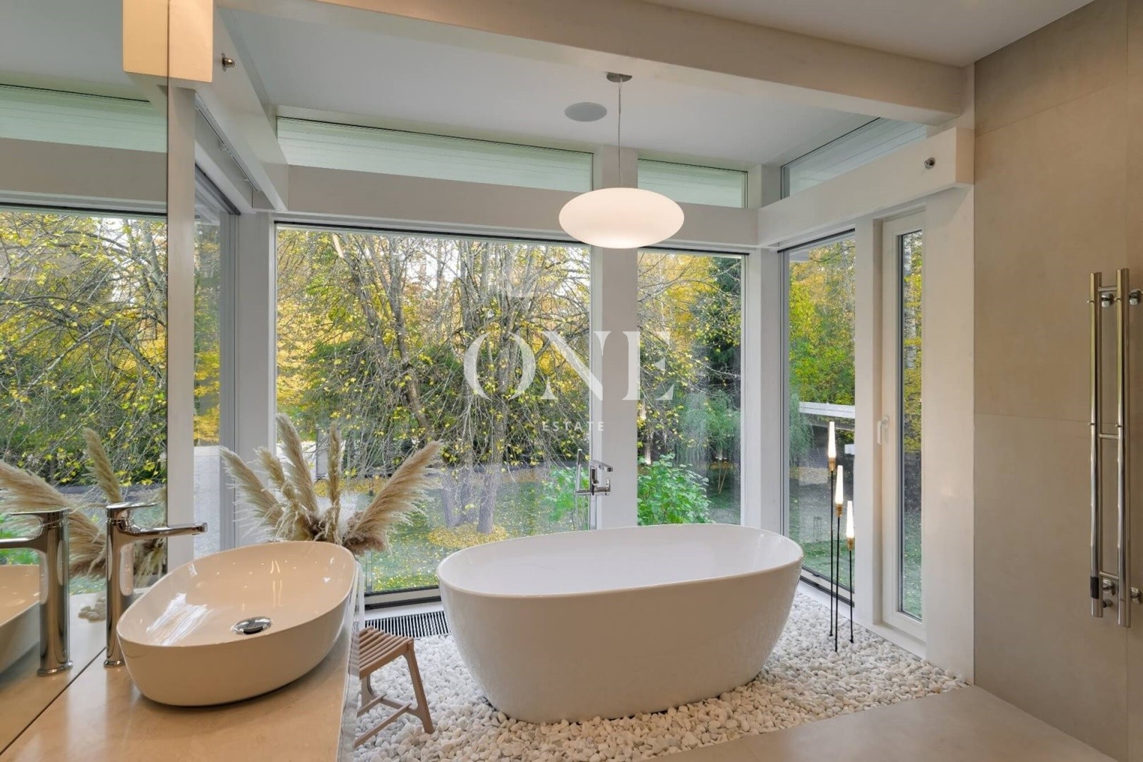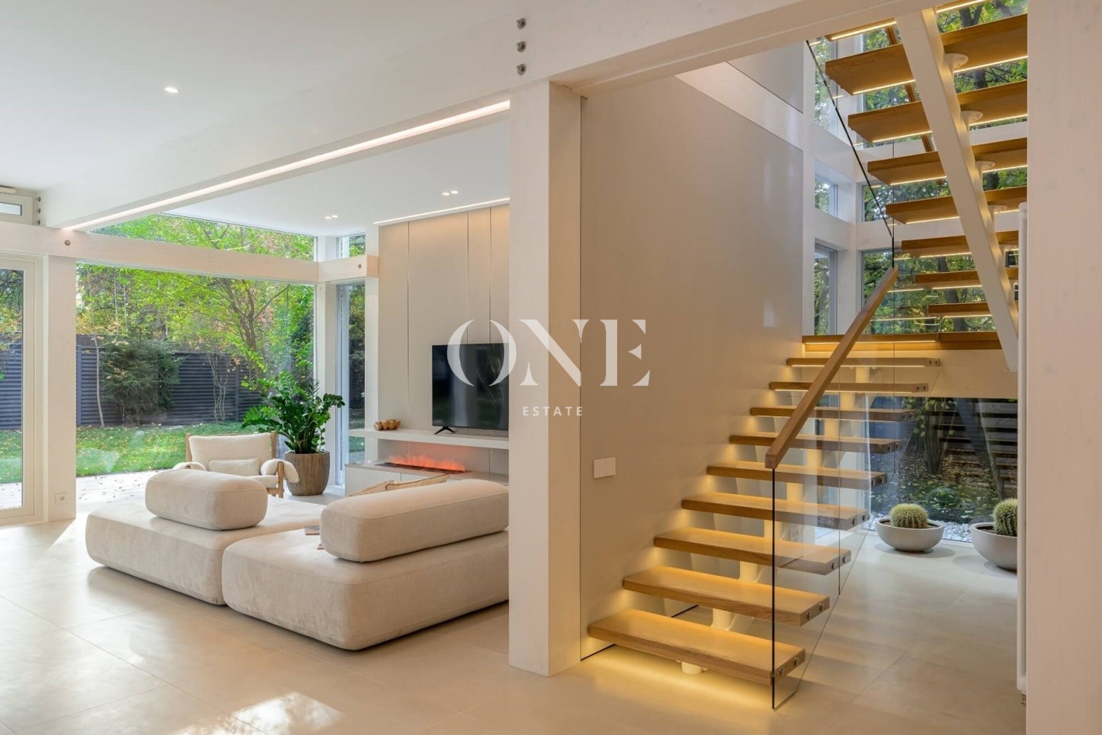 Совершенно современный дом площадью 315 кв.м., выполненный в стиле фахверк с использованием передовых немецких технологий. Расположен на просторном участке в 15,3 сотки, окруженном величественными елями и дубами. Находится в уютном лесном поселке всего в 26 километрах от МКАД, по Рублево-Успенскому шоссе.