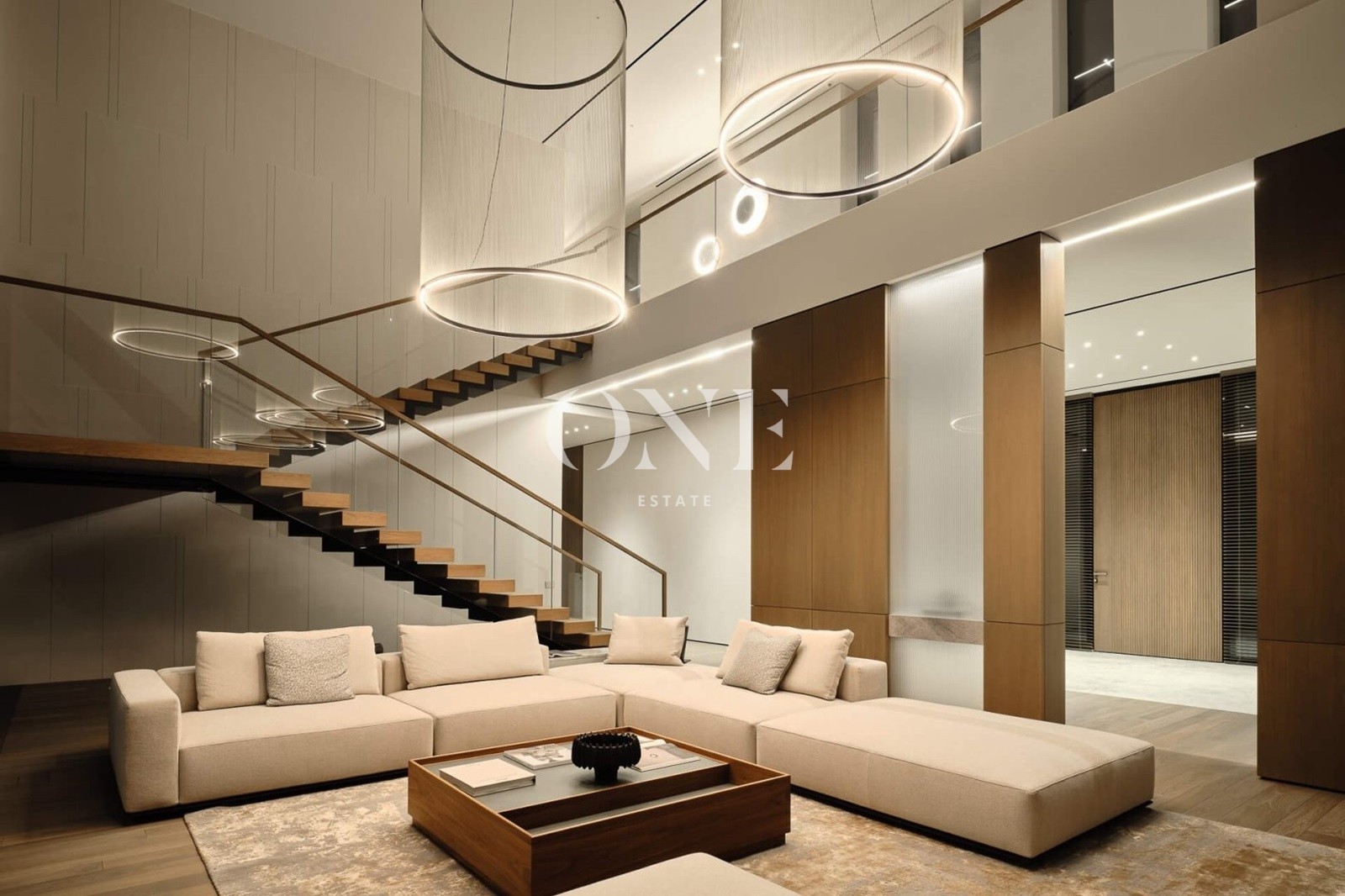 Просторная галерея с видом на второй свет гостиной и лифтом.