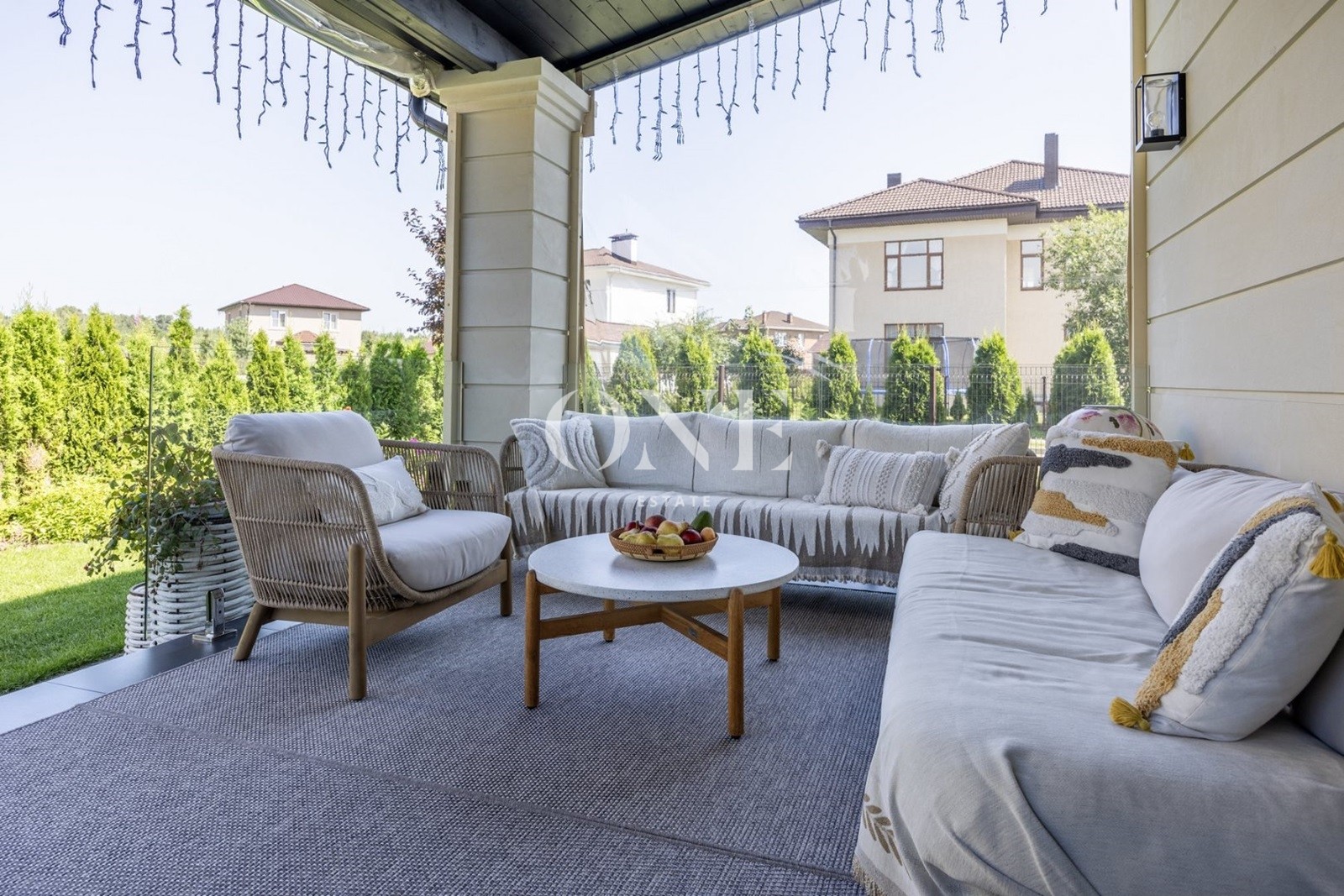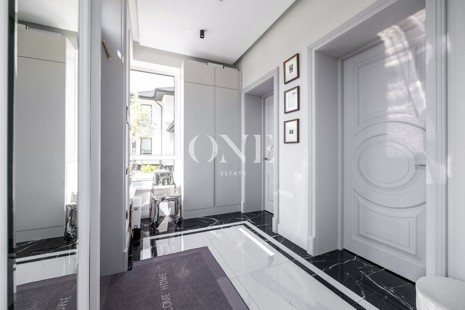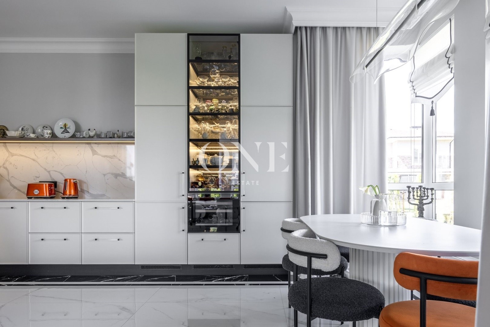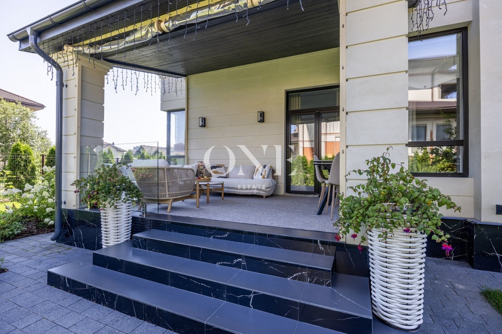 Первый этаж, второй этаж холл и с/у - тёплый пол. Подоконники и лестница выполнены из камня. Кухня оборудована профессиональной мебелью и встроенной техникой премиум-класса: Asko, Korting. Установлена современная охранная система с датчиками движения и контроля доступа, климат-контроль, профессиональная система очистки воды. На участке выполнен профессиональный ландшафтный дизайн в современном стиле. Для отдых на свежем воздухе оборудована уютная меблированная терраса.
