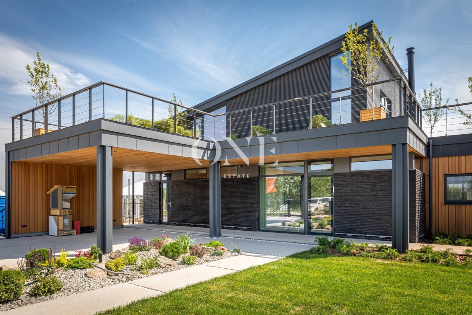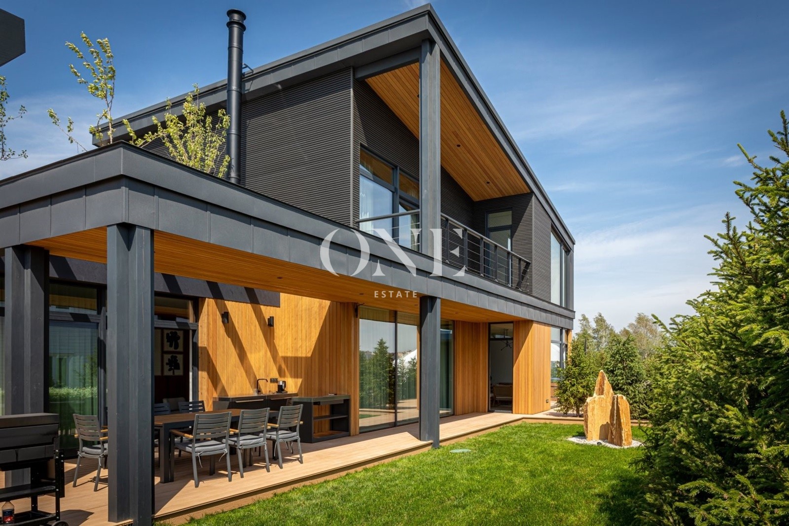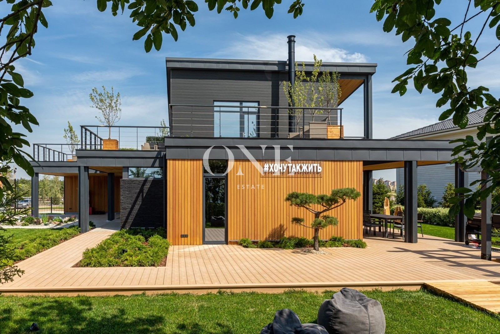 Архитектурный проект дома выполнил известный архитектор Данир Сафиуллин. Конструкция дома выполнена по технологии заводского изготовления от лидера отрасли компании Тамак. Комбинированная отделка фасада (клинкерный натуральный камень, планкен из лиственницы, ДПК панели). Монолитная ж/б плита с утеплением и дренажем. Большие зоны открытых террас с покрытием из массивной ДПК доски. SPA-зона с подогреваемой купелью с уличной мебелью и в окружении хвойных деревьев. Пергола с костровой зоной и зоной отдыха с покрытием из монолитного прозрачного поликарбоната.