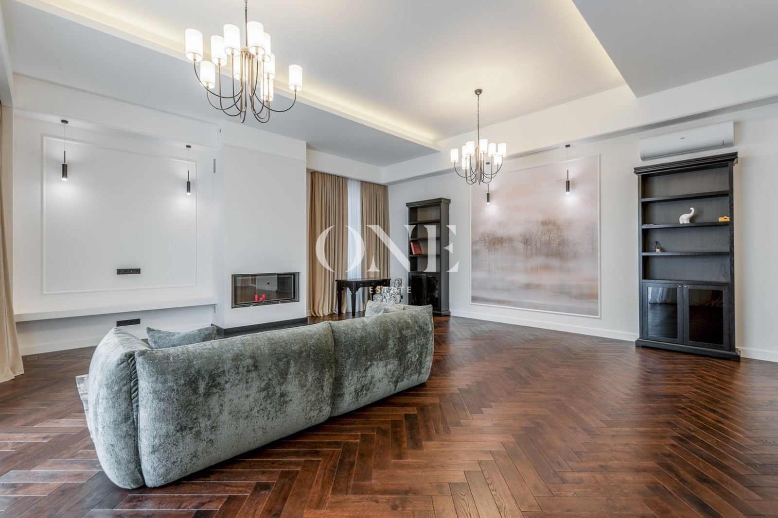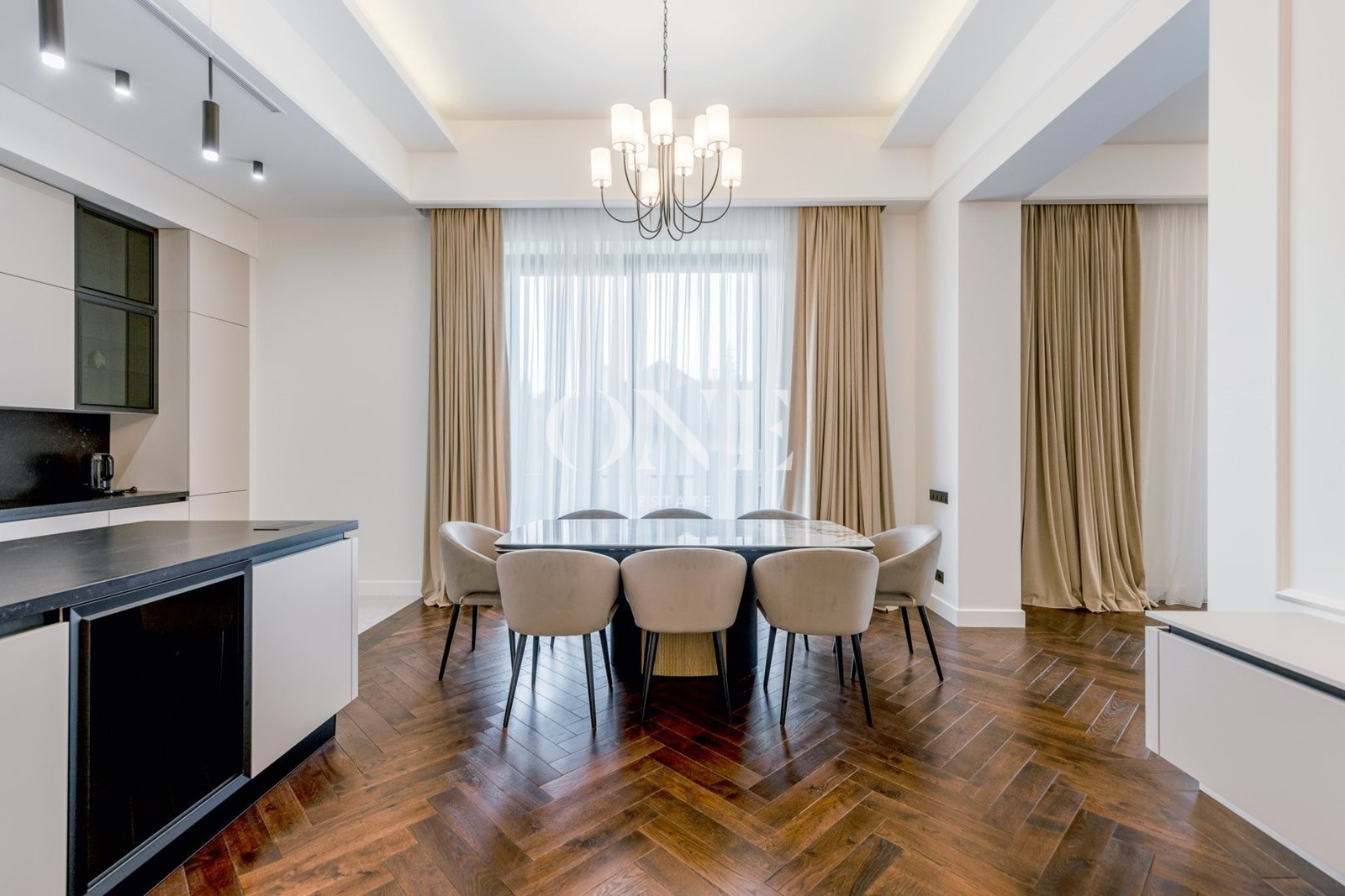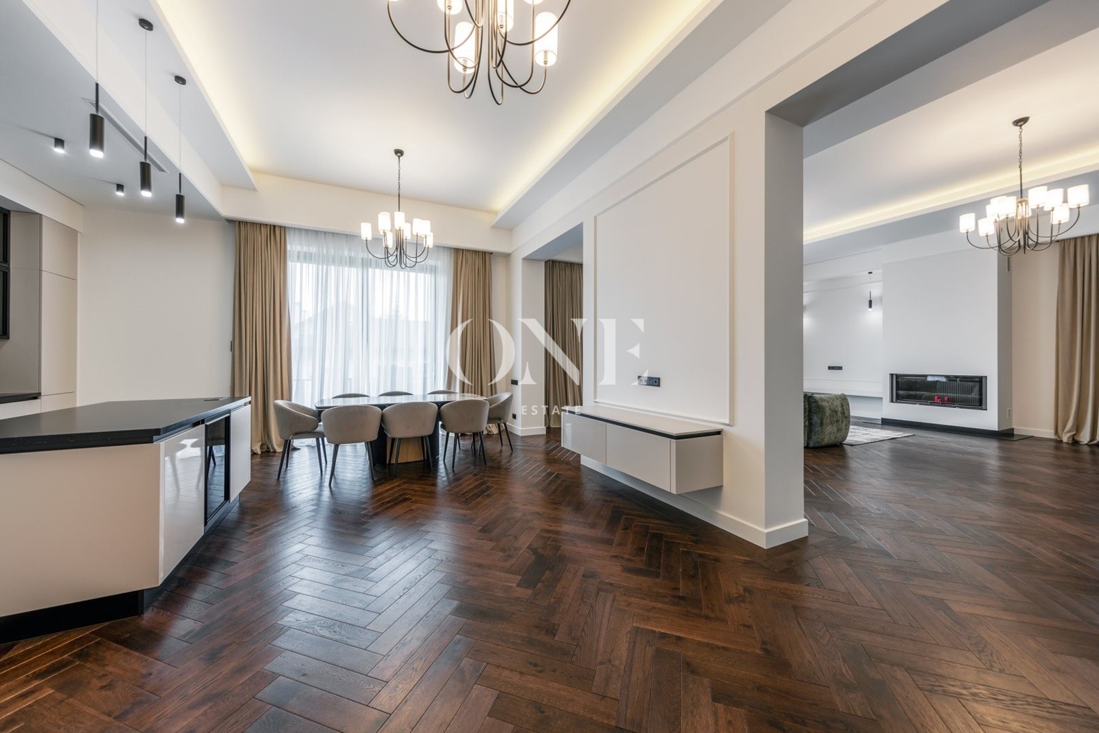 На первом этаже расположено 4 спальни , 5 с/у, 3 просторных гардеробных, кабинет, столовая, объединенная с каминным залом и выходом на террасу.