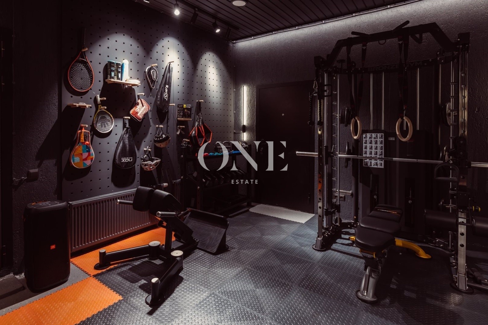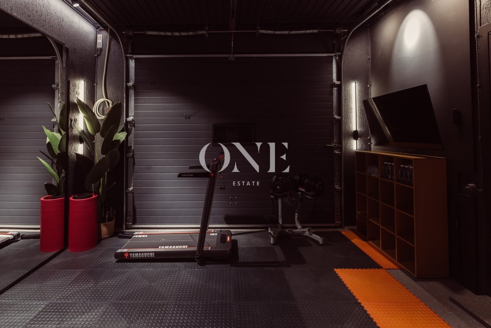 1 этаж: прихожая, мастер-спальня со своим санузлом, комната свободного назначения, гостевой санузел, кухня-гостиная, веранда. Гараж используется под спортзал (возможно использование под автомобиль).