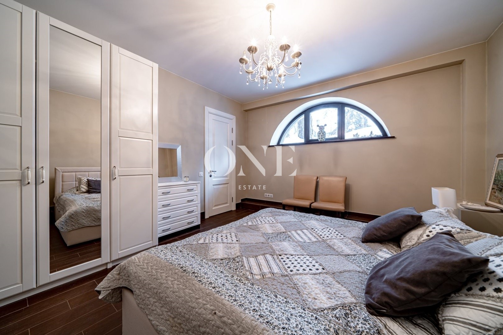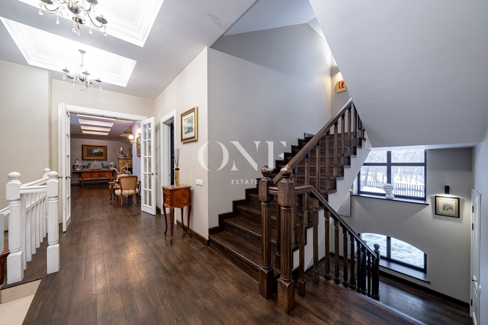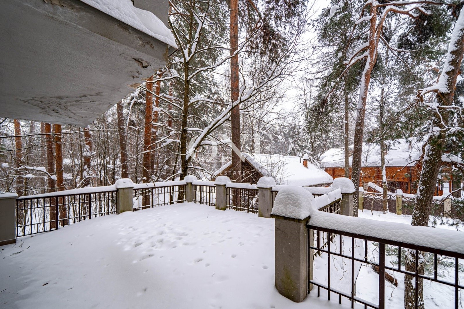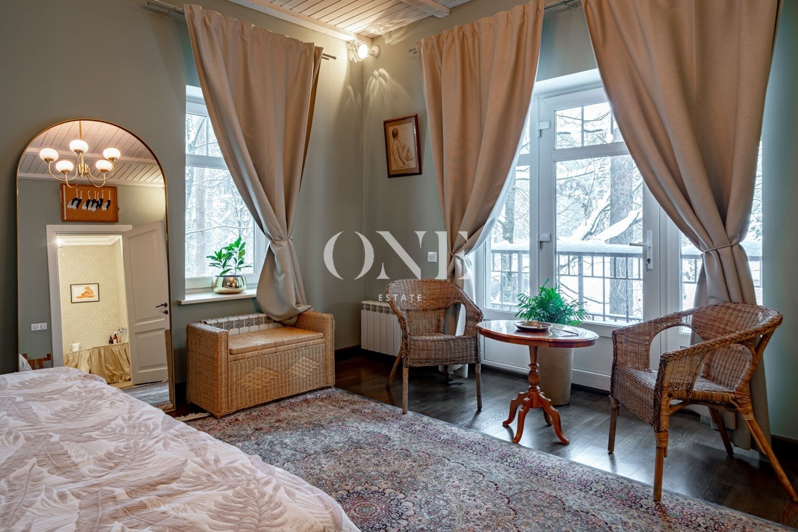 Дом в тихой части Николиной горы, стародачного места в соснах в 24 км от МКАД по Рублево-Успенскому шоссе. 633 метра, 14 соток, 5 спален, бассейн с сауной, балконы с прекрасными видами