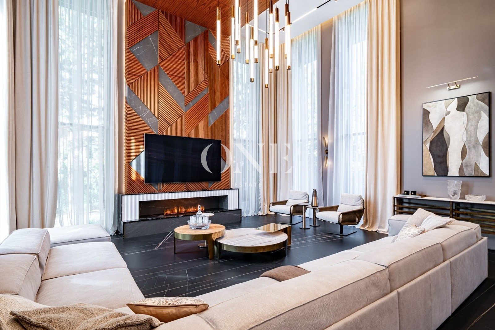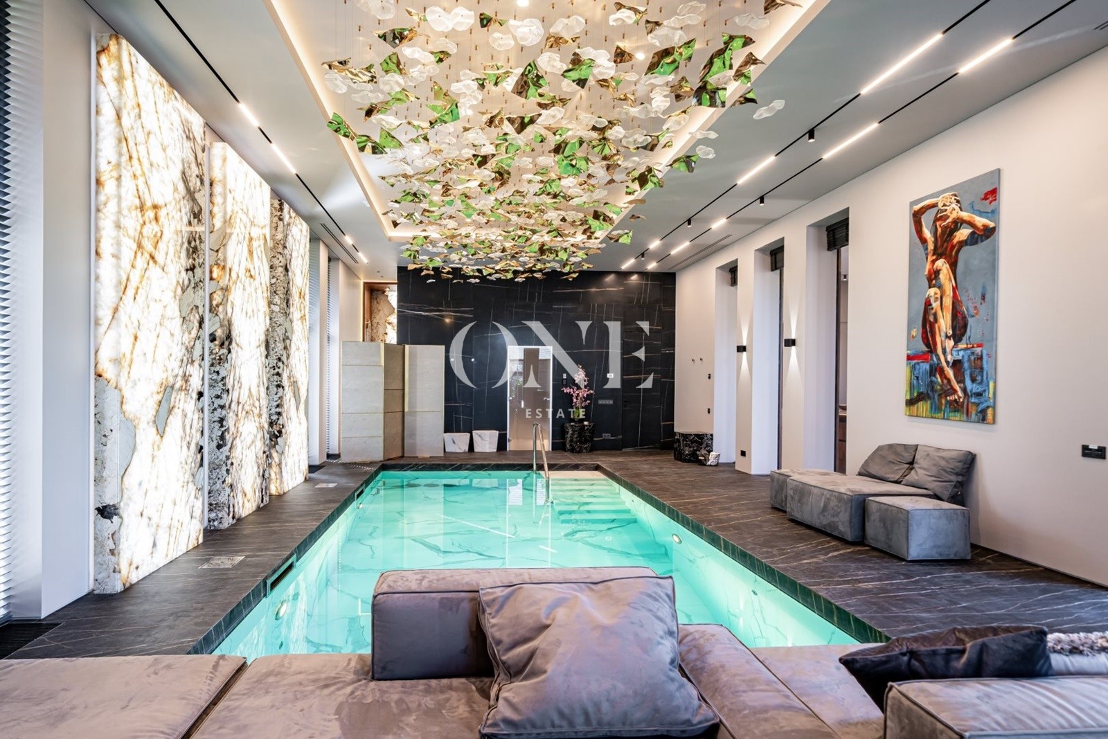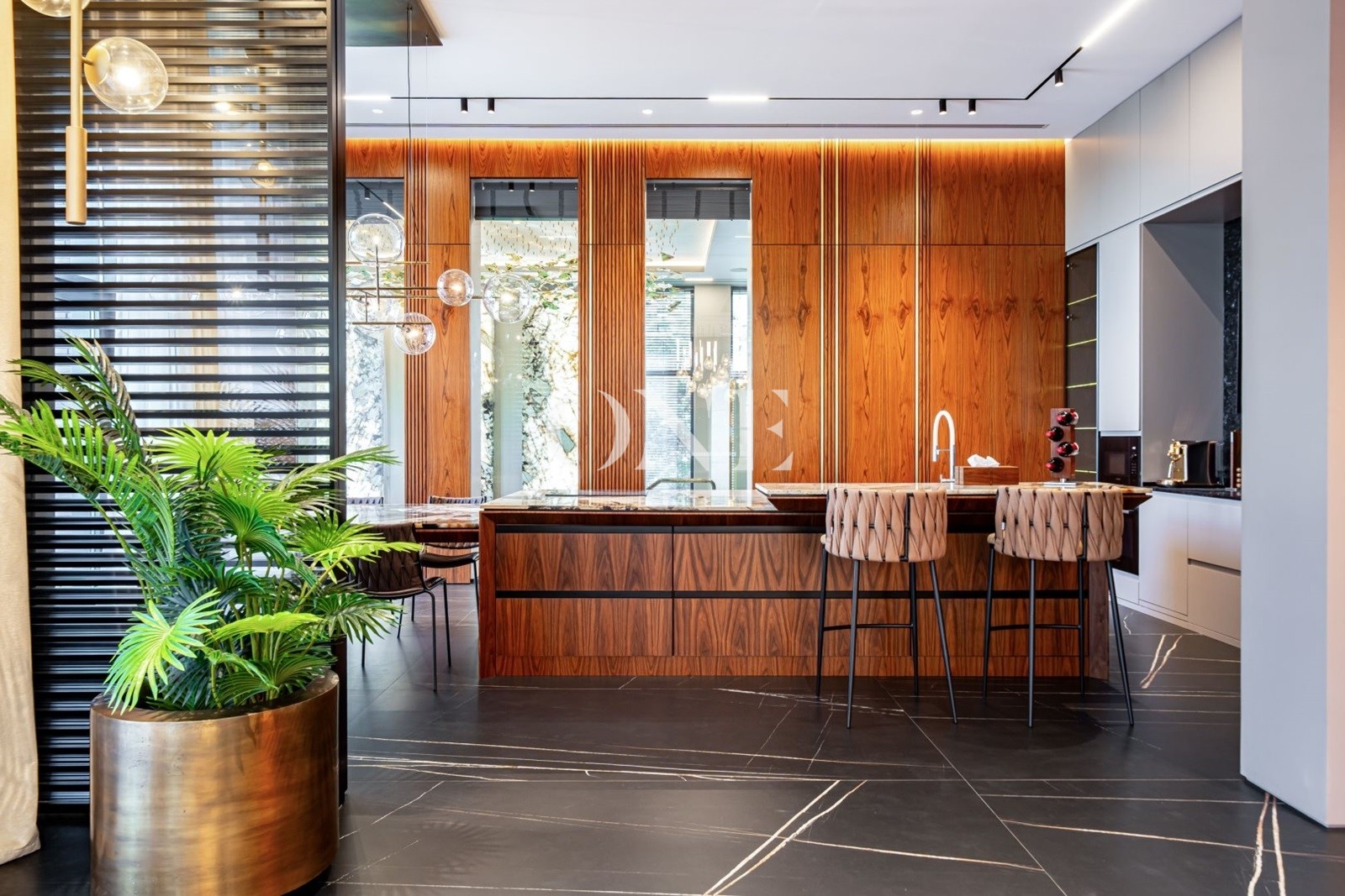 кухня, столовая, гостиная с камином и вторым светом, 2 спальни с собственными гардеробными и с/у, гараж для 2-х автомобилей, SPA-зона с бассейном, хаммамом и зоной отдыха.