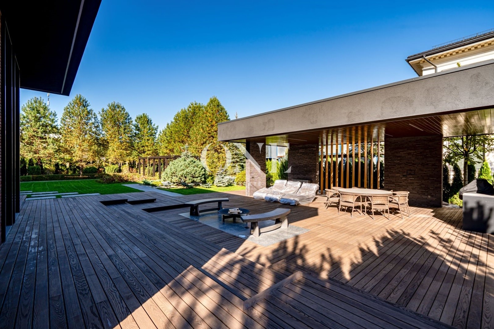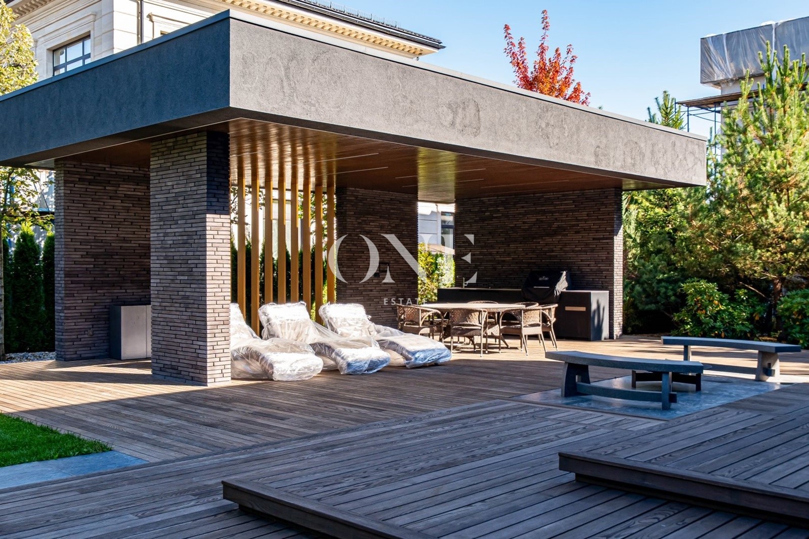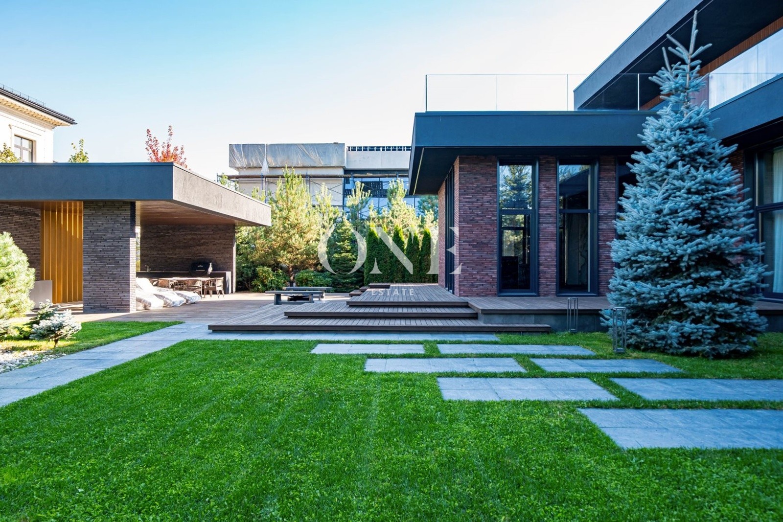 На участке выполнен ландшафтный дизайн с перголами, зелёными изгородями и уютными дорожками.