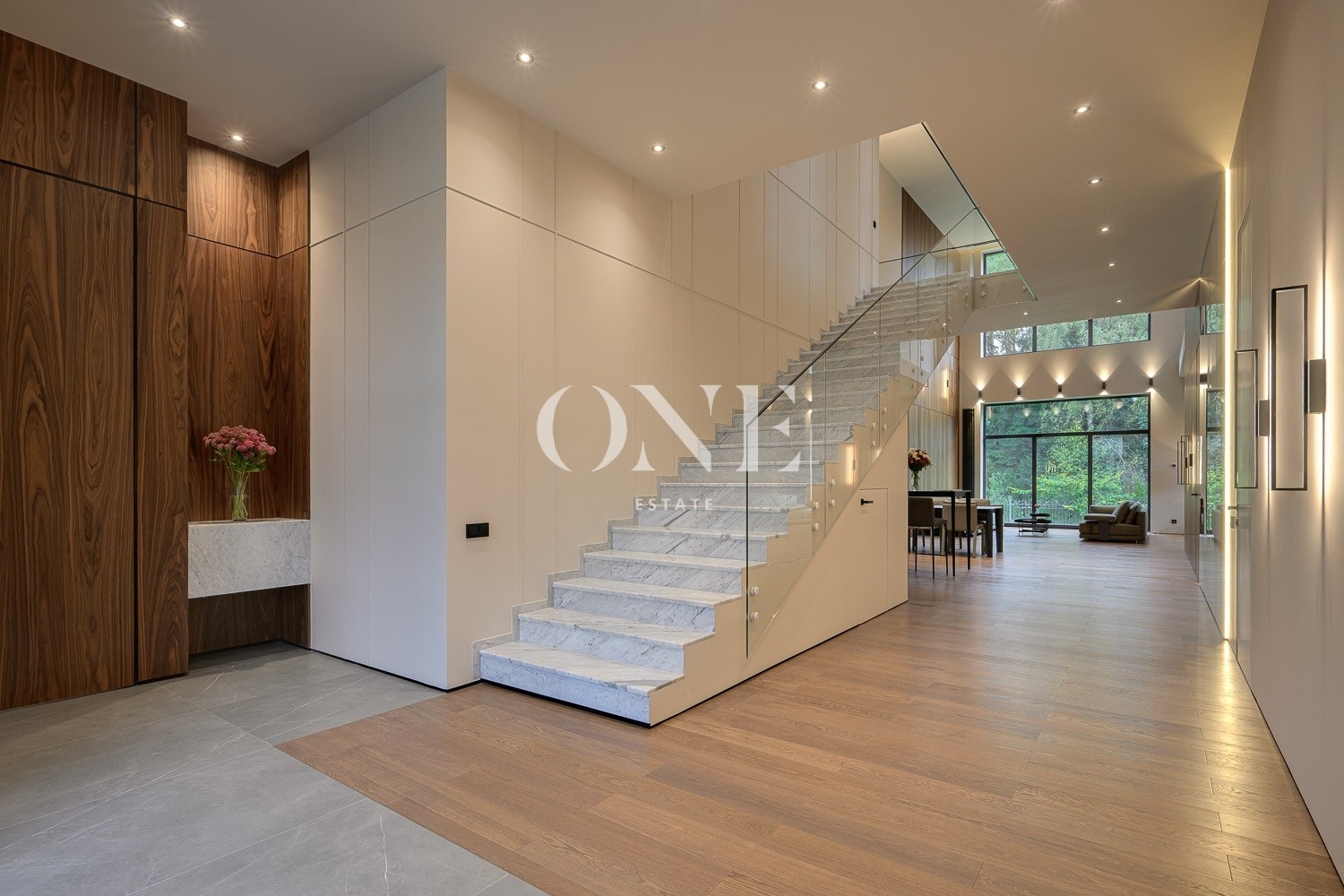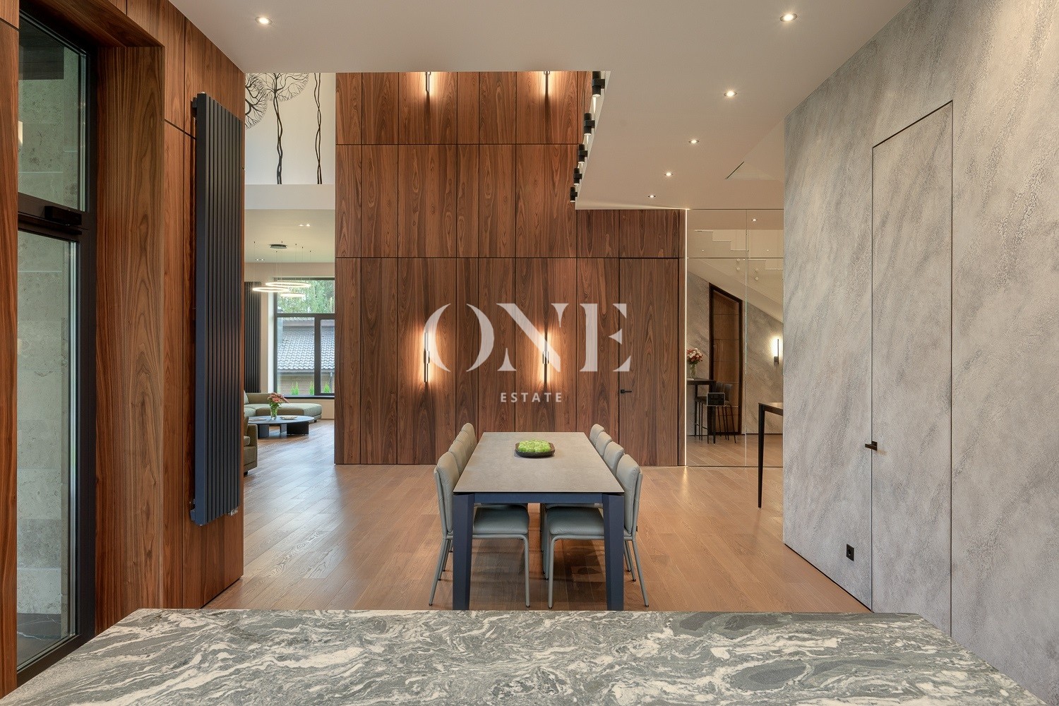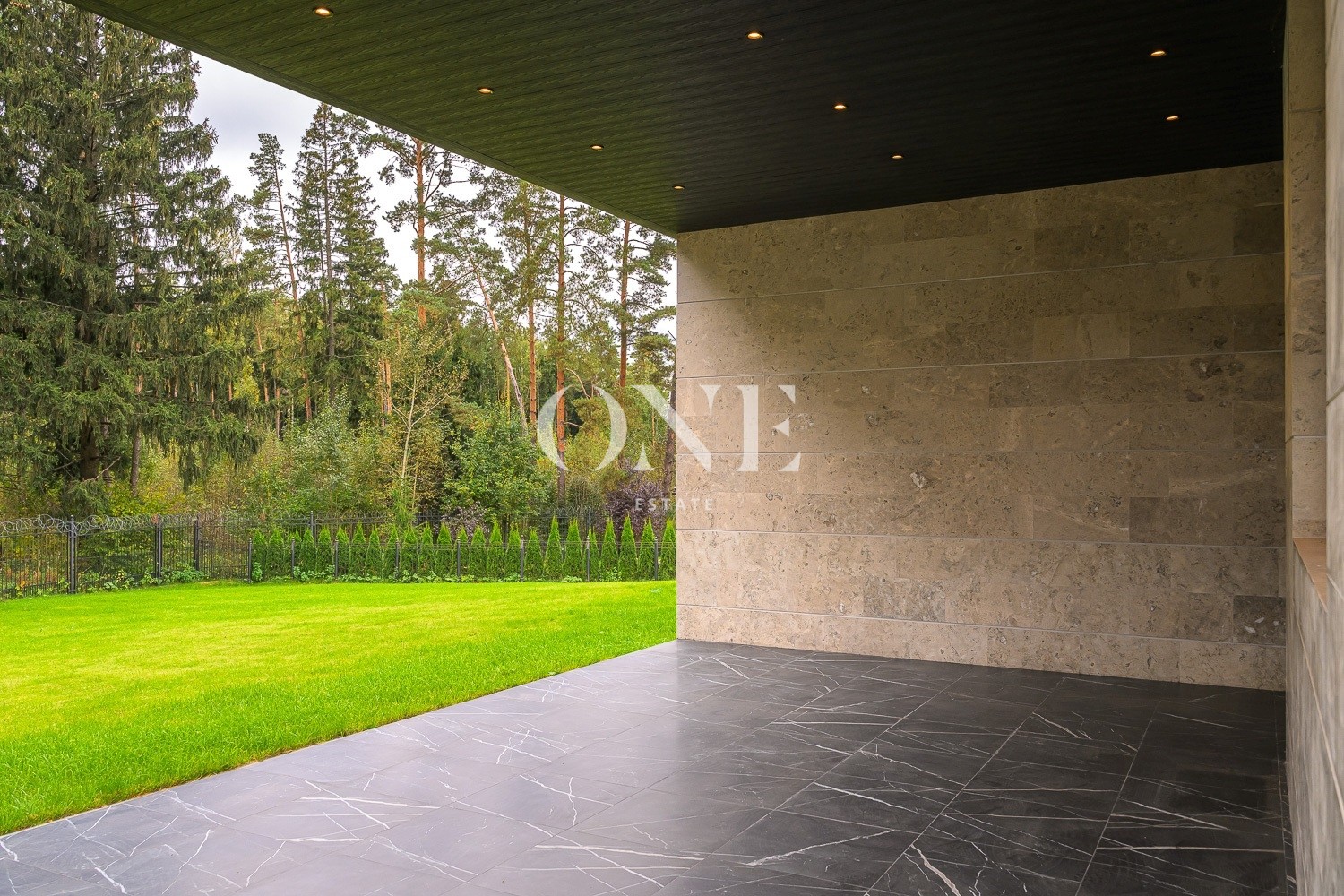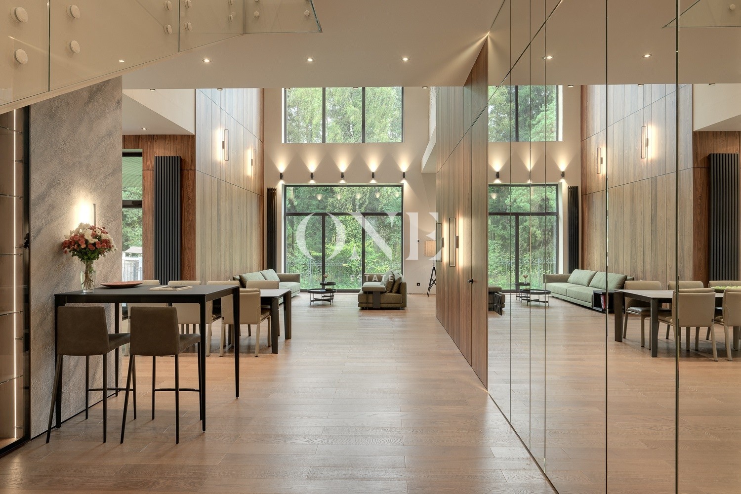 холл, 2 гардеробных, гостиная с дровяным камином, лаунж зона, столовая, зона бара, парадная кухня с островом (с доступом в рабочую кухню), кабинет, блок свободного назначения с санузлом и сауной (может использоваться как игровая, СПА, спортзал, кинотеатр, бильярдная и т.д.), крытая терраса с видом на лес с доступом из кухни и столовой, санузел. гостевой блок (или блок персонала) – 2 спальни, санузел;