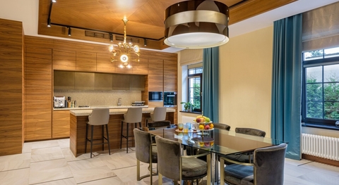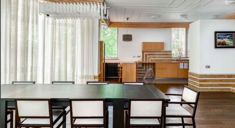 1-й этаж: кухня, столовая-гостиная, библиотека с камином, 2 гостевые спальни, 2 ванных комнаты, SPA- зона - дровяная баня, душевая, комната отдыха;