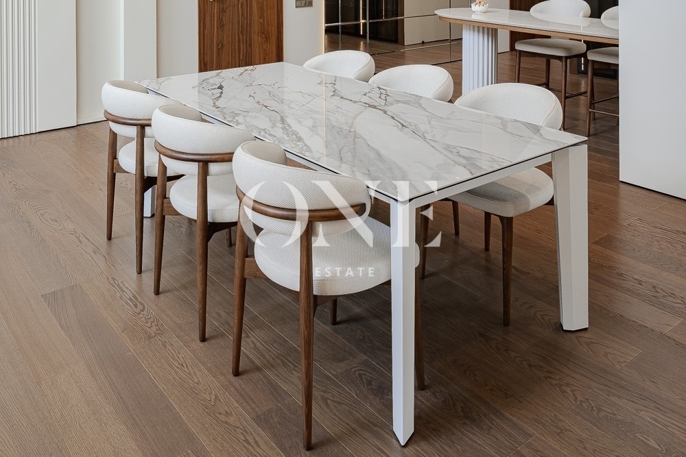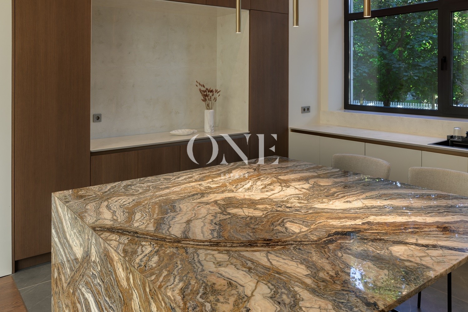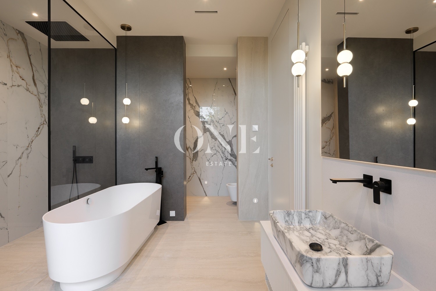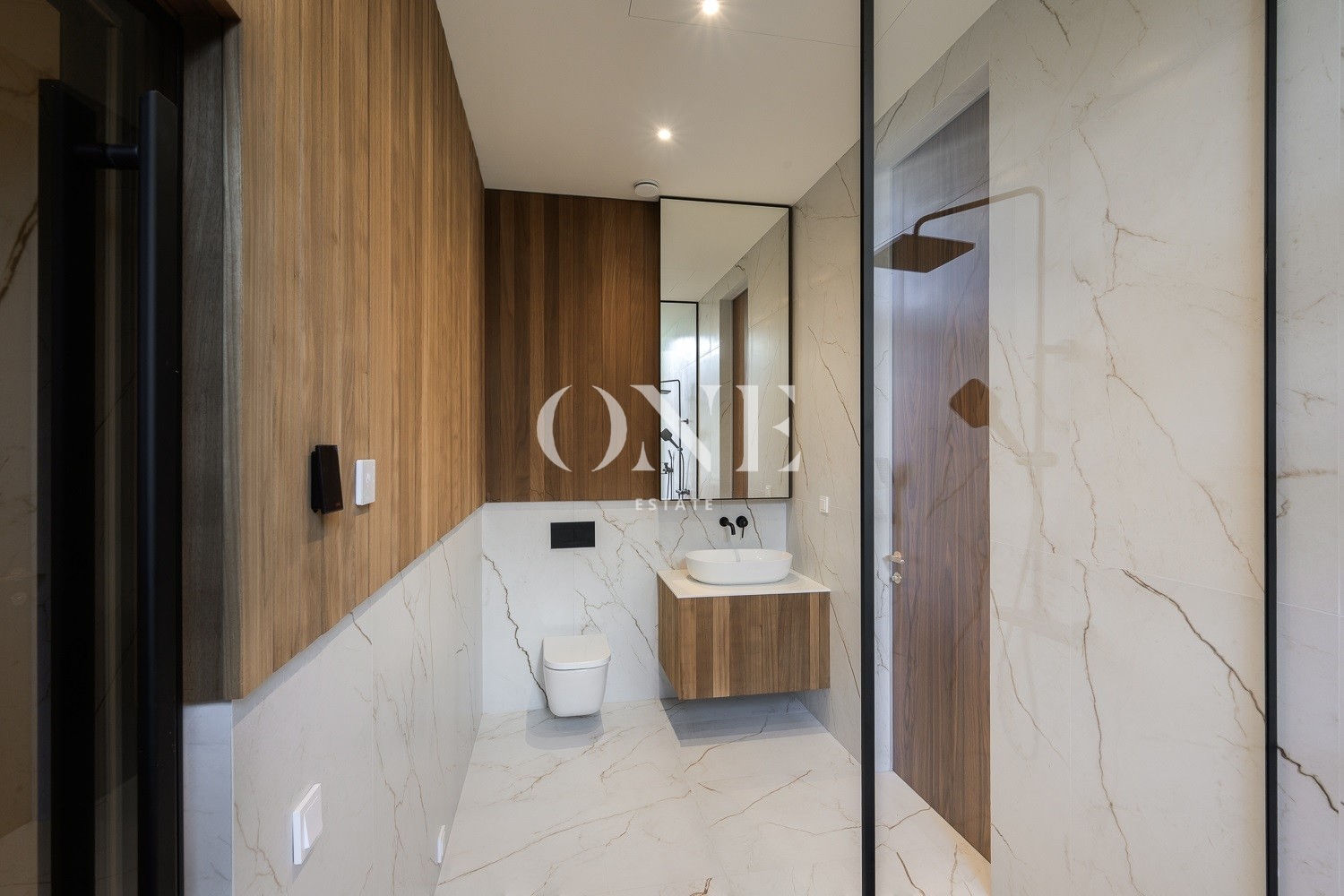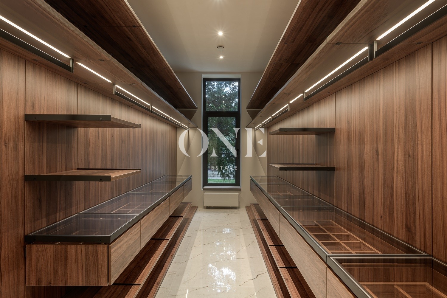 мастер-блок (спальня, две гардеробных, с/у), три детских блока (четкое зонирование, выделяющее кабинет-игровую-гардеробную, детскую и полноценный санузел с окном, ванной, душевой, умывальником, унитазом и биде), прачечная.