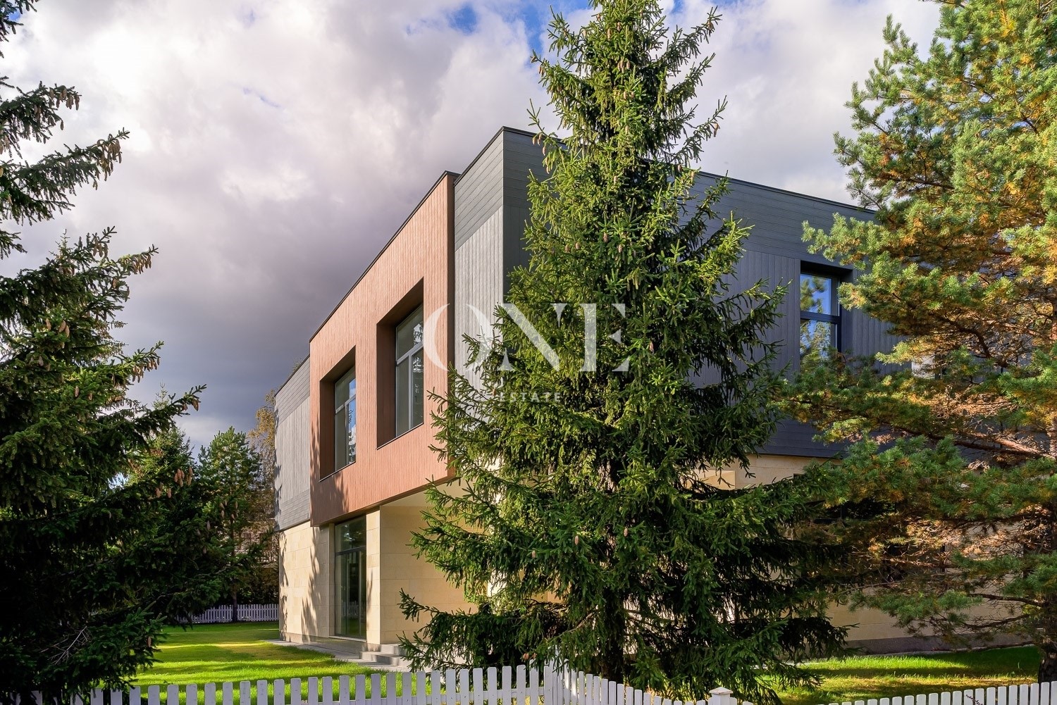 Дом расположен на участке со взрослыми хвойными деревьями (сосны, ели). Посадка дома учитывает соседние дома, до которых более 20м и обеспечивает ощущение приватности и отсутствие ситуации «окна в окна». Все соседние участки застроены. На участке построен гараж с техническими помещениями и квартирой персонала, площадью 123м. Предусмотрена открытая парковка на 5 машиномест.