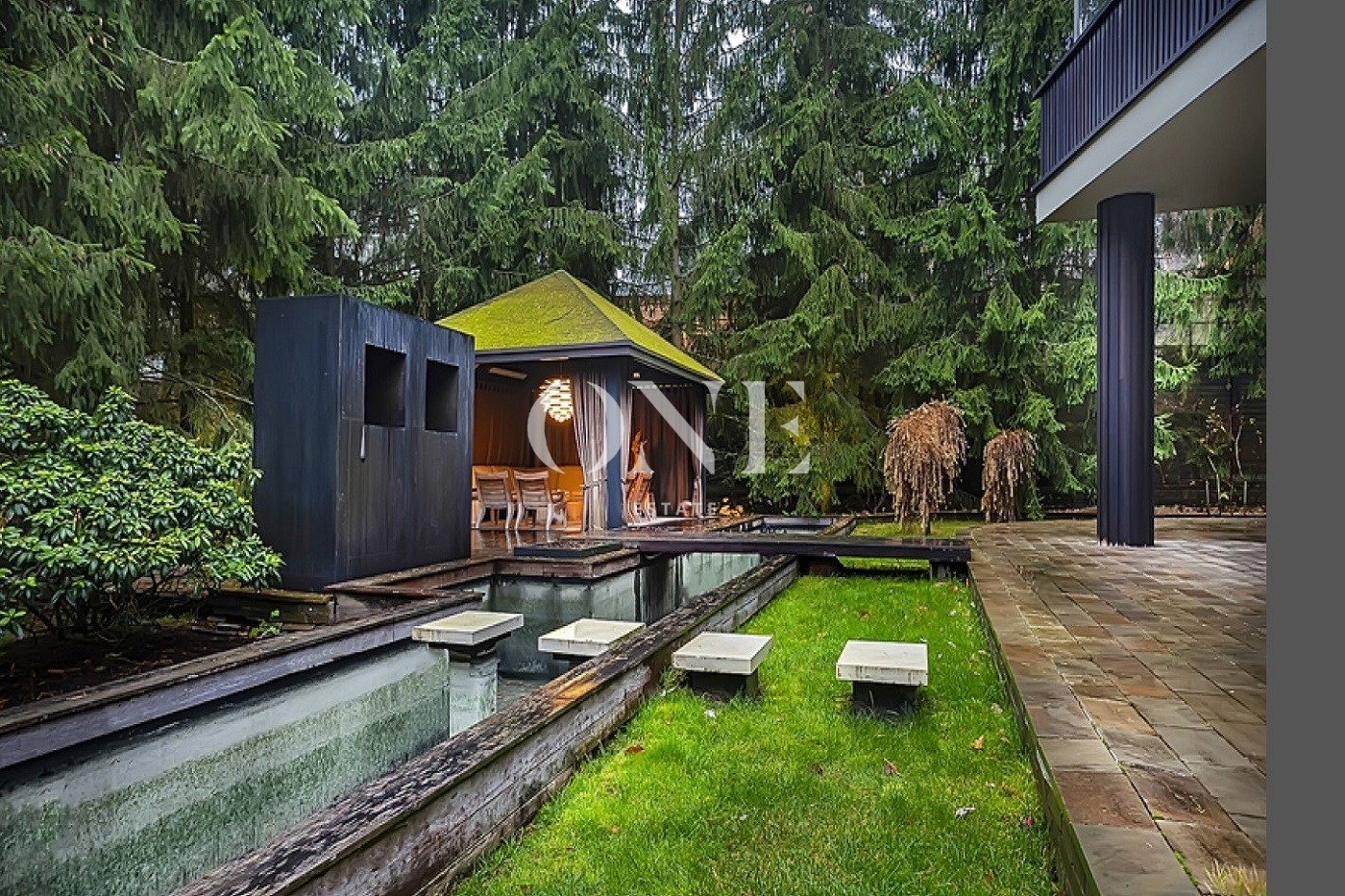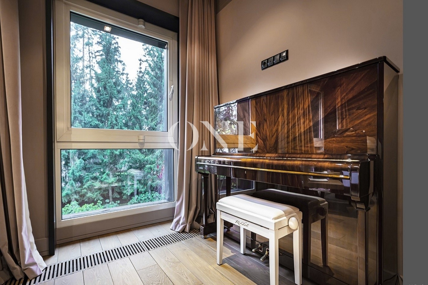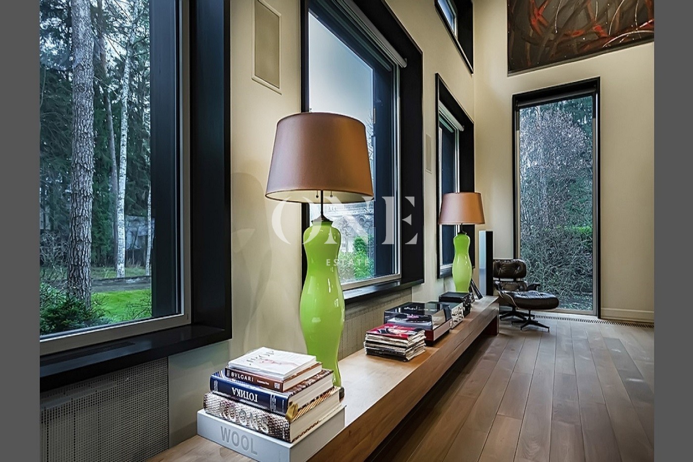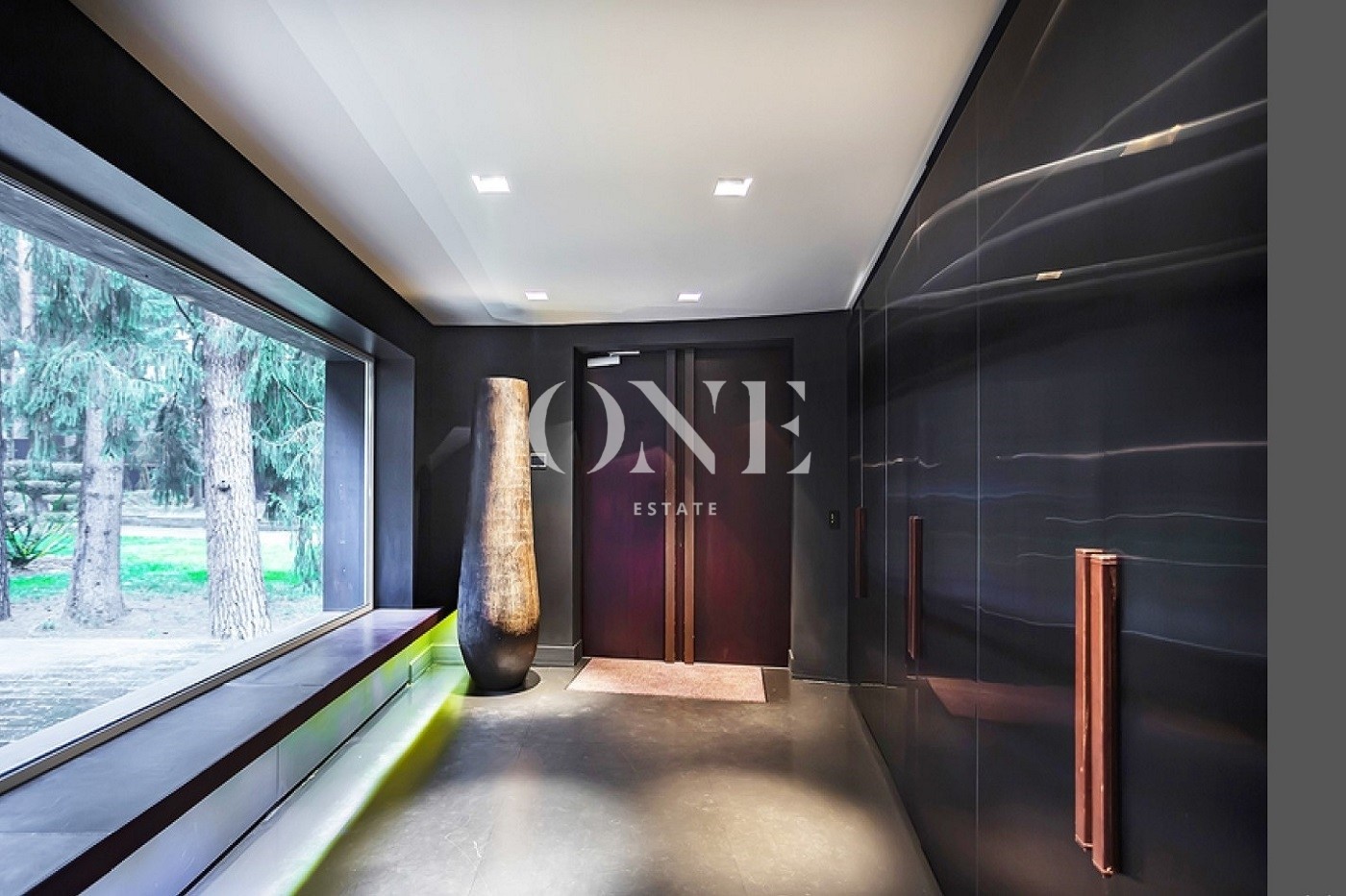 Дом в современном стиле на живописном участке с вековыми соснами в КП Сады Майендорф. На участке выполнен ландшафтный дизайн. Планировка предусматривает: цокольный этаж: холл, бассейн, сауна, хамам, тренажерный зал, кухня, постирочная, квартира для персонала. 1 Этаж: прихожая, гардеробная, каминный зал, кабинет, кухня, столовая, с/у. 2 Этаж: холл, 3 спальни, 3 гардеробные, 3 ванные комнаты. Мансарда: холл, 2 спальни, 2 с/у.