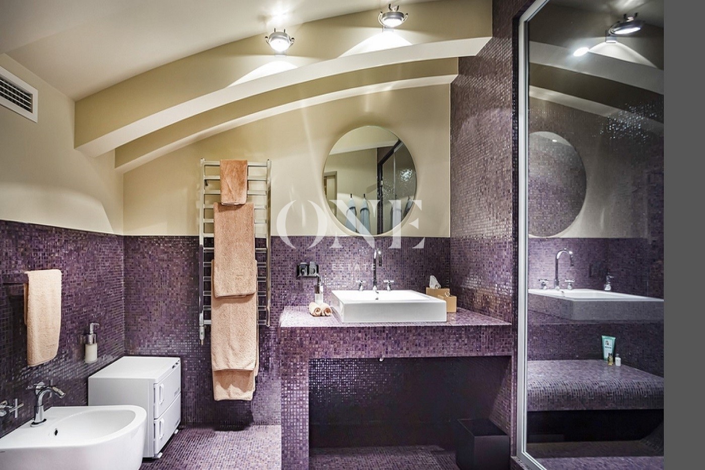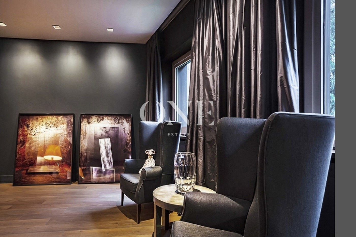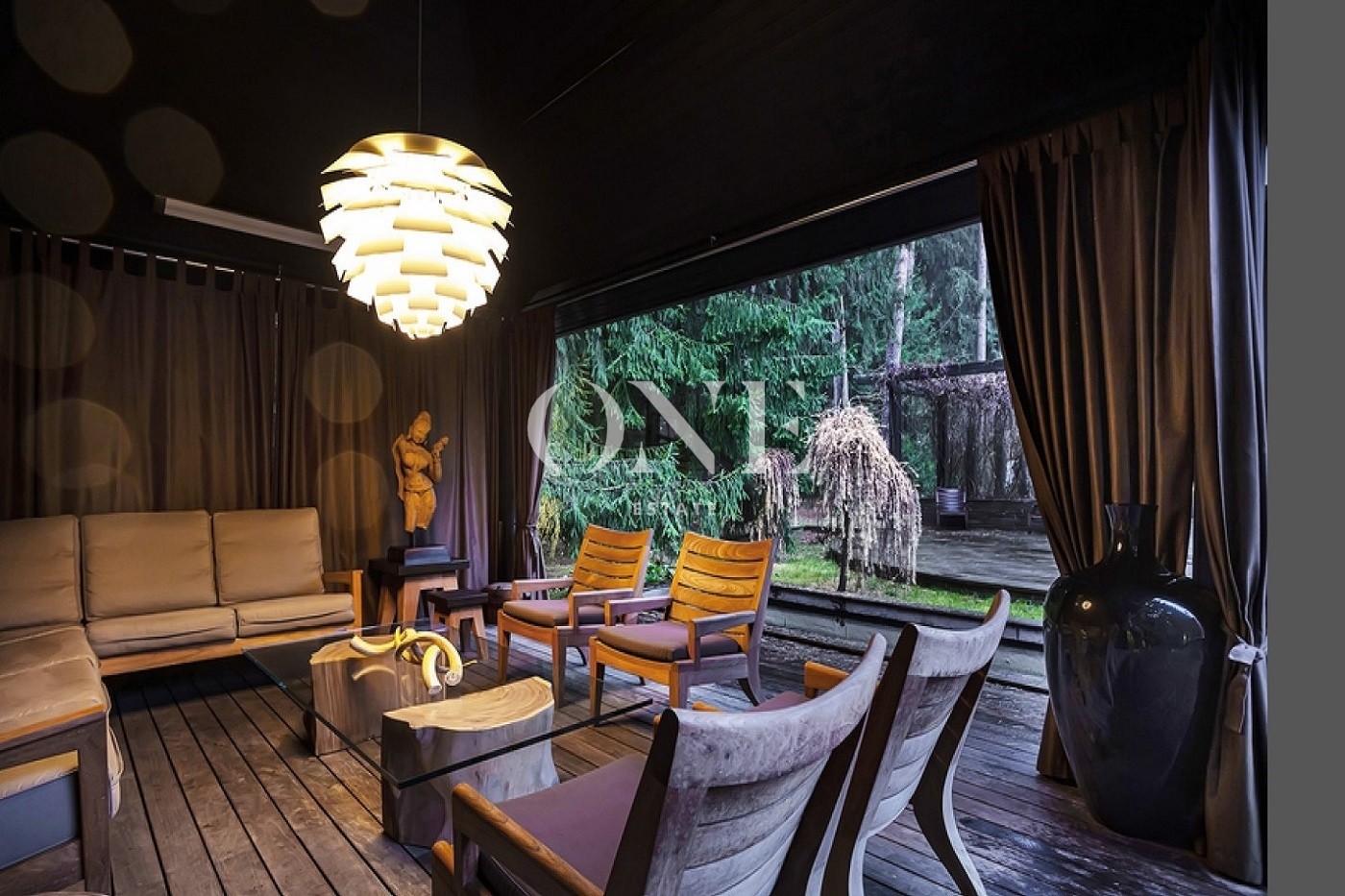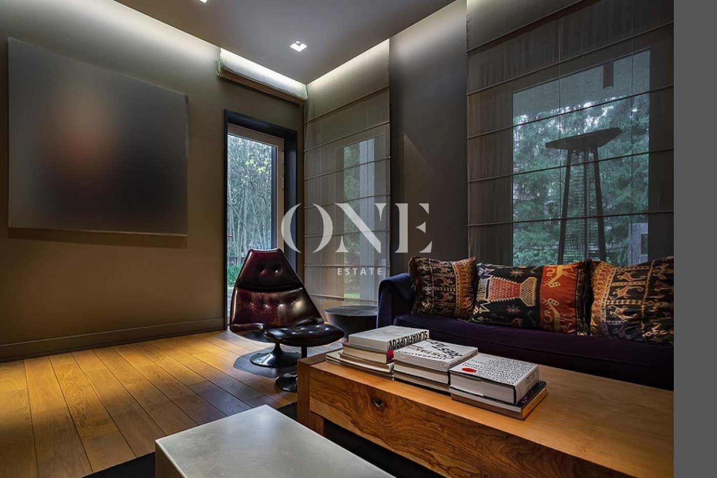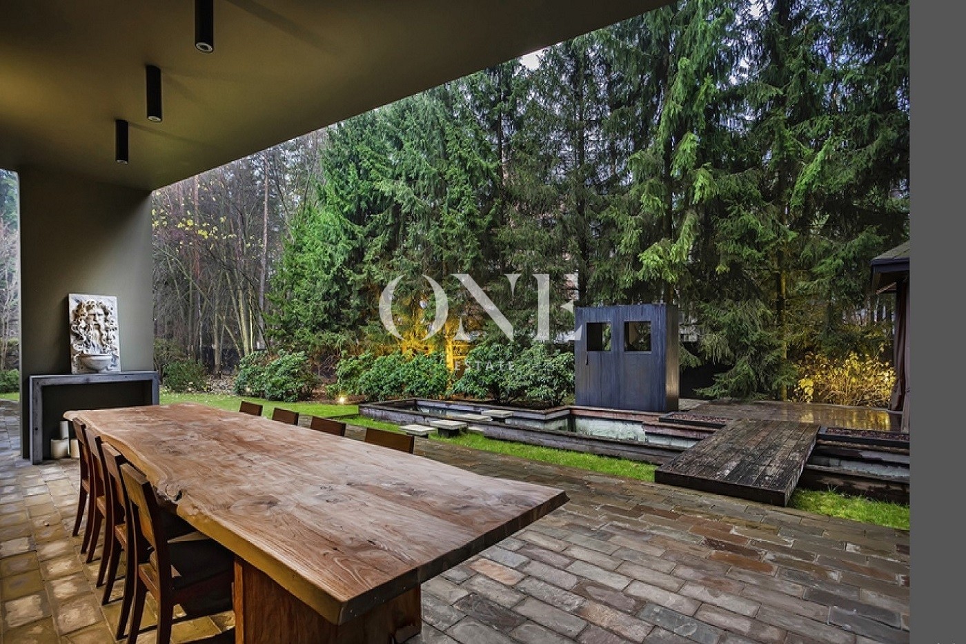 Дом в современном стиле на живописном участке с вековыми соснами в КП Сады Майендорф. На участке выполнен ландшафтный дизайн. Планировка предусматривает: цокольный этаж: холл, бассейн, сауна, хамам, тренажерный зал, кухня, постирочная, квартира для персонала. 1 Этаж: прихожая, гардеробная, каминный зал, кабинет, кухня, столовая, с/у. 2 Этаж: холл, 3 спальни, 3 гардеробные, 3 ванные комнаты. Мансарда: холл, 2 спальни, 2 с/у.