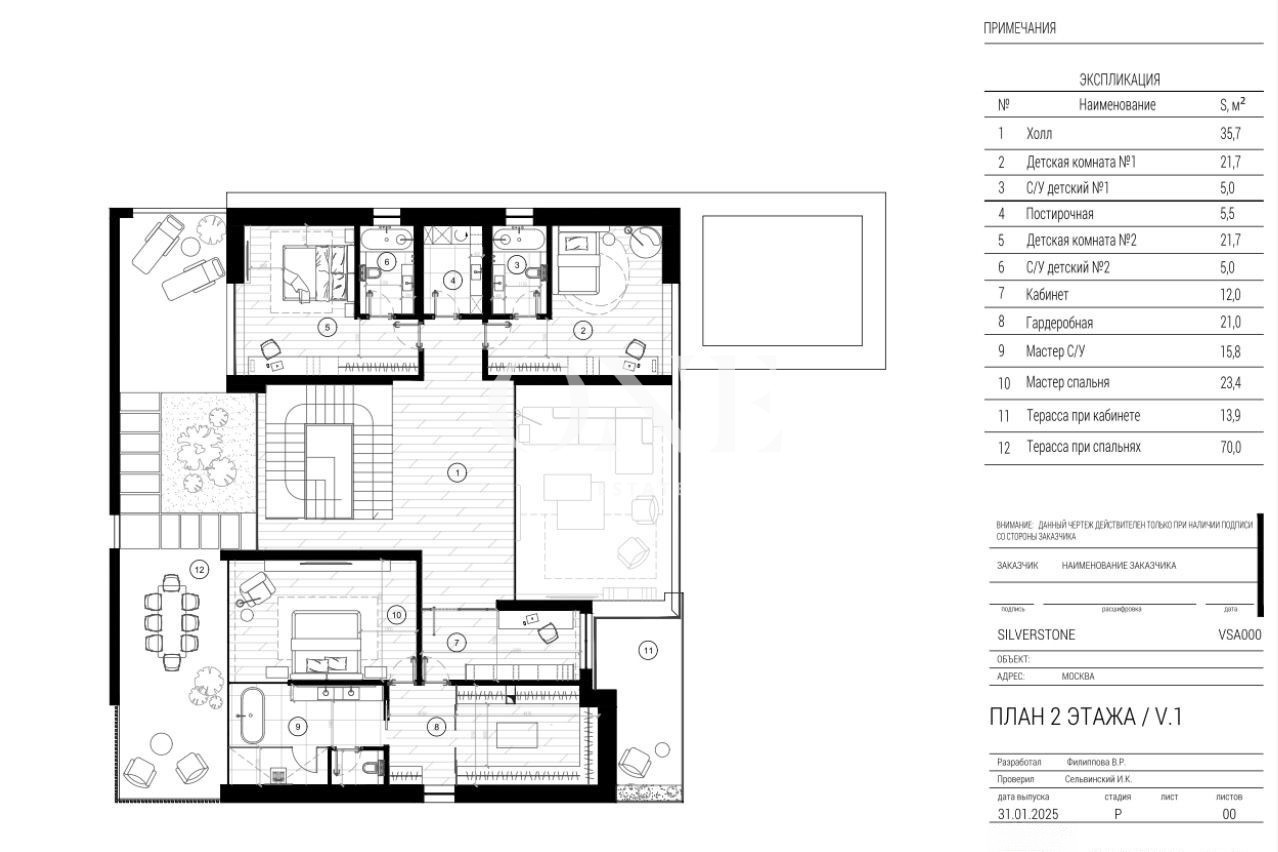 холл, гардеробная, мастер-спальня со своей гардеробной, с/у и кабинетом, терраса при спальне, постирочная, 2 детских со своими с/у.