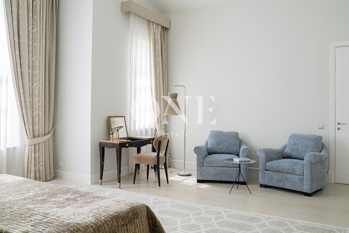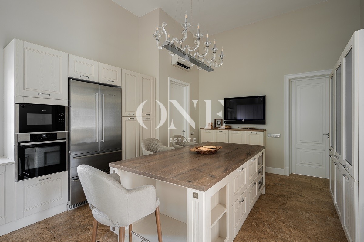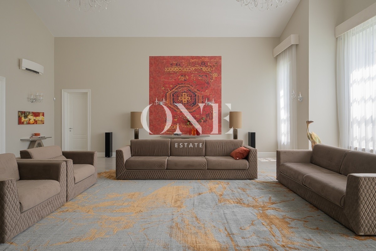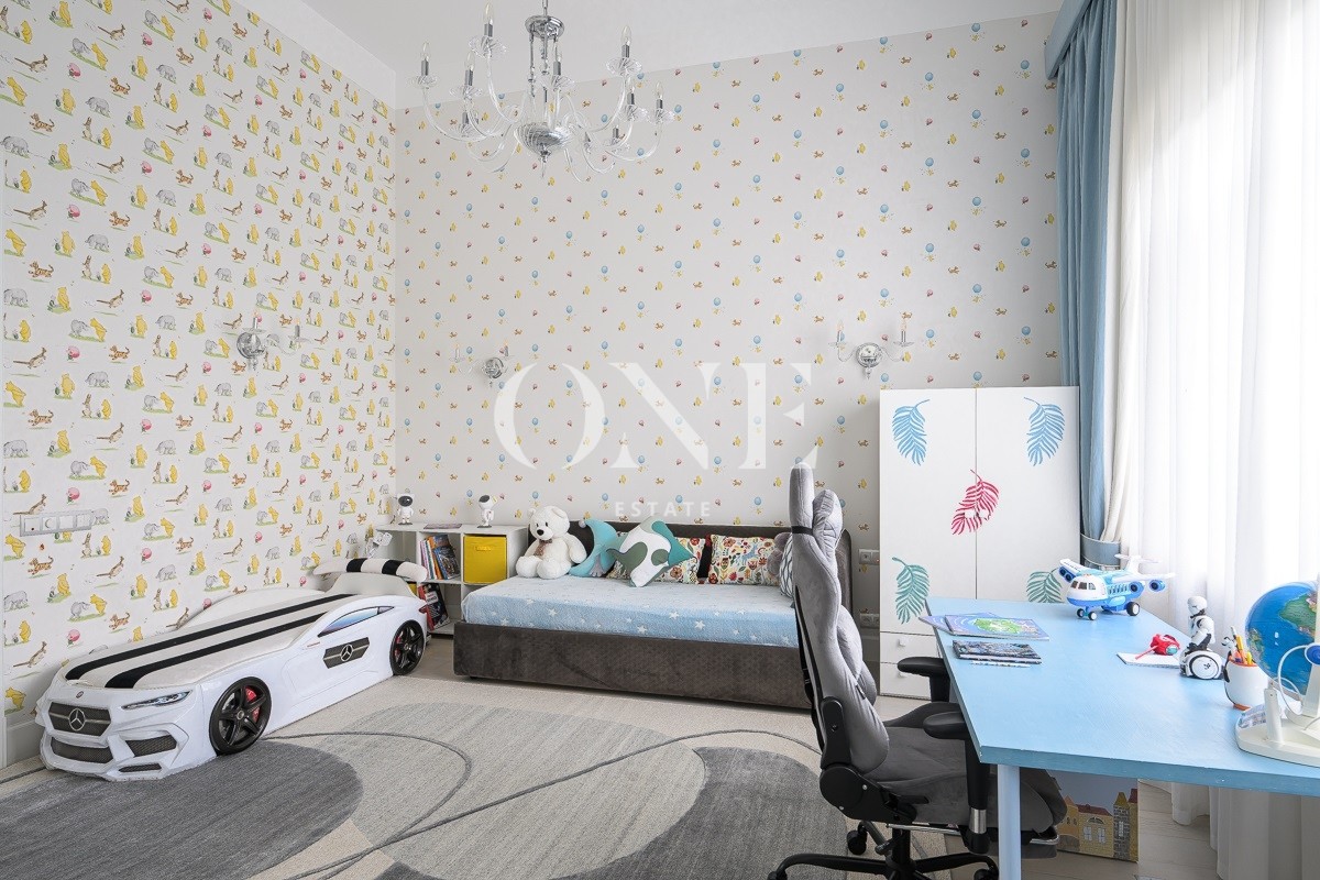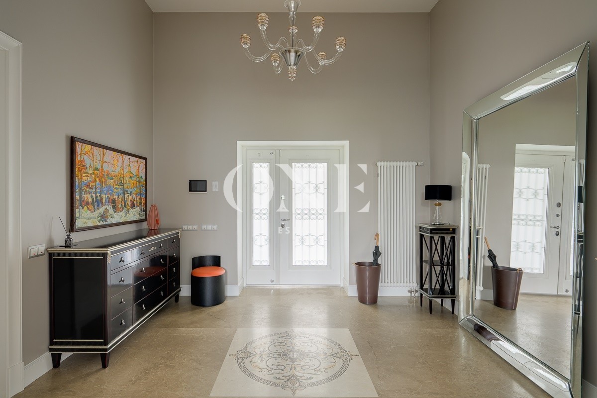 Одноэтажный дом вдохновляет своей монументальностью: высота потолков от 4 до 6 метров добавляет объёма и воздушности, а высококачественные отделочные материалы — мрамор, травертин и натуральное дерево — подчеркивают статус и утончённый вкус владельцев. Внутреннее пространство включает пять комнат, среди которых — просторная гостиная, столовая и кухня, а также кабинет для работы и постирочная. Особое внимание уделено зоне отдыха: мастер-спальня с собственной ванной комнатой и гардеробной, две детские спальни с отдельными гардеробными и санузлами создают комфортные условия для всей семьи.