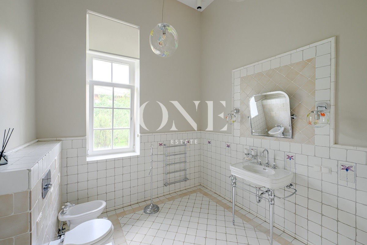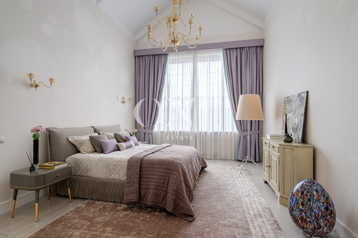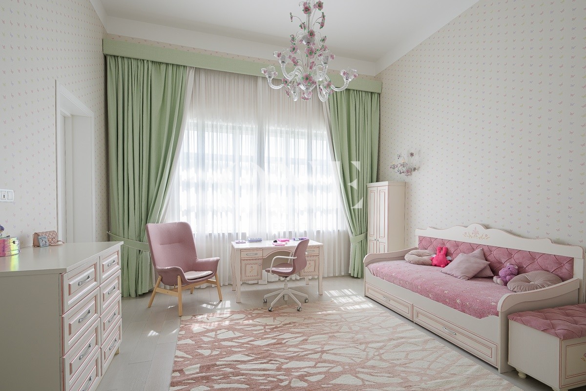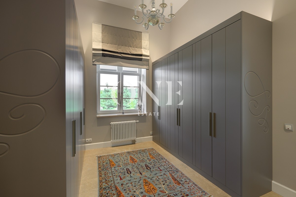 Одноэтажный дом вдохновляет своей монументальностью: высота потолков от 4 до 6 метров добавляет объёма и воздушности, а высококачественные отделочные материалы — мрамор, травертин и натуральное дерево — подчеркивают статус и утончённый вкус владельцев. Внутреннее пространство включает пять комнат, среди которых — просторная гостиная, столовая и кухня, а также кабинет для работы и постирочная. Особое внимание уделено зоне отдыха: мастер-спальня с собственной ванной комнатой и гардеробной, две детские спальни с отдельными гардеробными и санузлами создают комфортные условия для всей семьи.