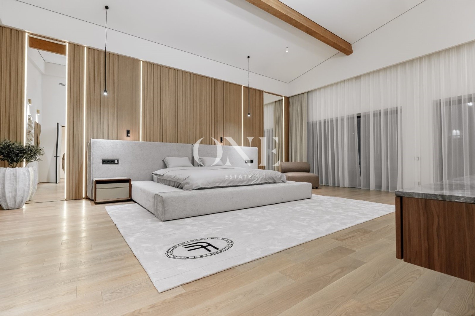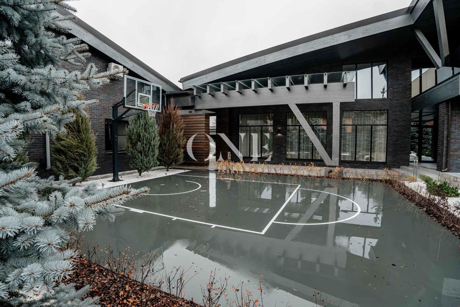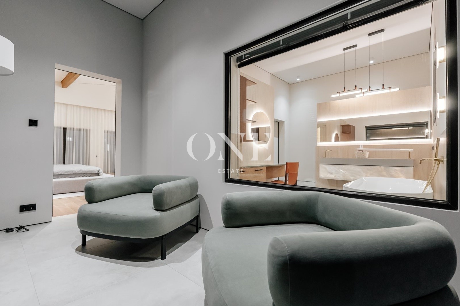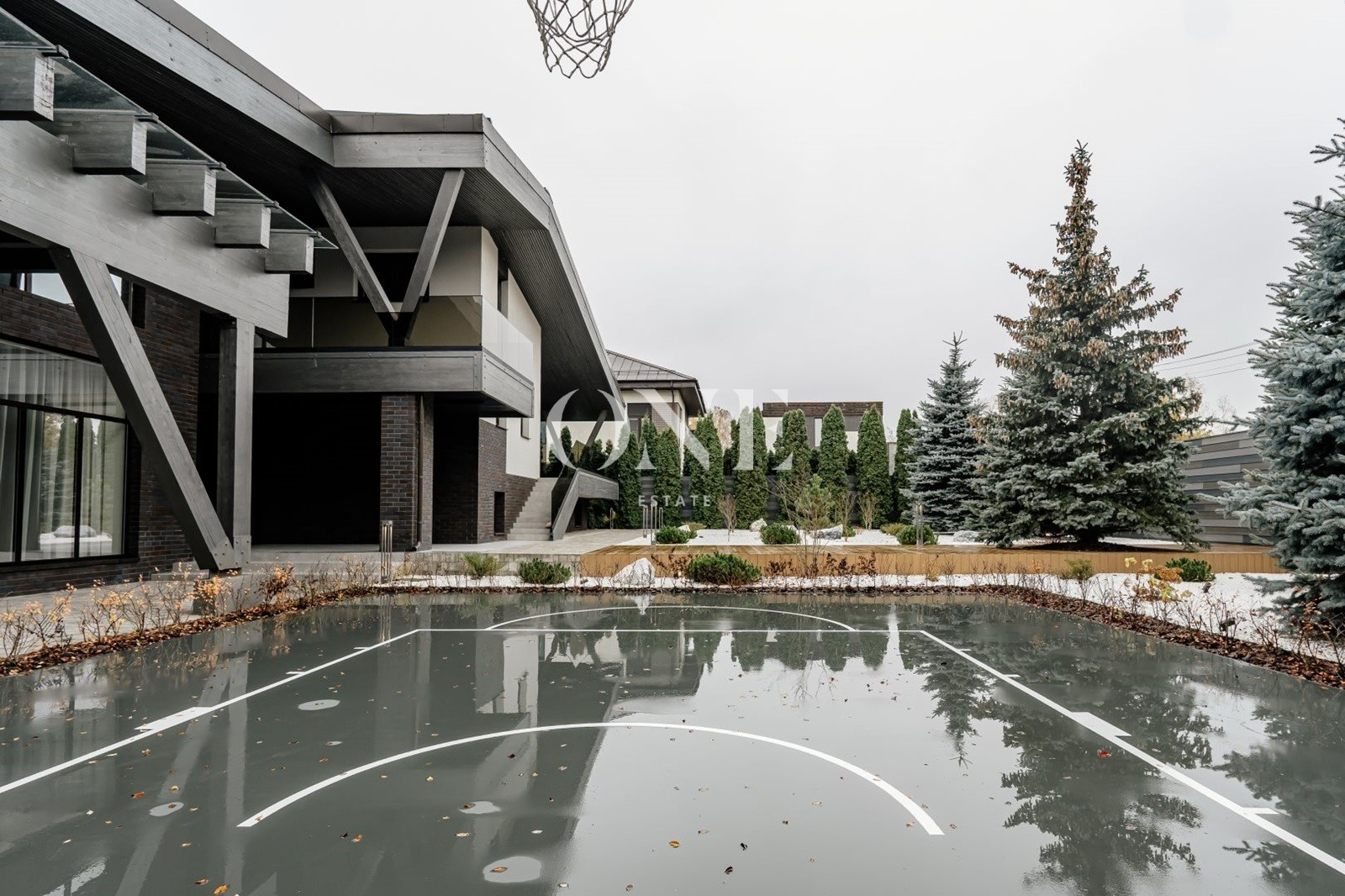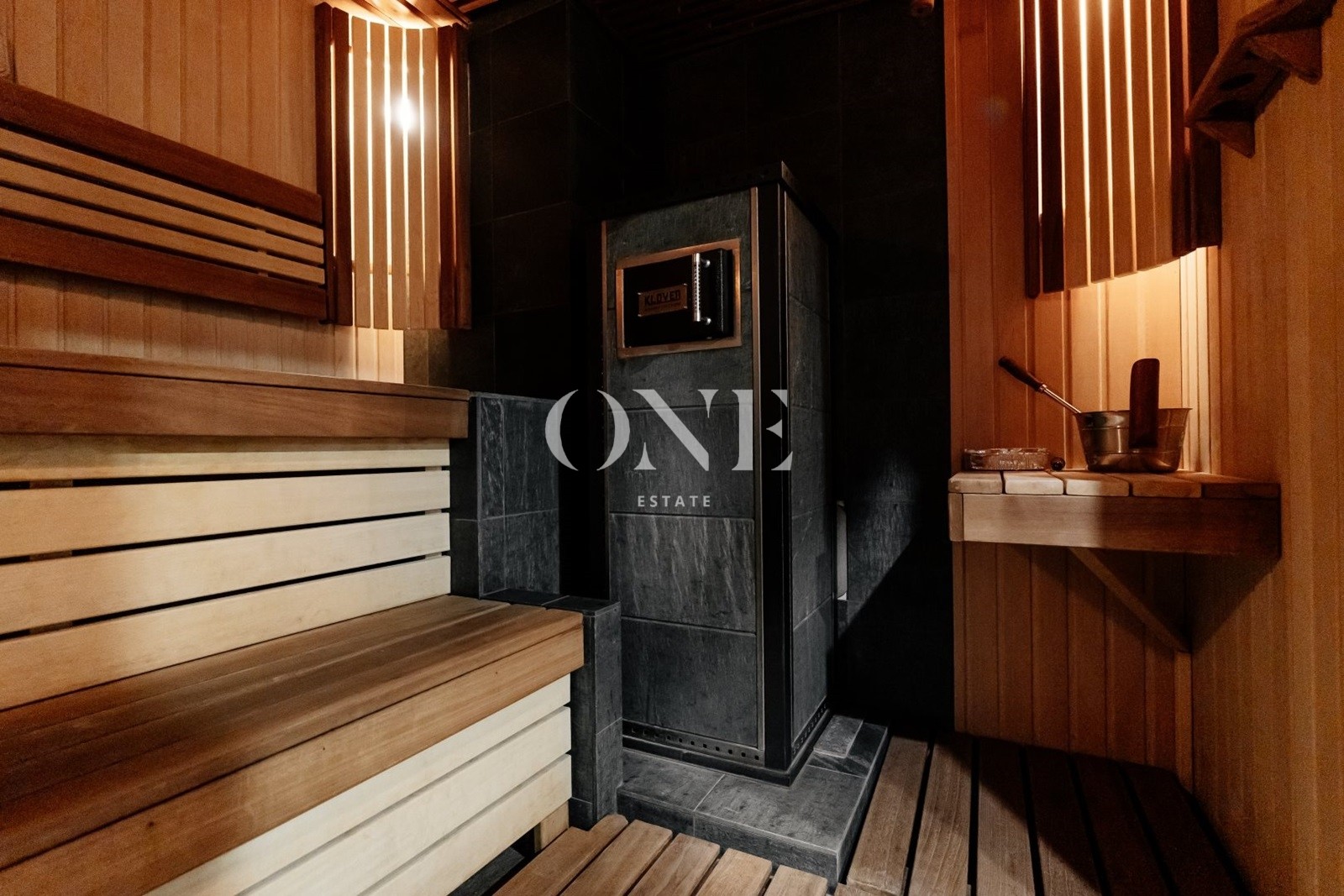 В доме предусмотрены 4 мастер-спальни, просторная гостиная с библиотекой, современный спортзал, стильный бар с кинотеатром, гараж с подогревом пола, а также отдельный SPA-комплекс с хамамом и дровяной баней.
