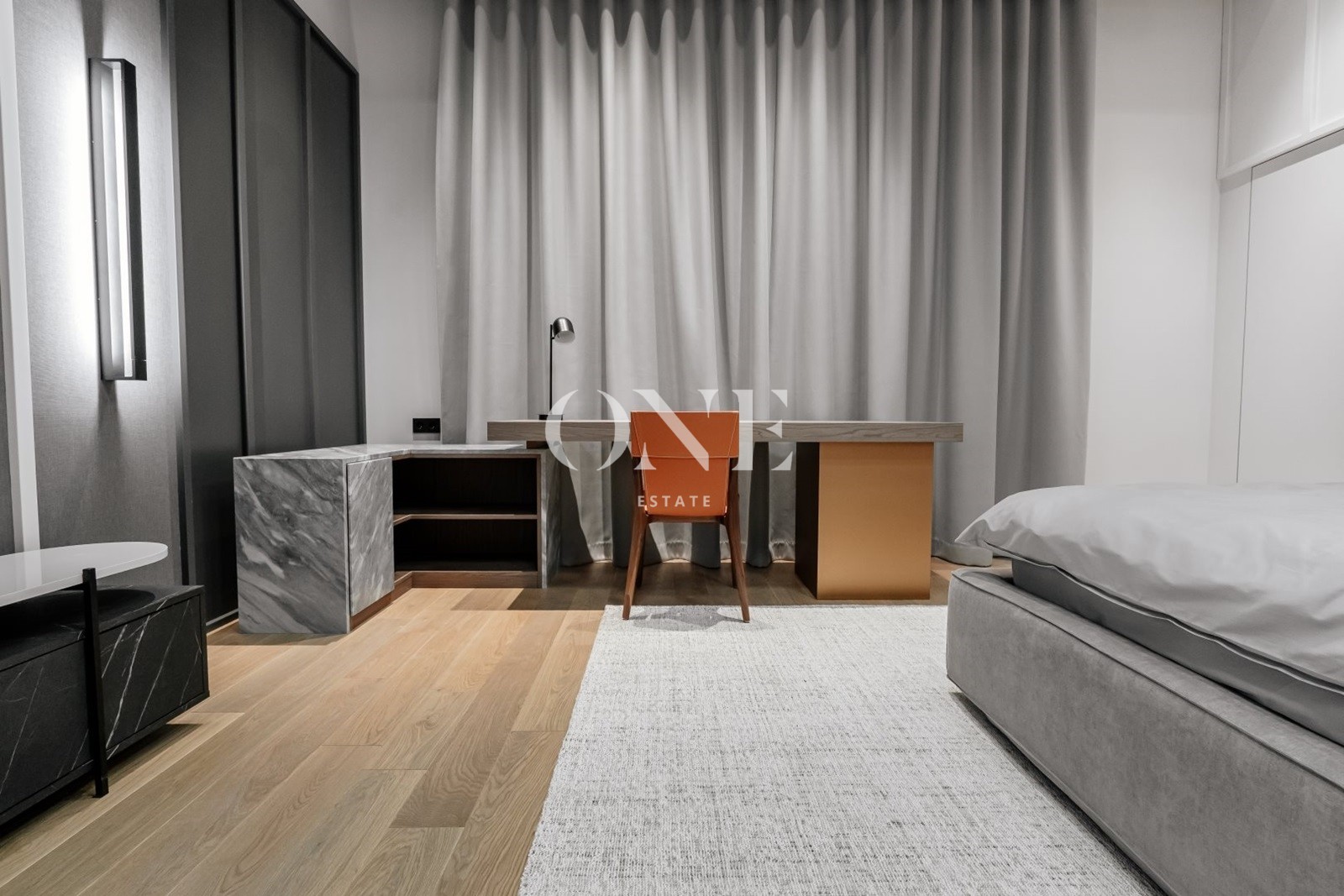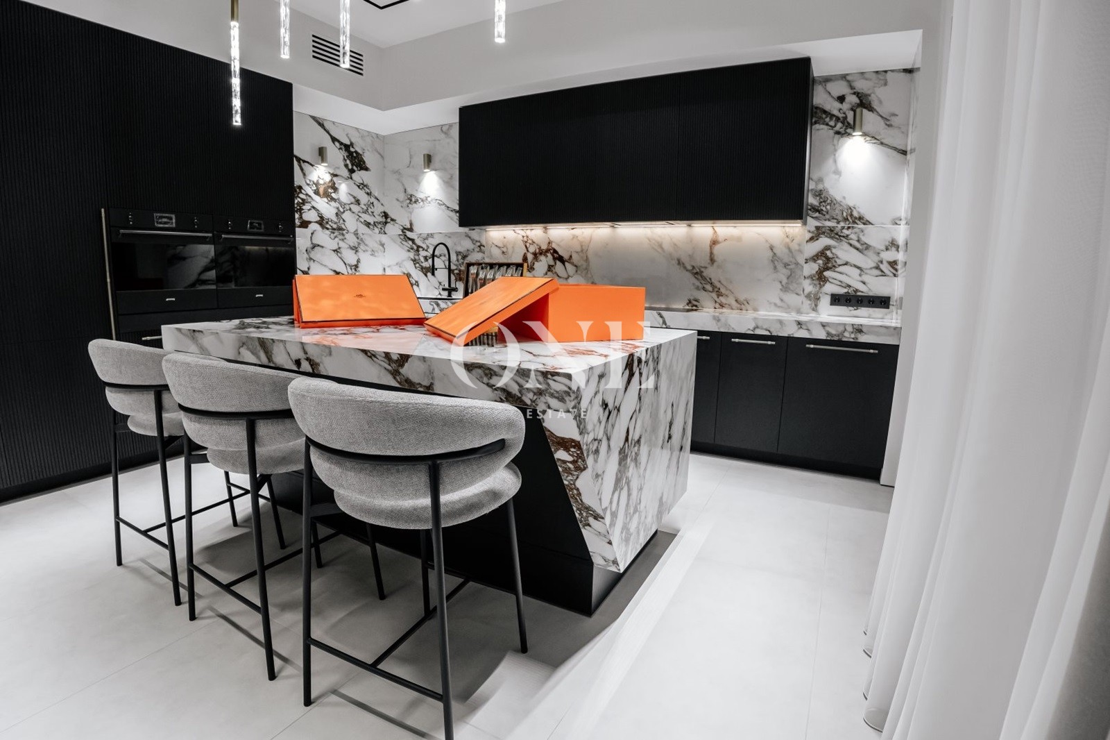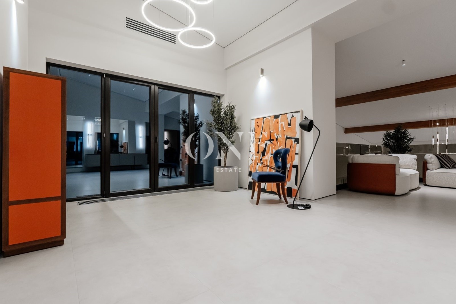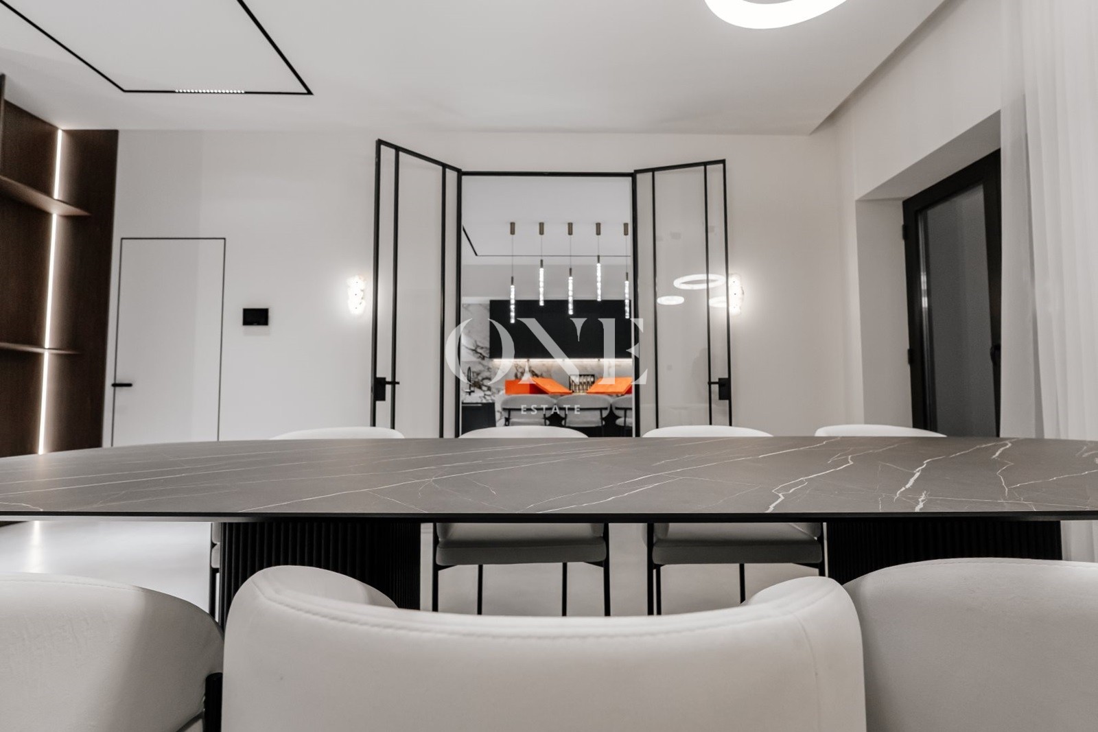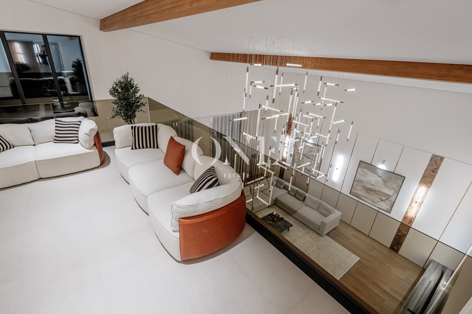 В доме предусмотрены 4 мастер-спальни, просторная гостиная с библиотекой, современный спортзал, стильный бар с кинотеатром, гараж с подогревом пола, а также отдельный SPA-комплекс с хамамом и дровяной баней.