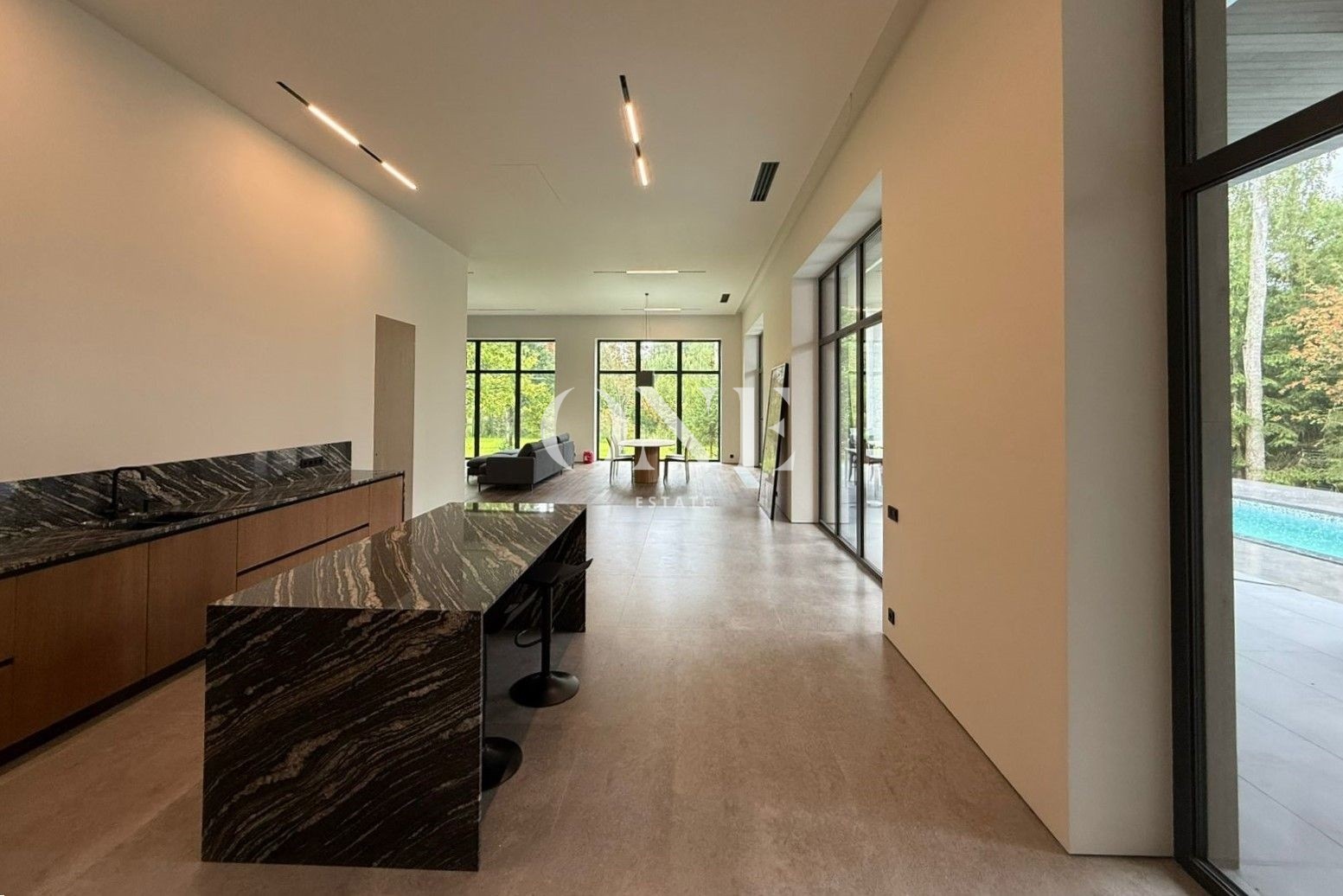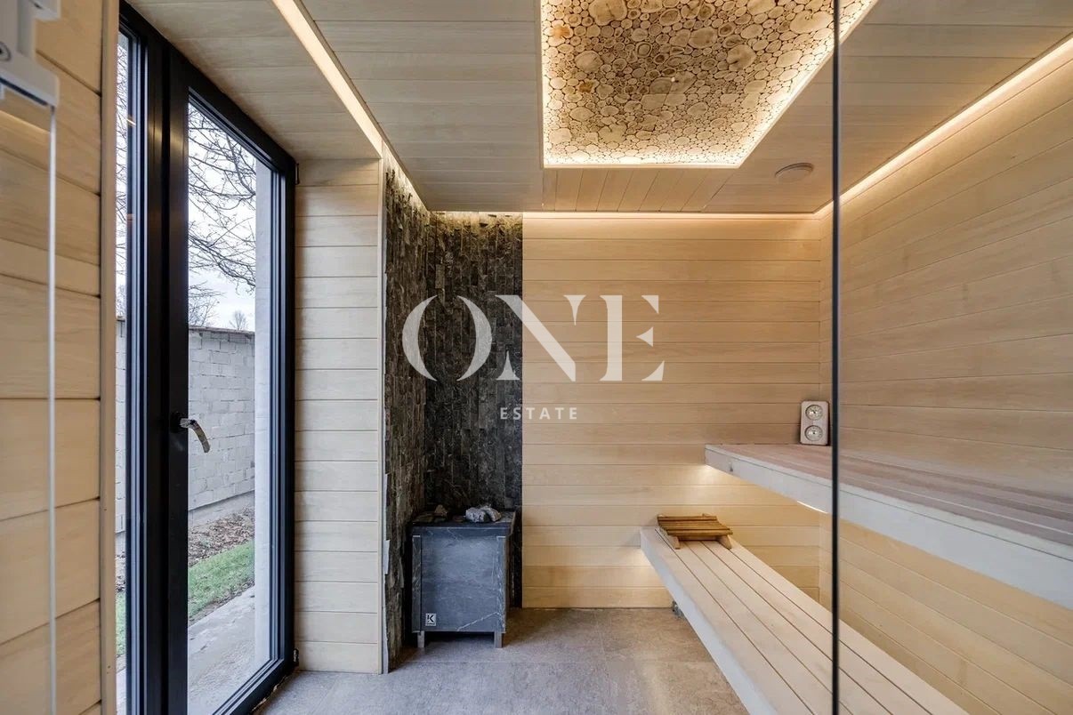 холл, гардеробная, гостиная, кухня-столовая, с/у, мастер-спальня со своей гардеробной и 2-мя с/у, 3 спальни, 2 с/у, СПА-зона: сауна, комната отдыха, душевая, уличный бассейн; котельная, блок для персонала со своим входом: гардеробная, гостиная, кухня, спальня, постирочная.