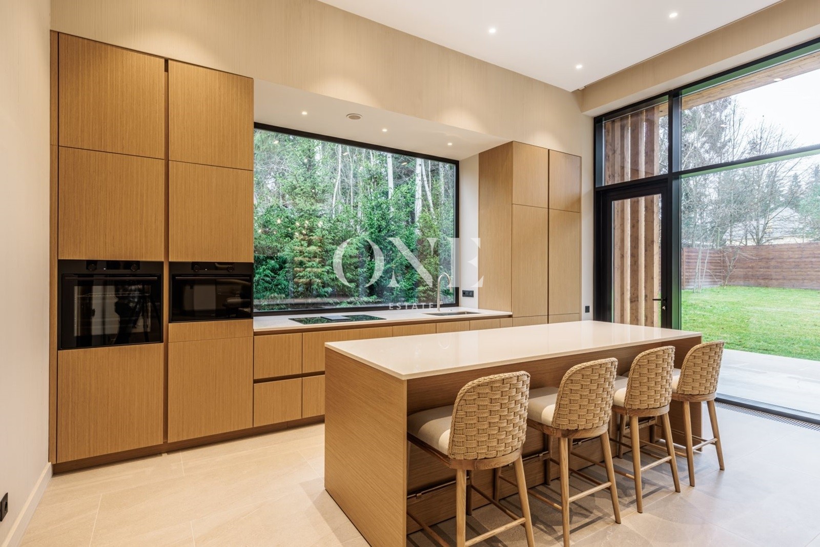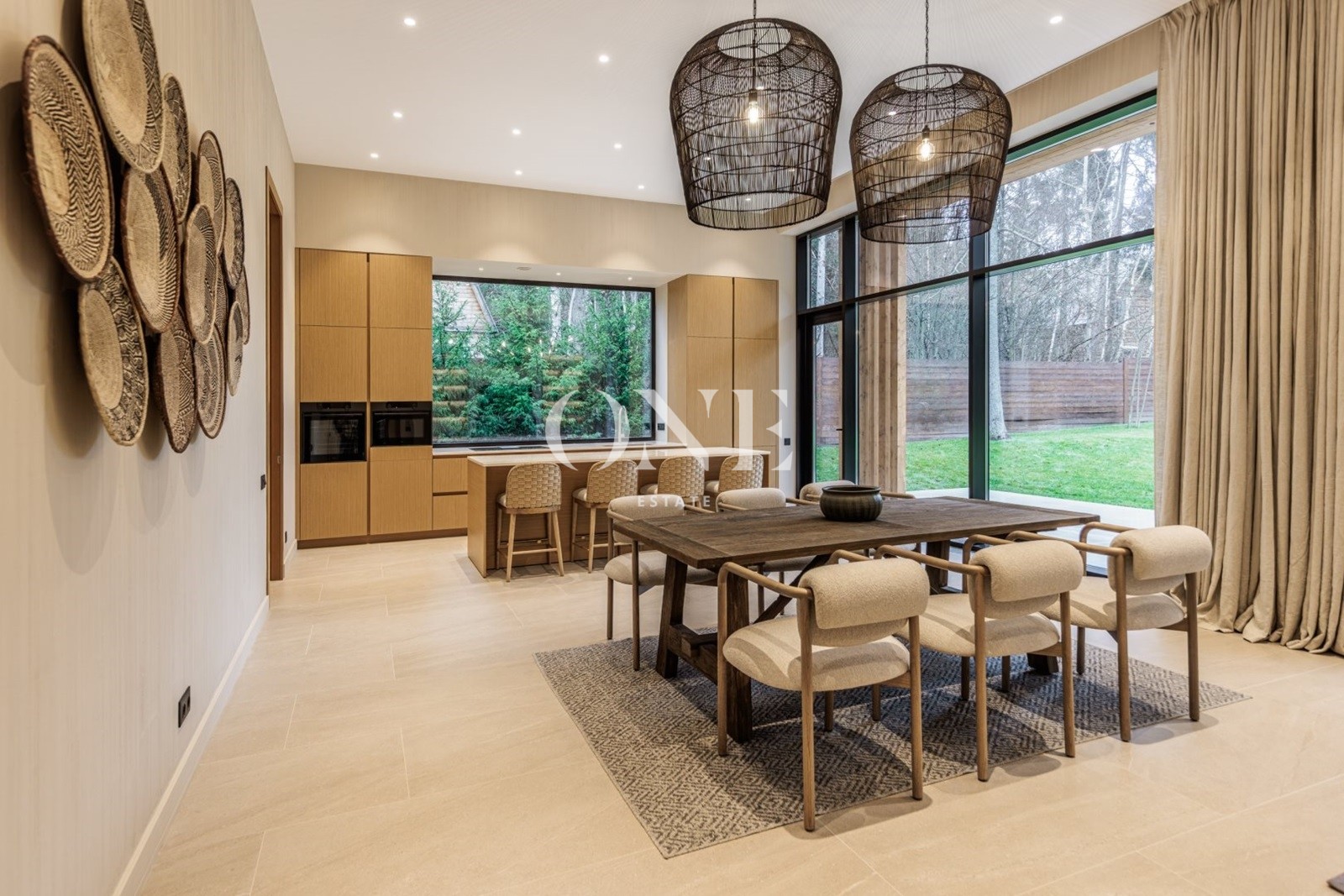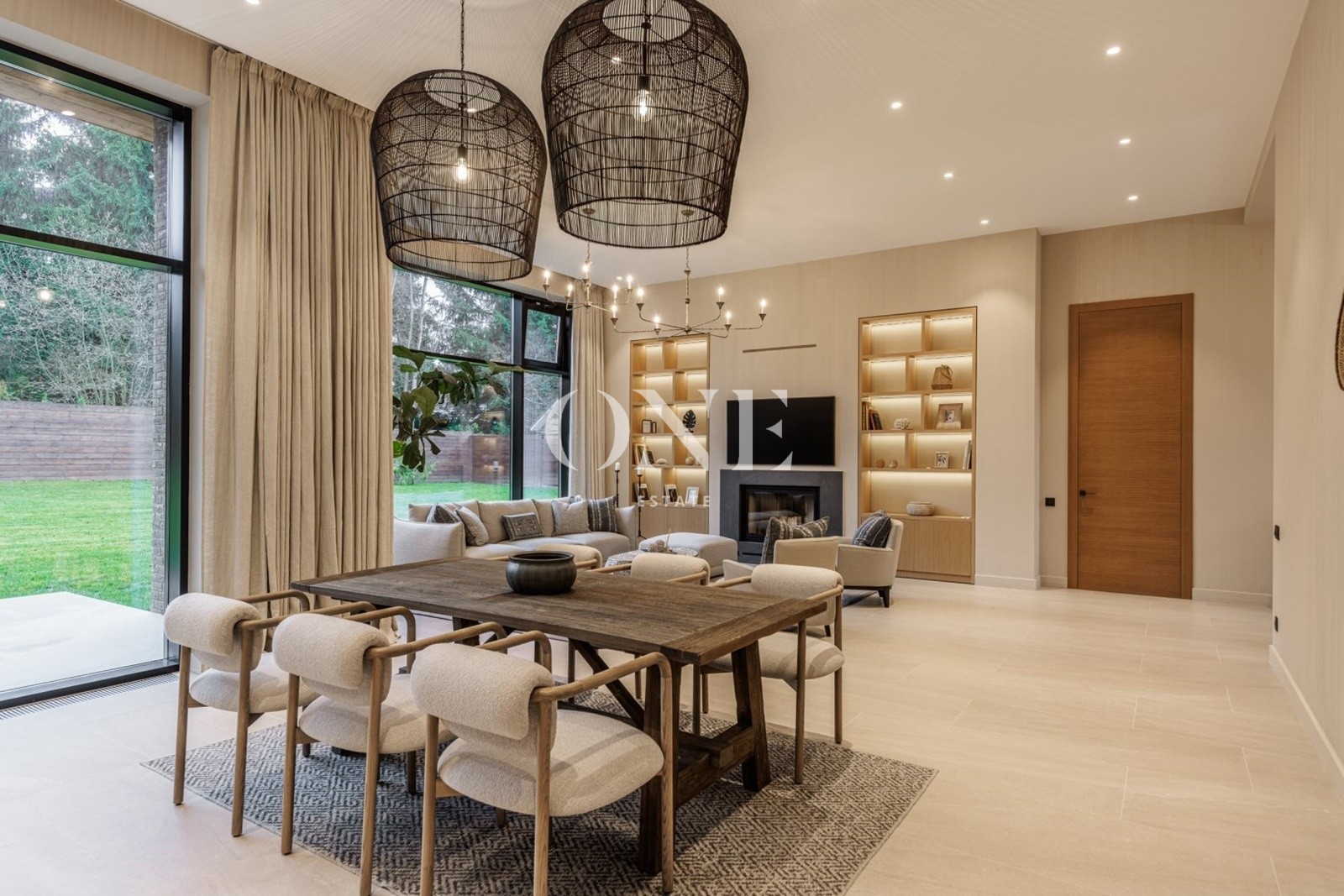 кухня-гостиная - общей площадью 80 м2 (потолок 4 метра) включает в себя диванную зону с дровяным камином, встроенную кухню с островом и обеденной зоной и выходом на крытую террасу 27 м2.