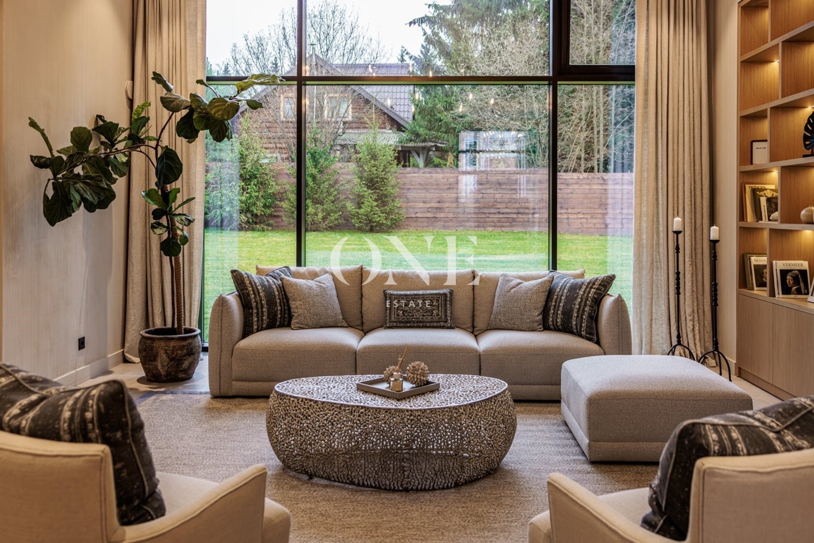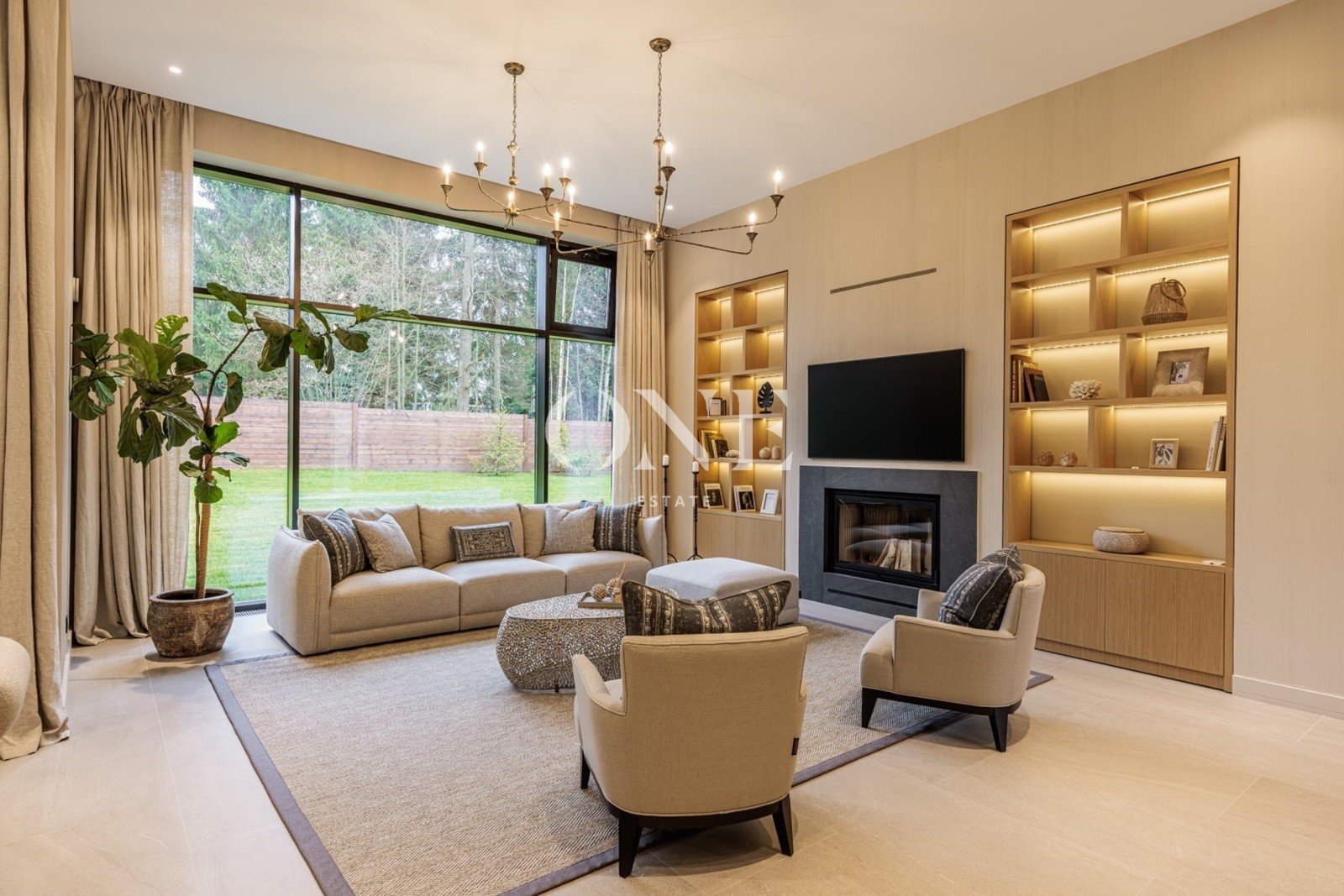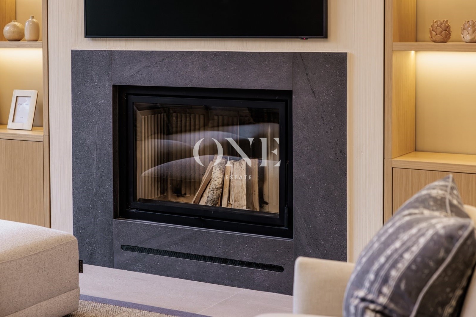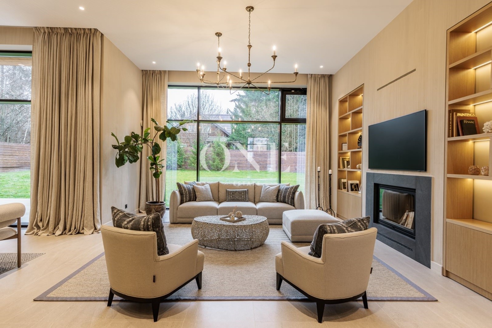 кухня-гостиная - общей площадью 80 м2 (потолок 4 метра) включает в себя диванную зону с дровяным камином, встроенную кухню с островом и обеденной зоной и выходом на крытую террасу 27 м2.